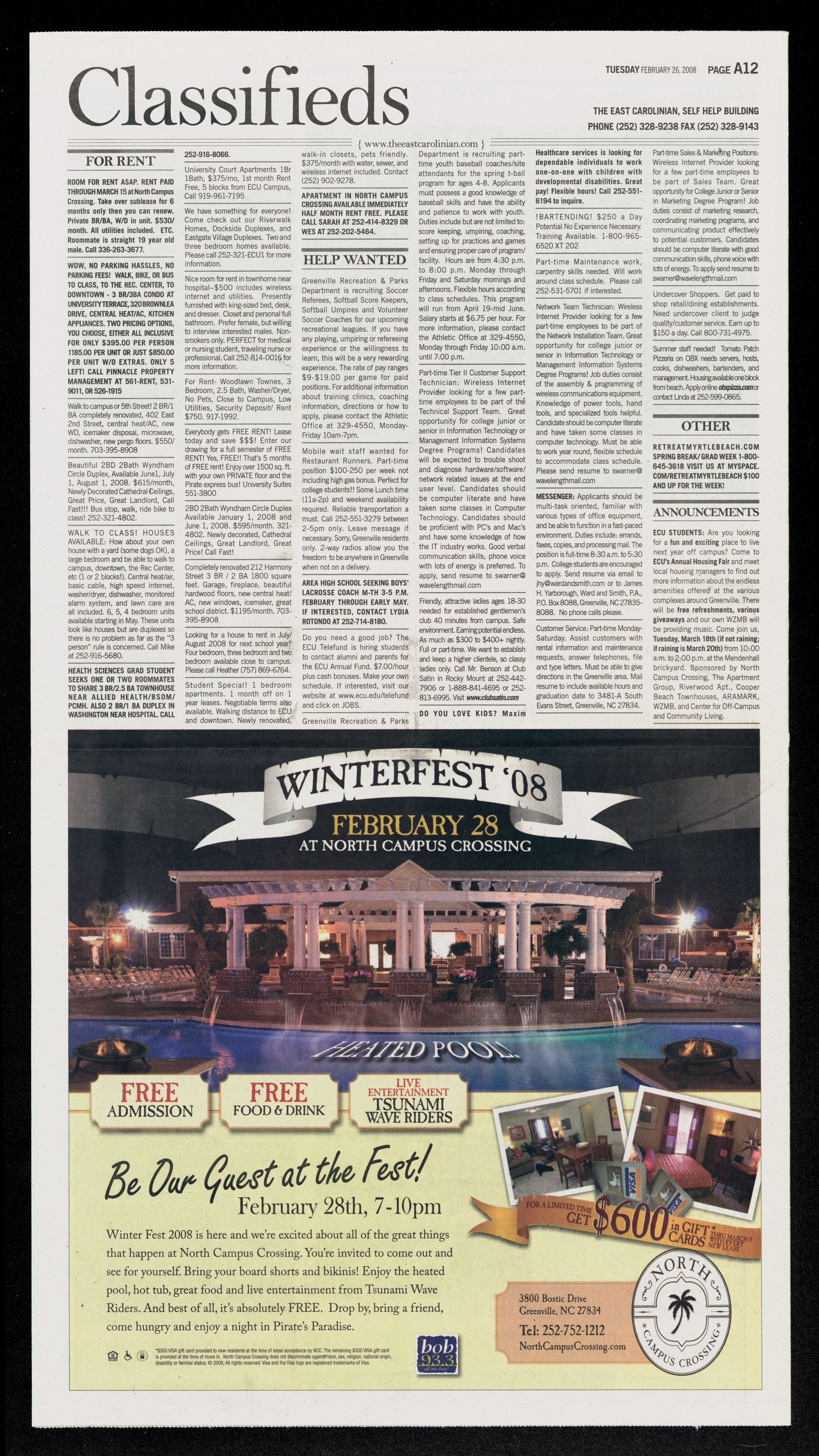 management. Housing available one block