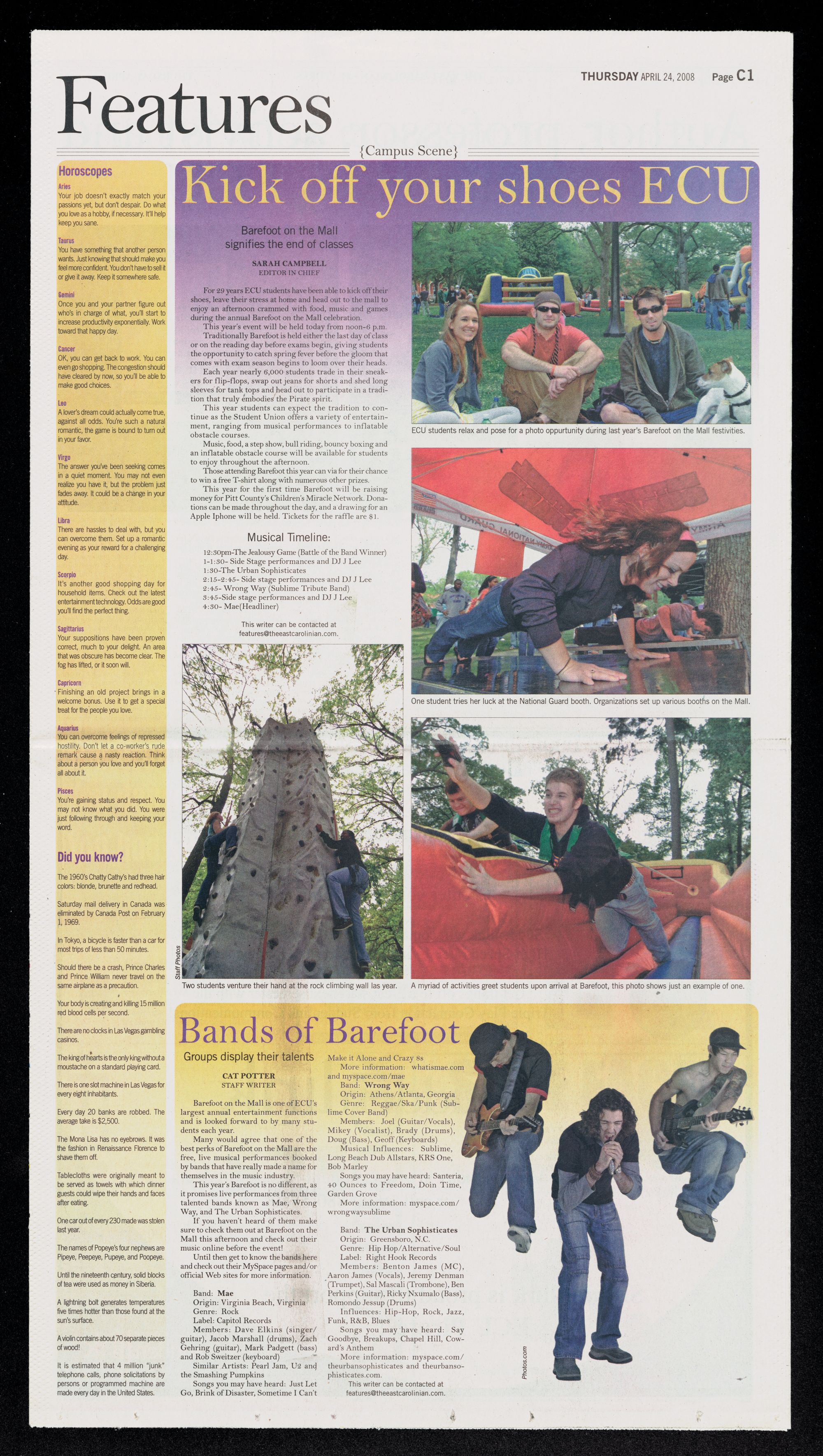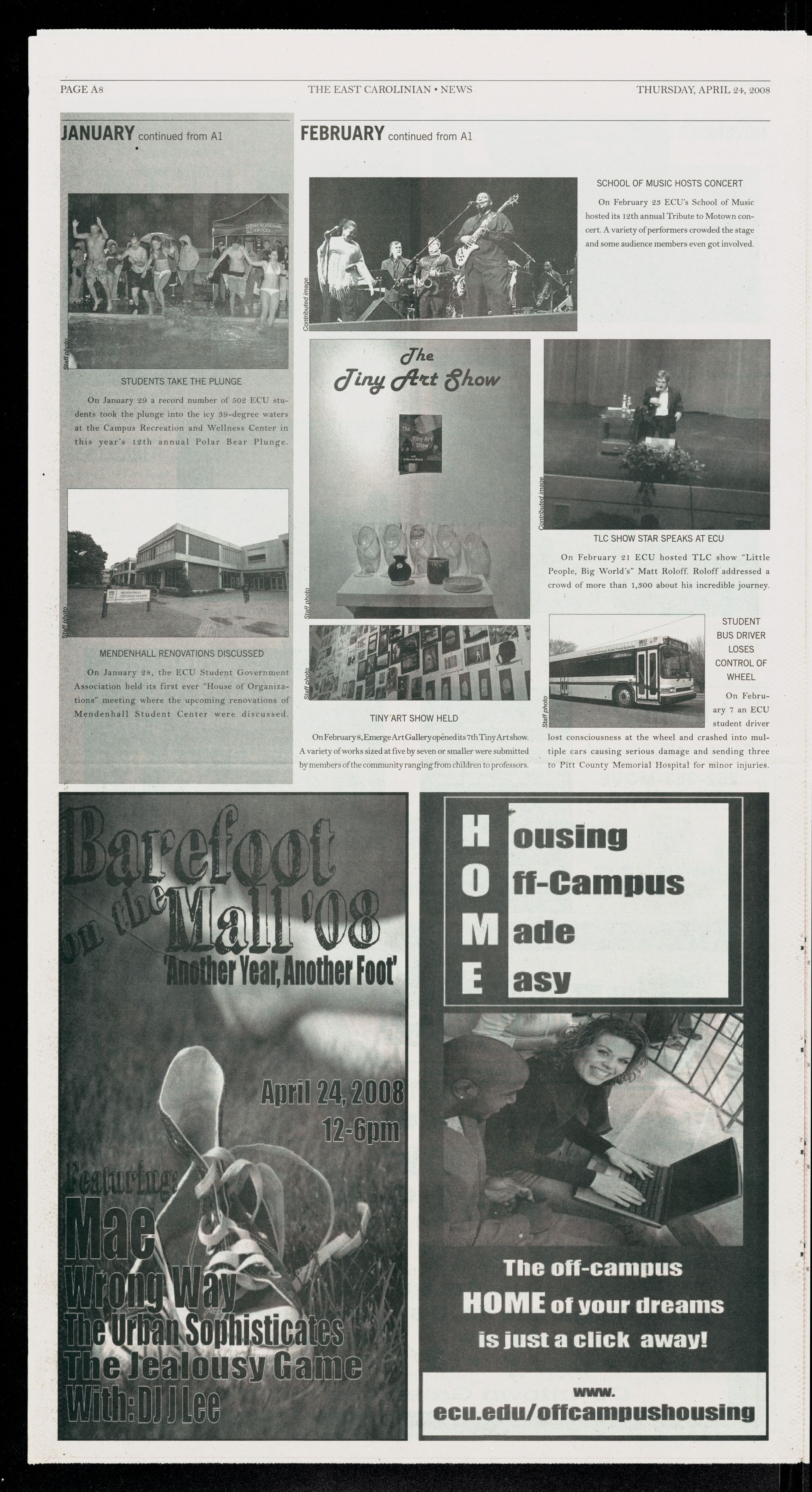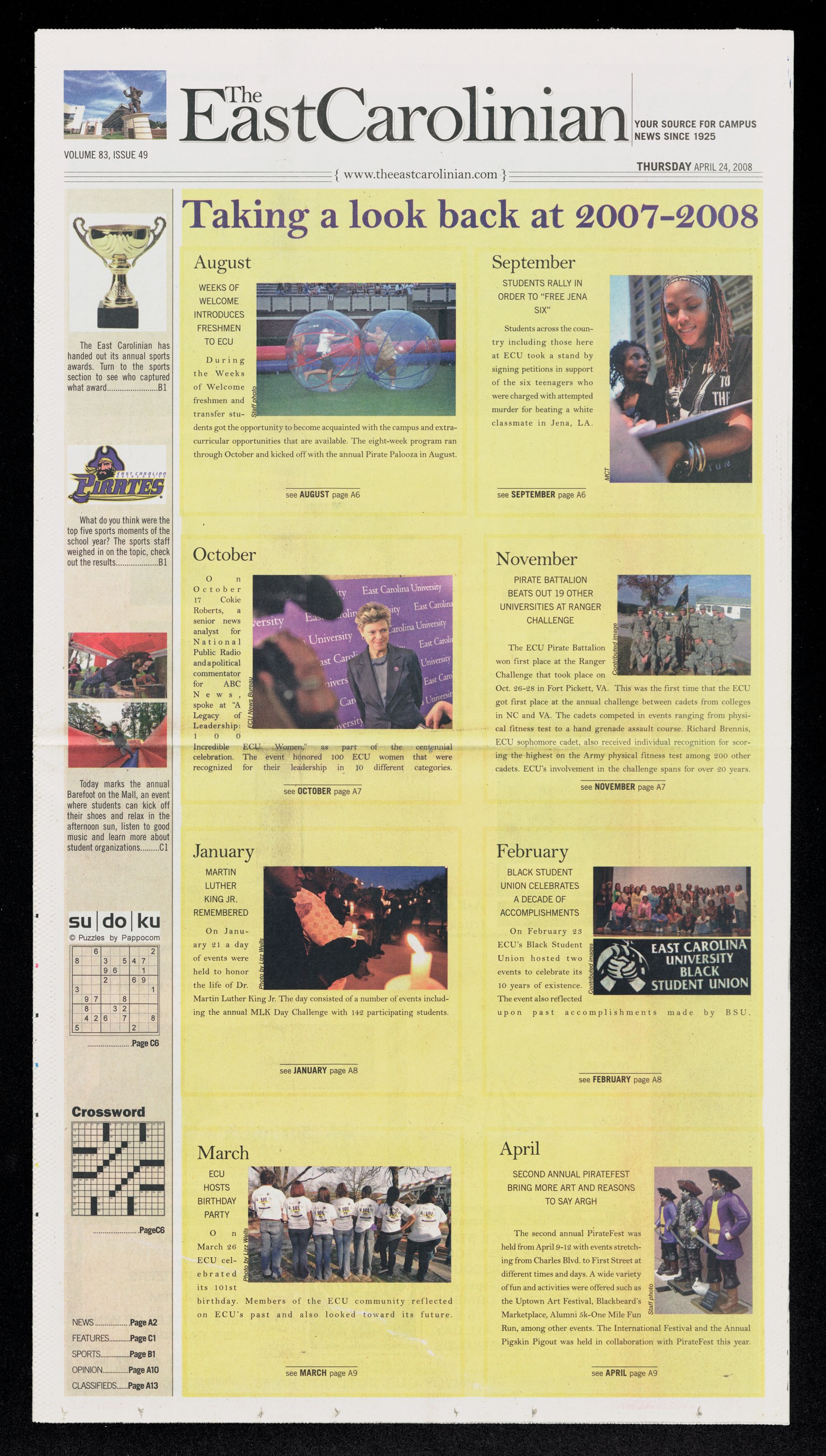 East Carolina's student-run campus newspaper was first published in 1923 as the East Carolina Teachers College News (1923-1925). It has been re-named as The Teco Echo (1925, 1926-1952), East Carolinian (1952-1969), Fountainhead (1969-1979), and The East Carolinian (1969, 1979-present). It includes local, state, national, and international stories with a focus on campus events.