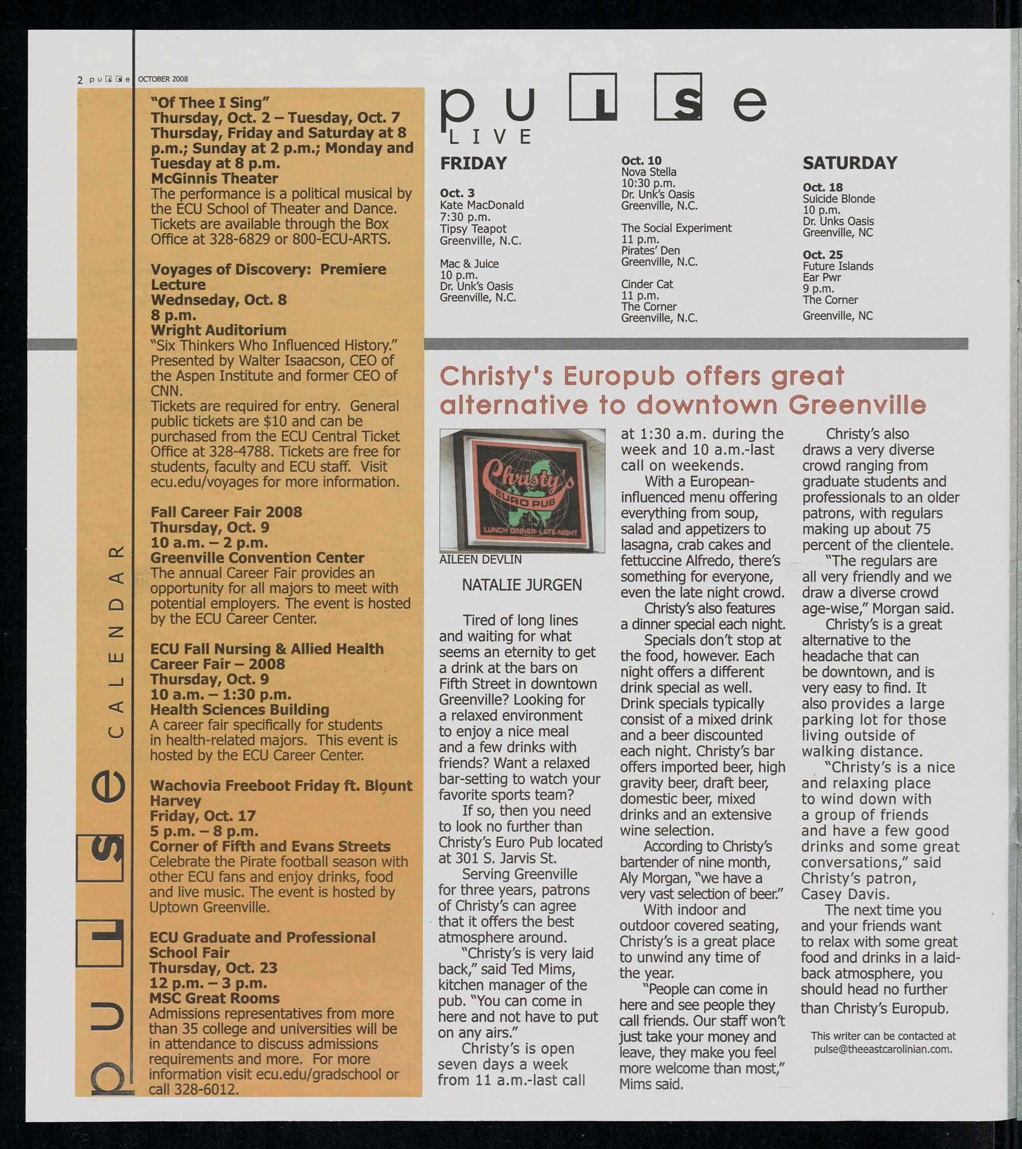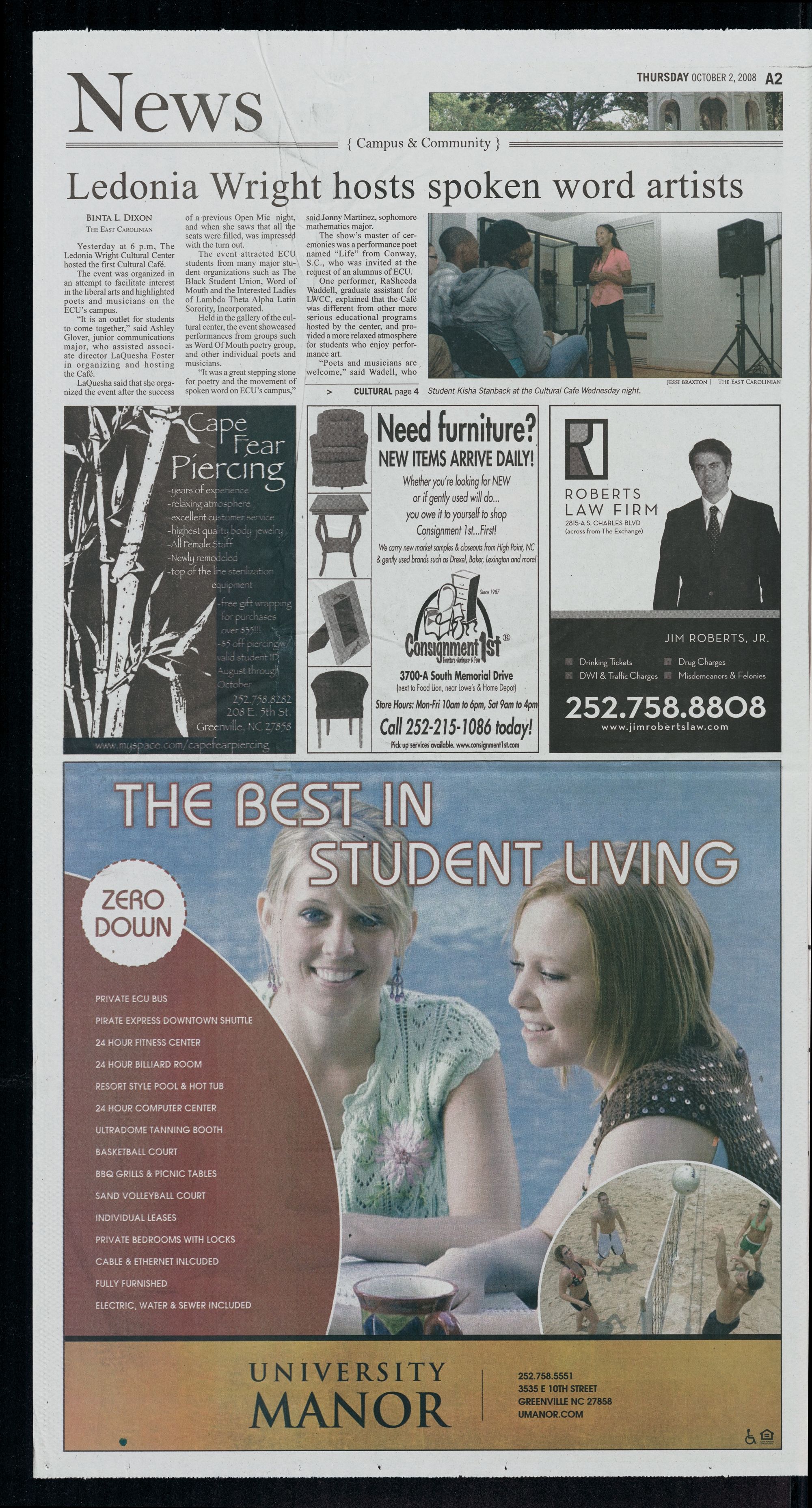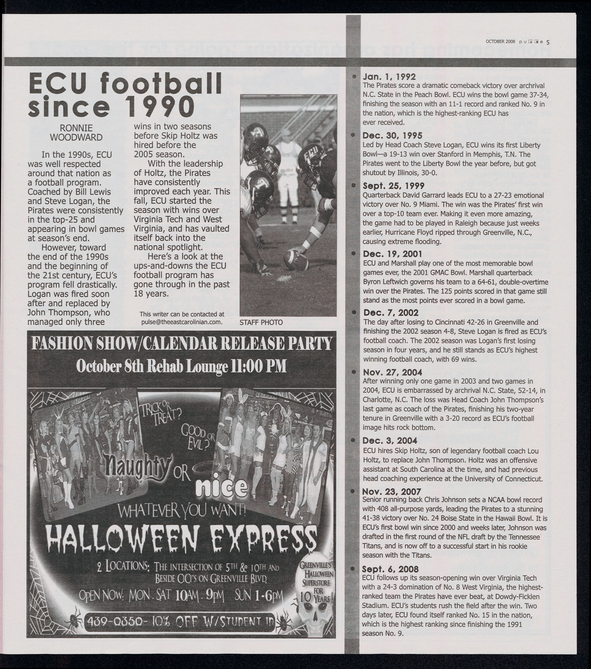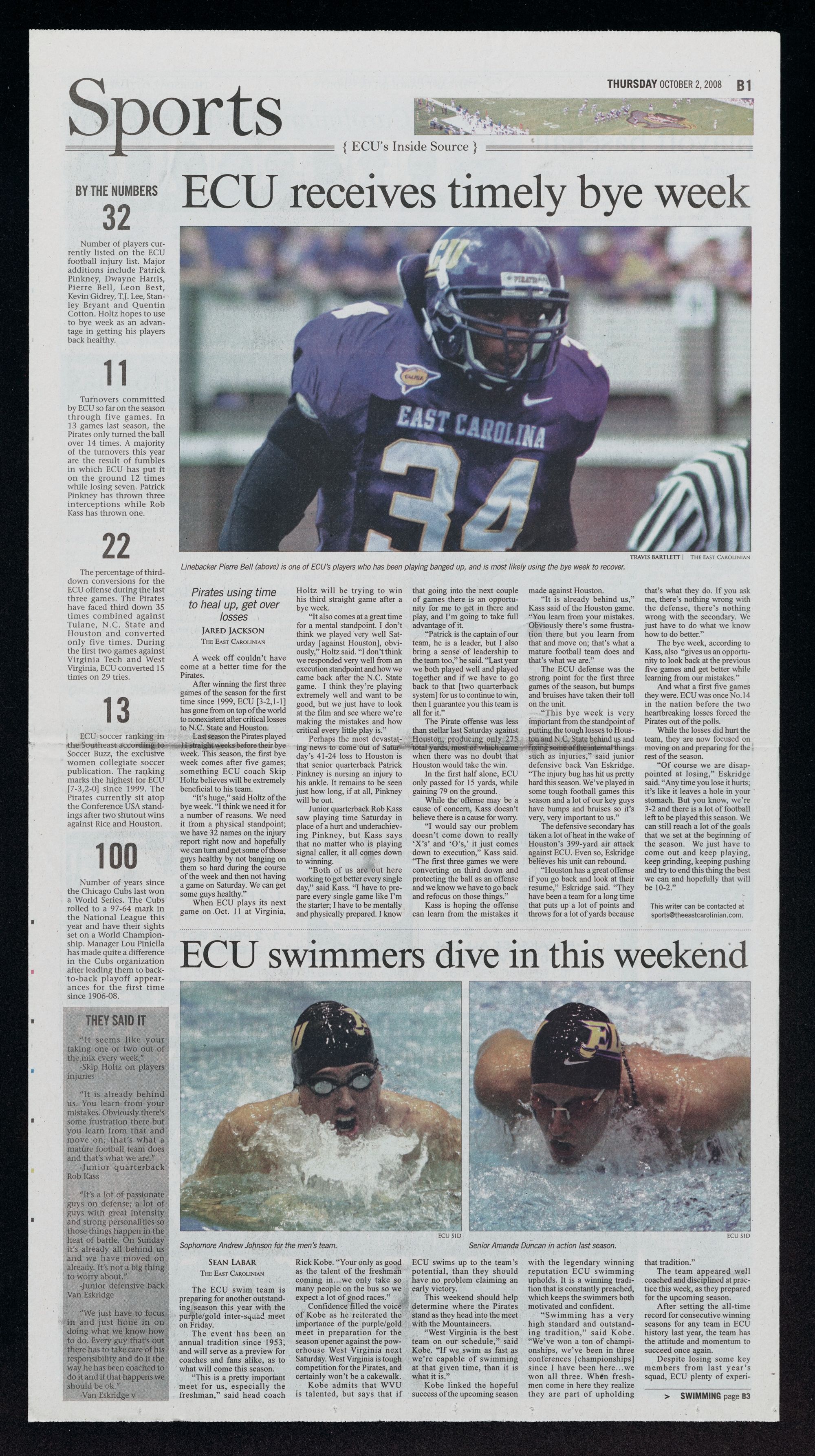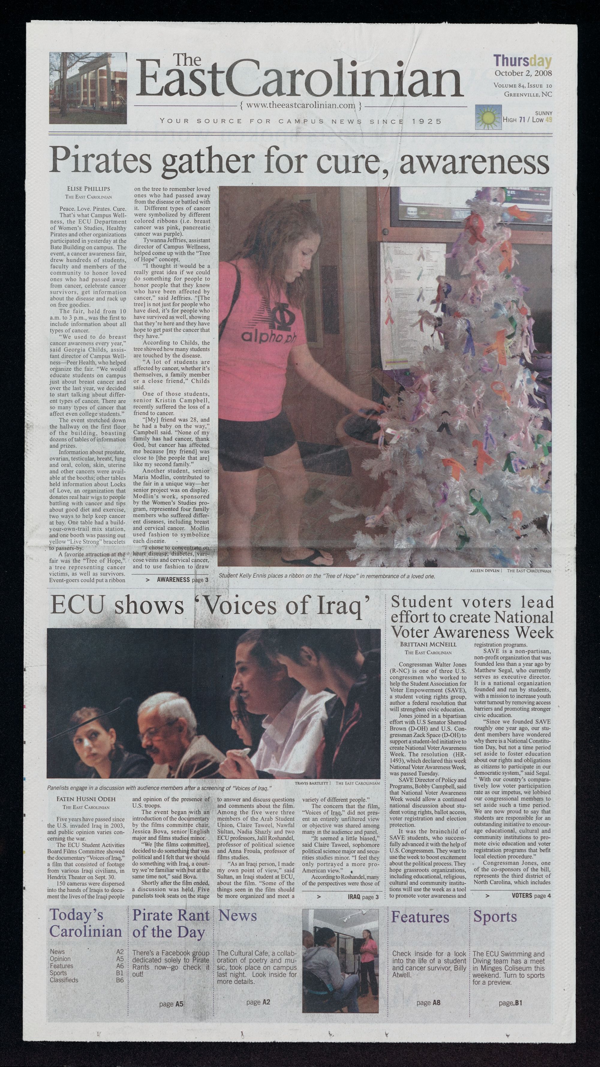 East Carolina's student-run campus newspaper was first published in 1923 as the East Carolina Teachers College News (1923-1925). It has been re-named as The Teco Echo (1925, 1926-1952), East Carolinian (1952-1969), Fountainhead (1969-1979), and The East Carolinian (1969, 1979-present). It includes local, state, national, and international stories with a focus on campus events.