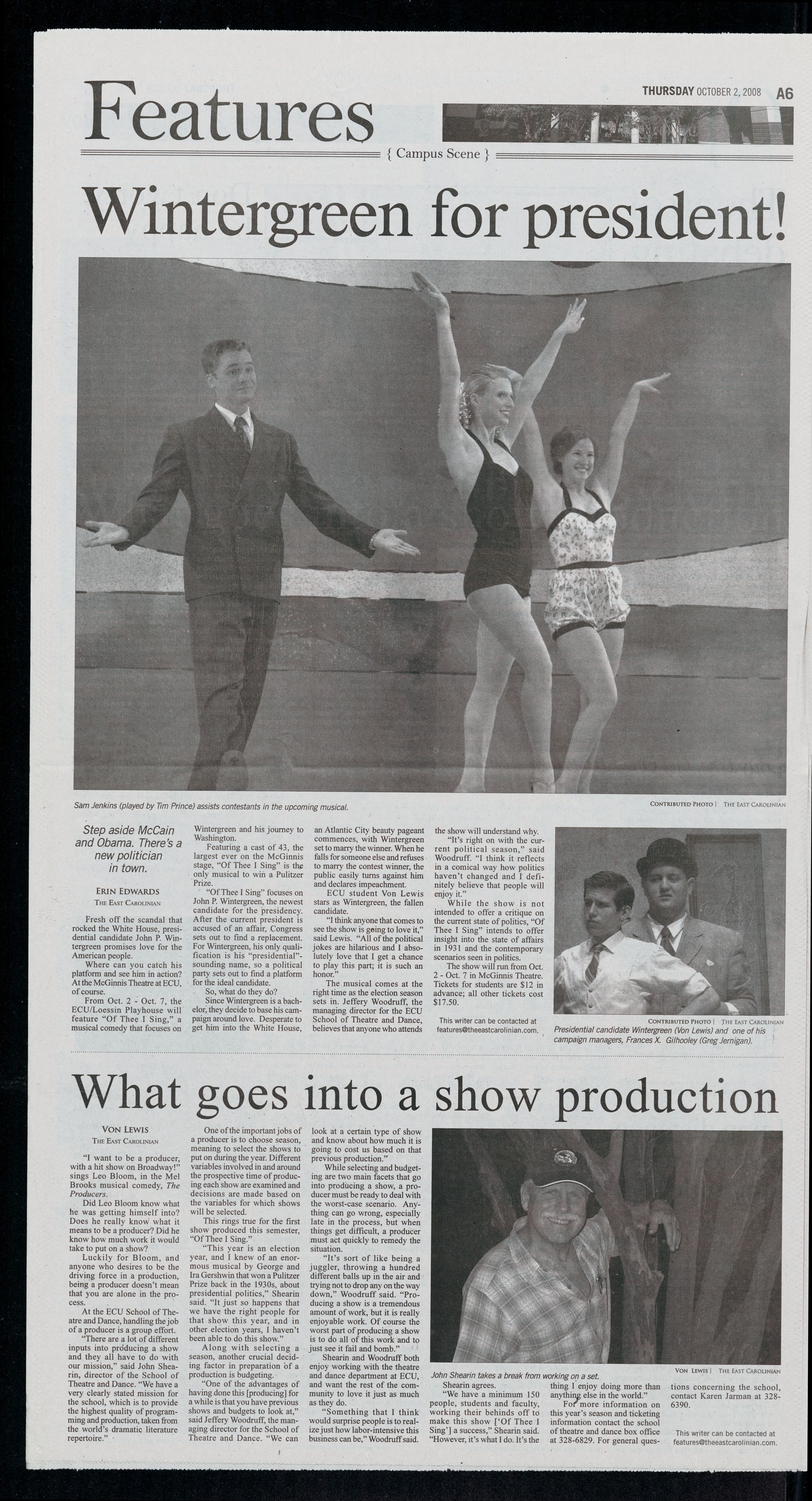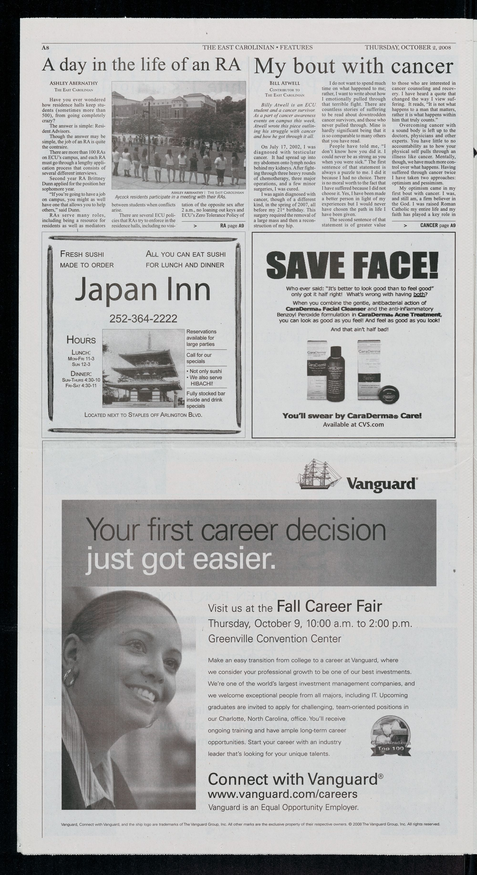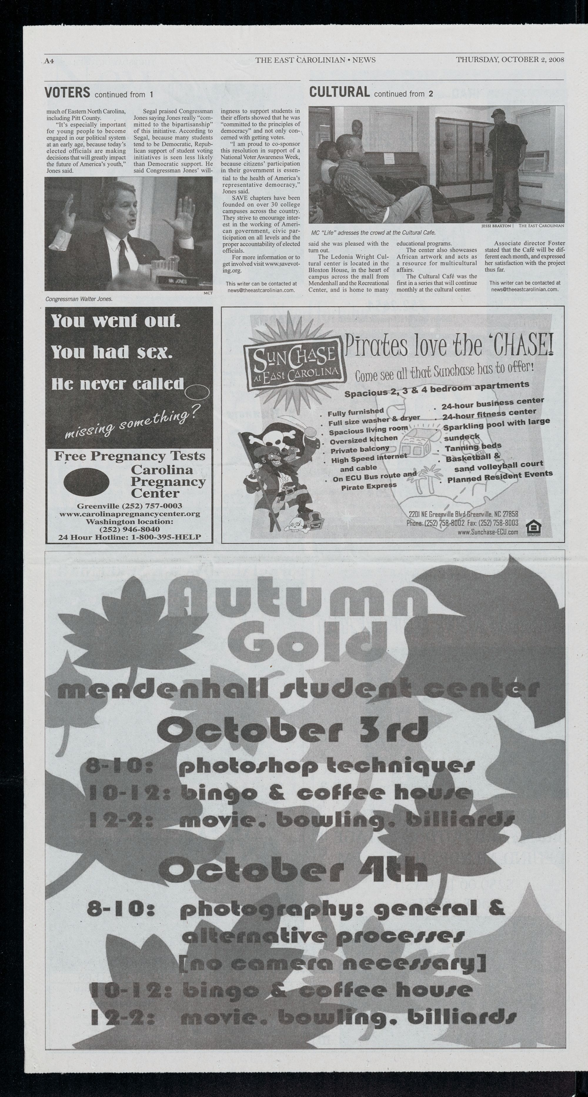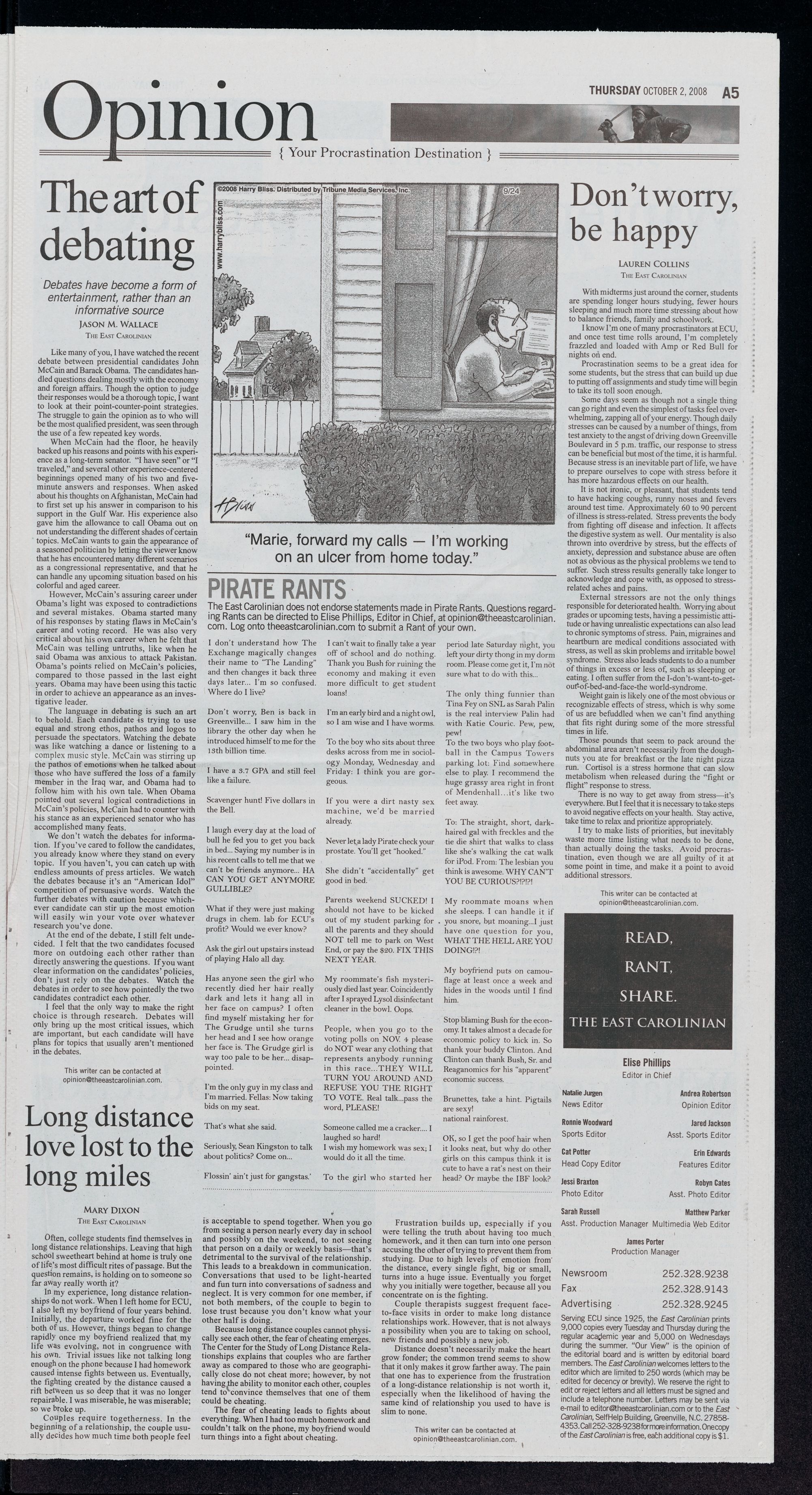 East Carolina's student-run campus newspaper was first published in 1923 as the East Carolina Teachers College News (1923-1925). It has been re-named as The Teco Echo (1925, 1926-1952), East Carolinian (1952-1969), Fountainhead (1969-1979), and The East Carolinian (1969, 1979-present). It includes local, state, national, and international stories with a focus on campus events.