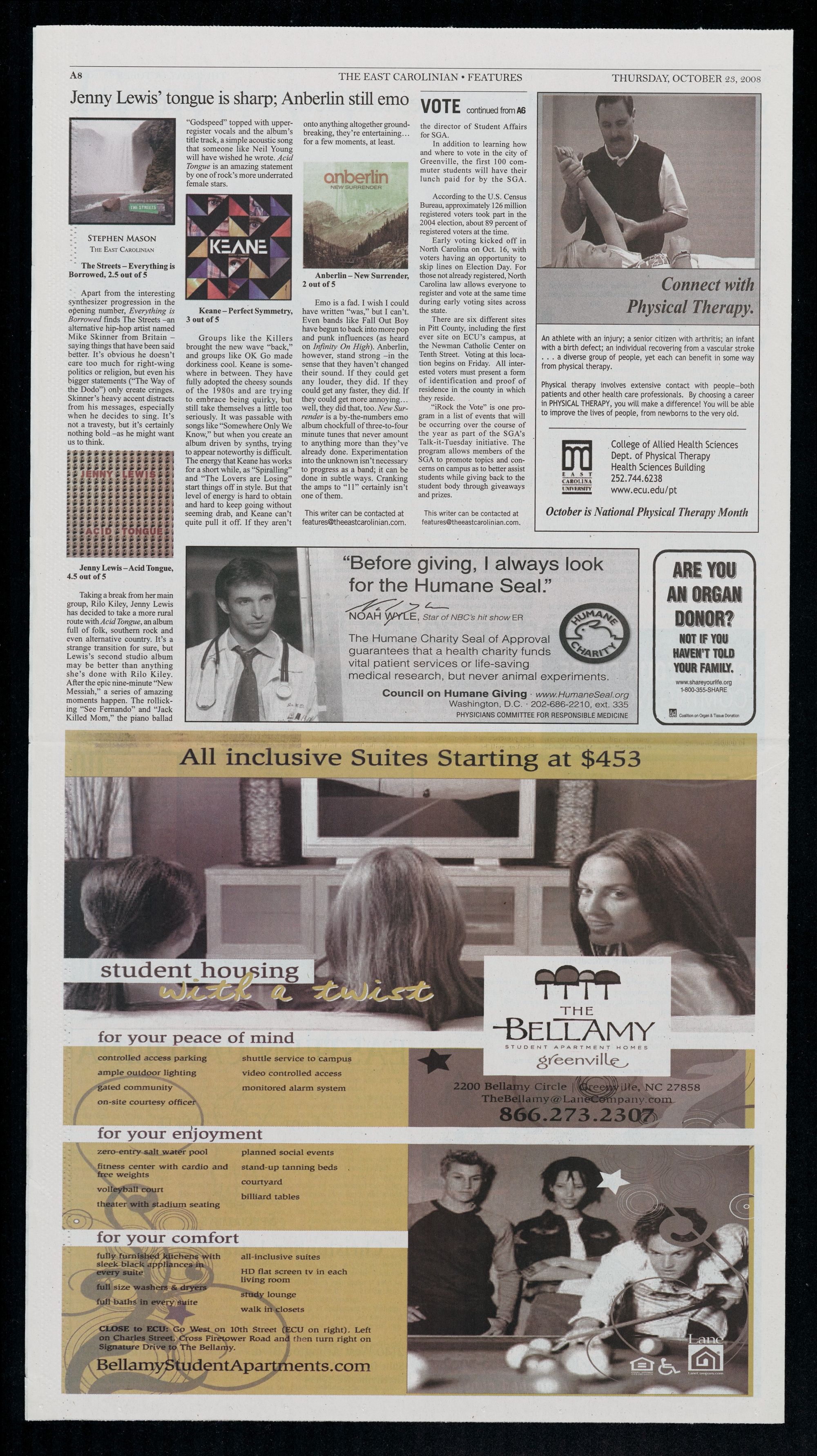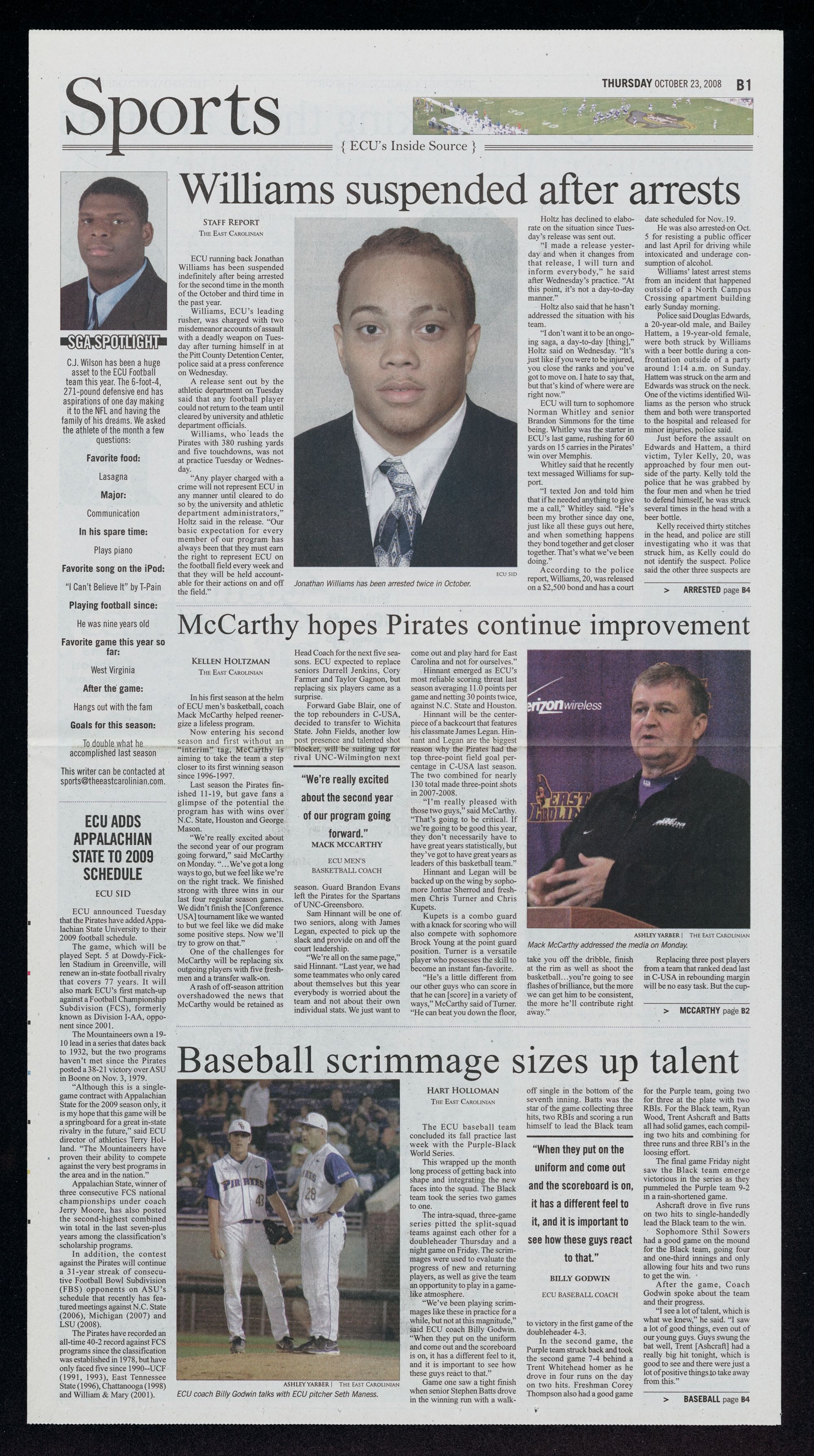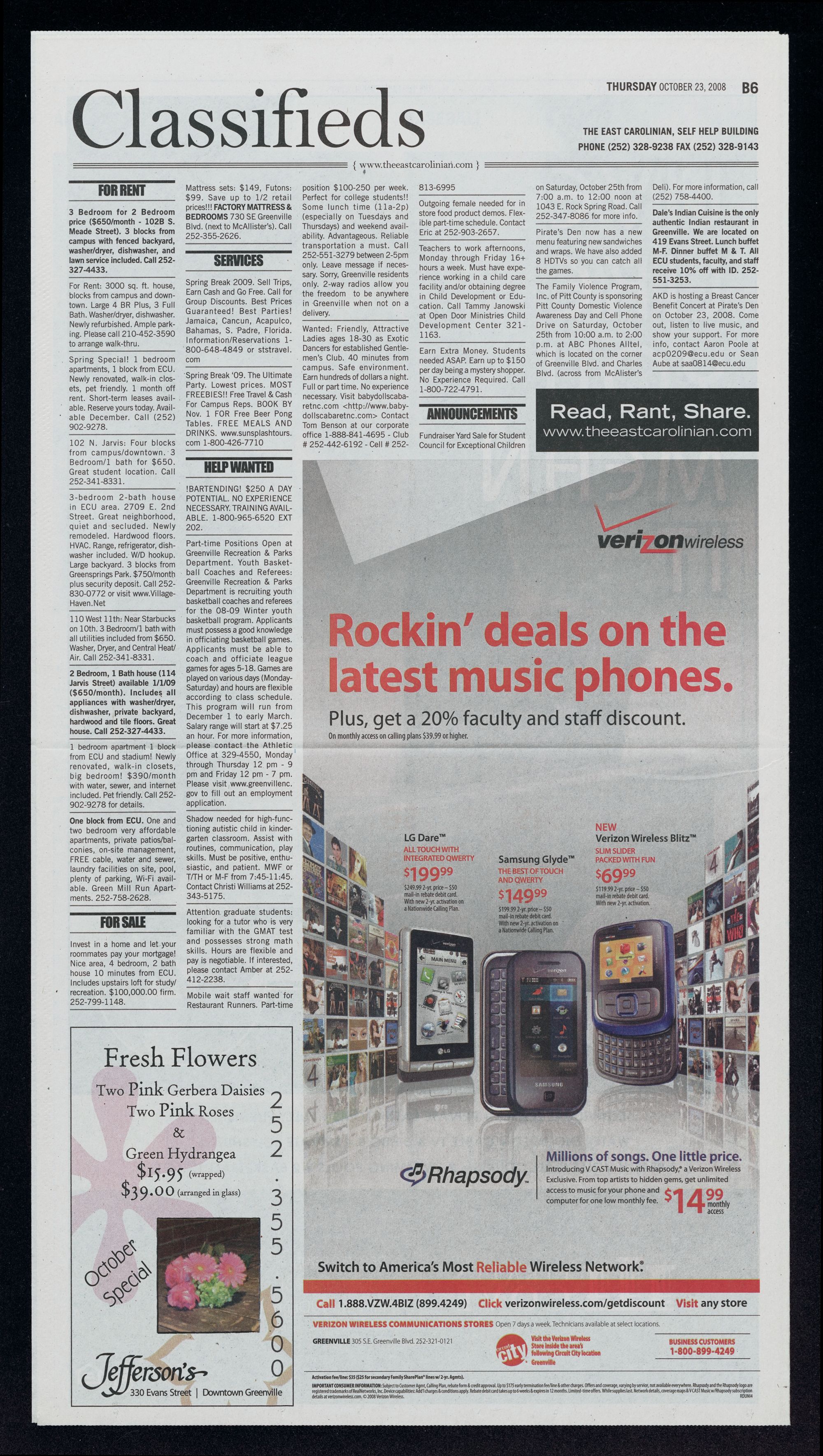 East Carolina's student-run campus newspaper was first published in 1923 as the East Carolina Teachers College News (1923-1925). It has been re-named as The Teco Echo (1925, 1926-1952), East Carolinian (1952-1969), Fountainhead (1969-1979), and The East Carolinian (1969, 1979-present). It includes local, state, national, and international stories with a focus on campus events.