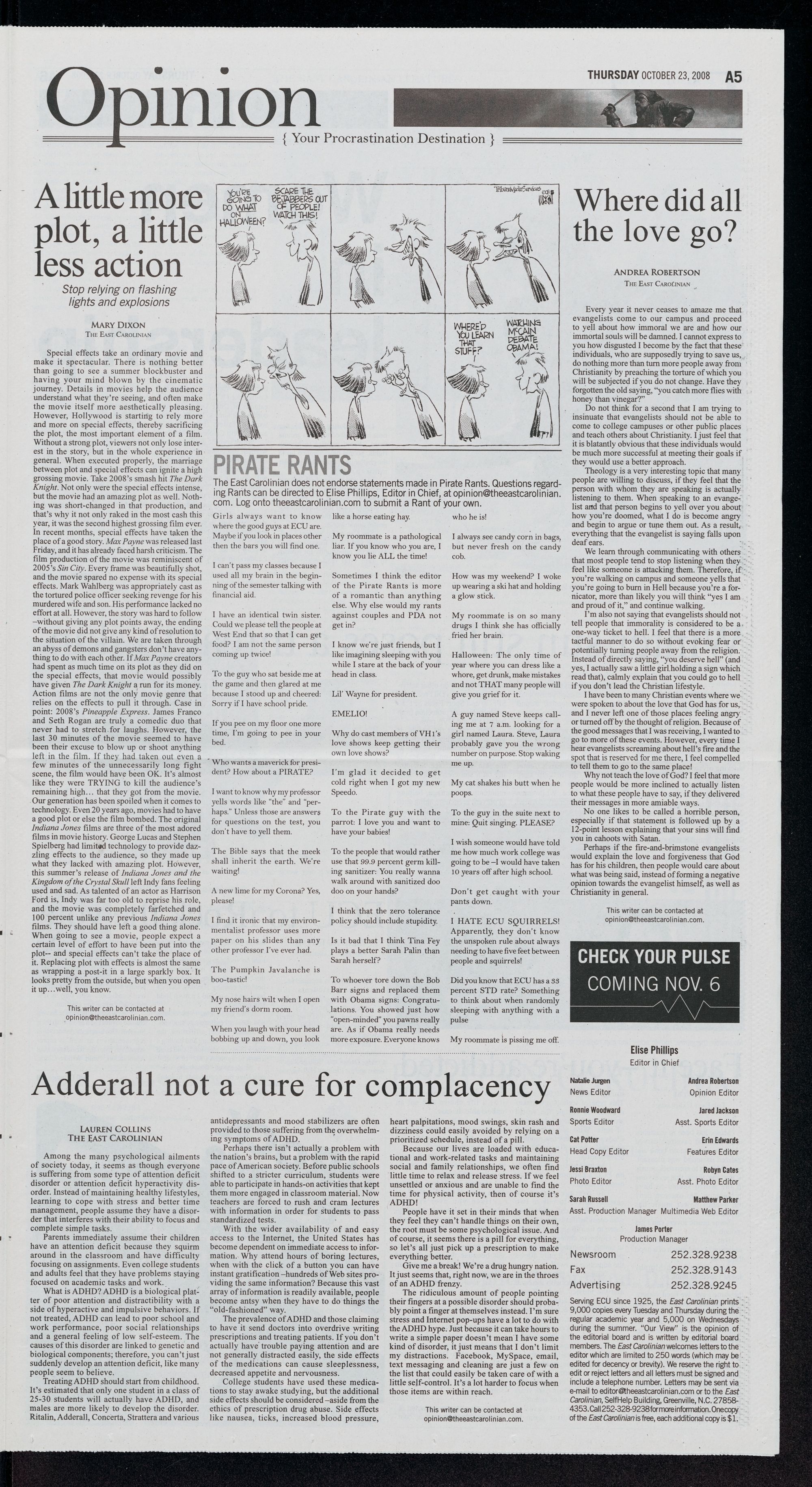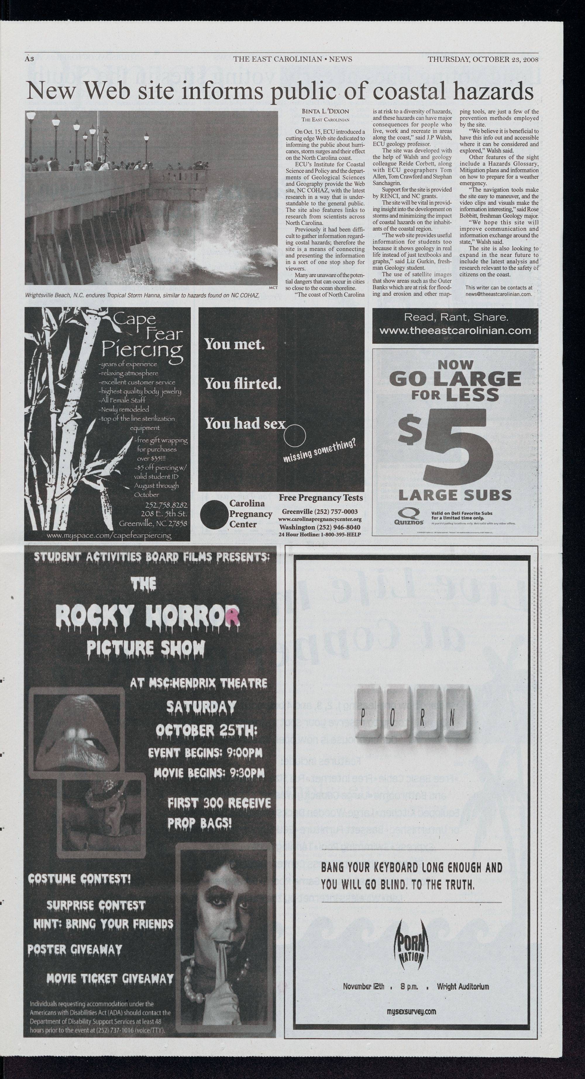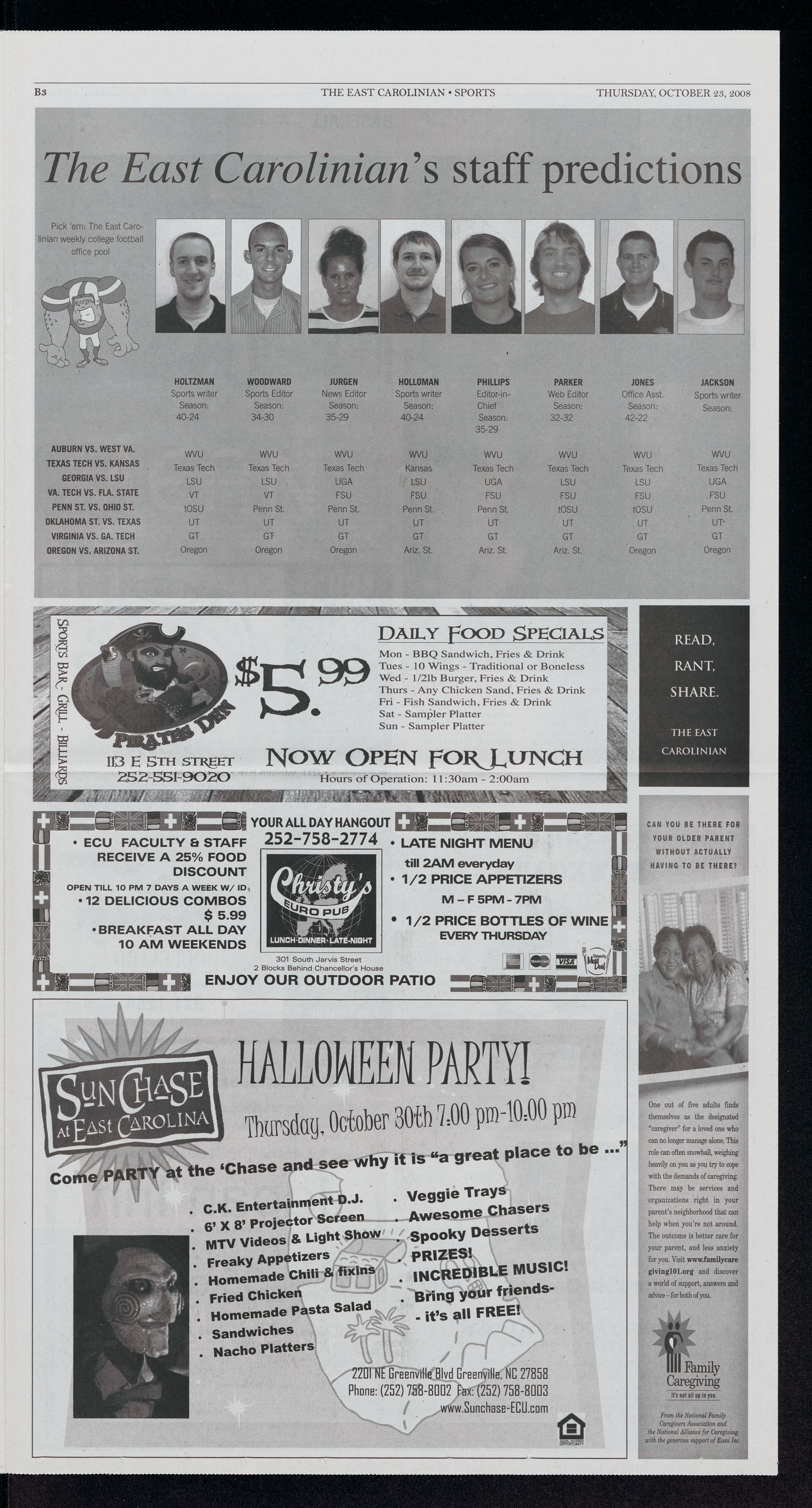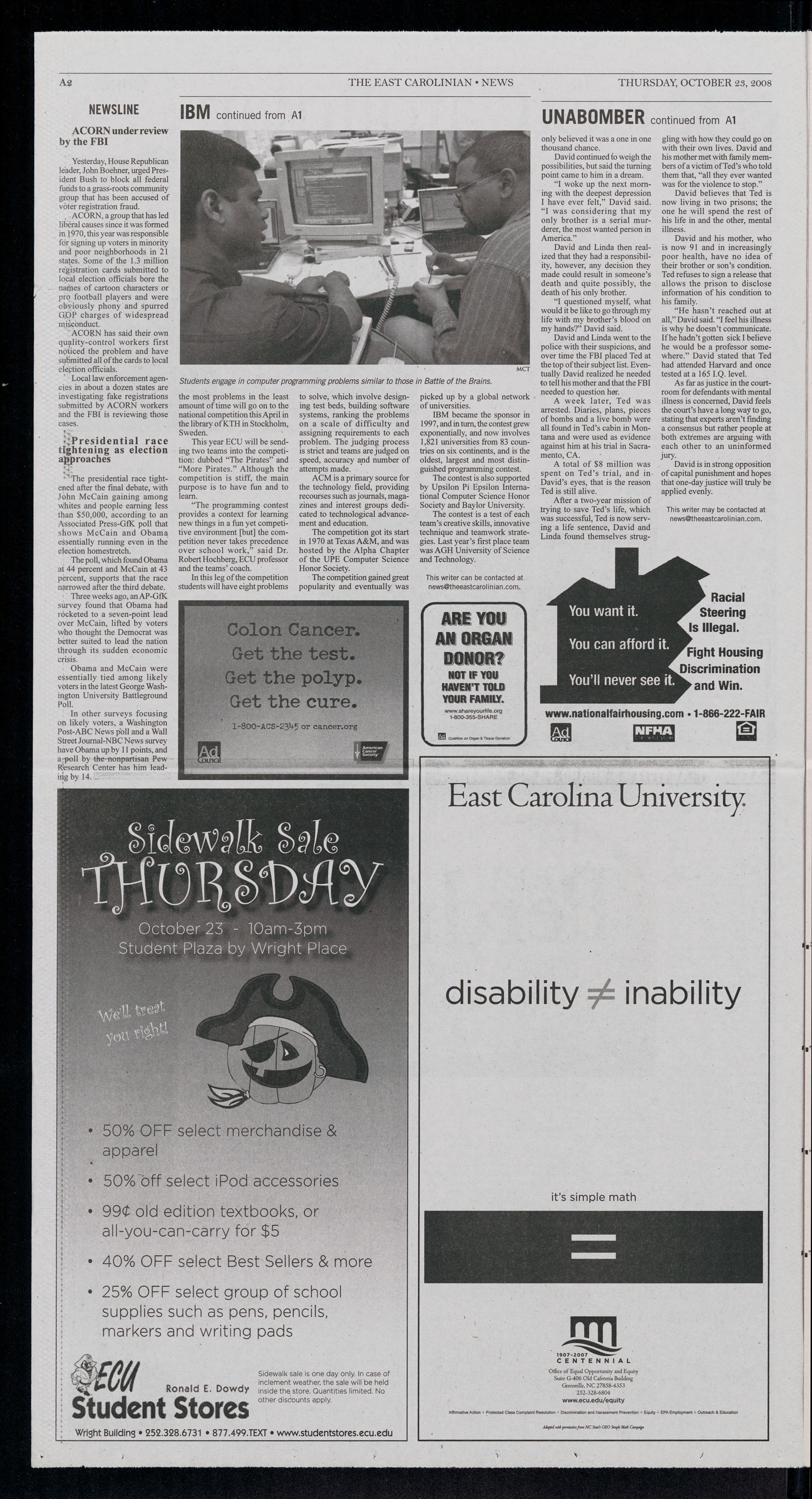 East Carolina's student-run campus newspaper was first published in 1923 as the East Carolina Teachers College News (1923-1925). It has been re-named as The Teco Echo (1925, 1926-1952), East Carolinian (1952-1969), Fountainhead (1969-1979), and The East Carolinian (1969, 1979-present). It includes local, state, national, and international stories with a focus on campus events.