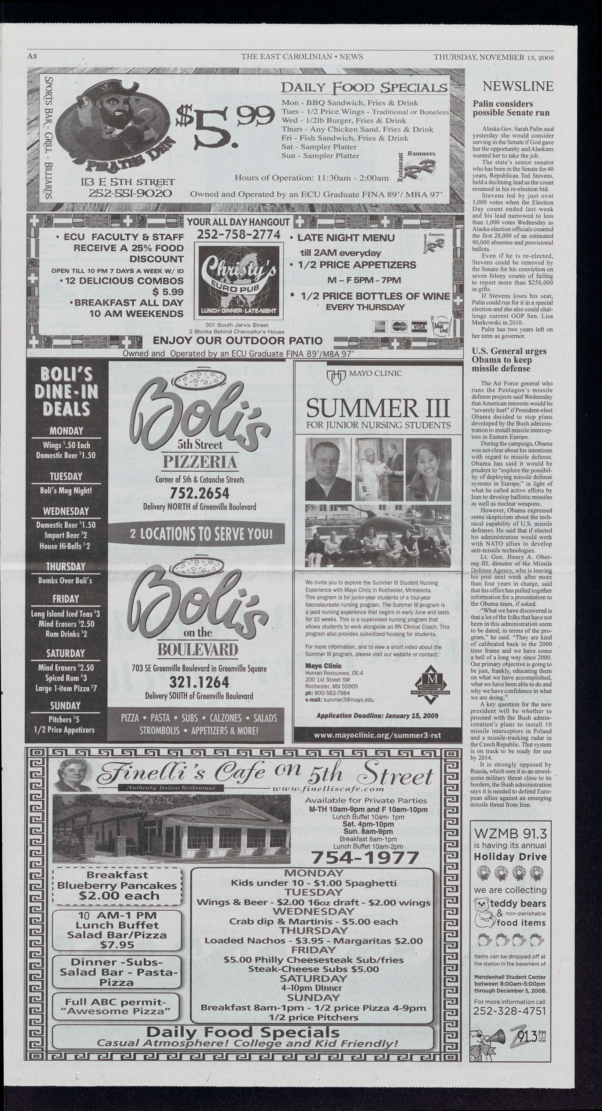 East Carolina's student-run campus newspaper was first published in 1923 as the East Carolina Teachers College News (1923-1925). It has been re-named as The Teco Echo (1925, 1926-1952), East Carolinian (1952-1969), Fountainhead (1969-1979), and The East Carolinian (1969, 1979-present). It includes local, state, national, and international stories with a focus on campus events.