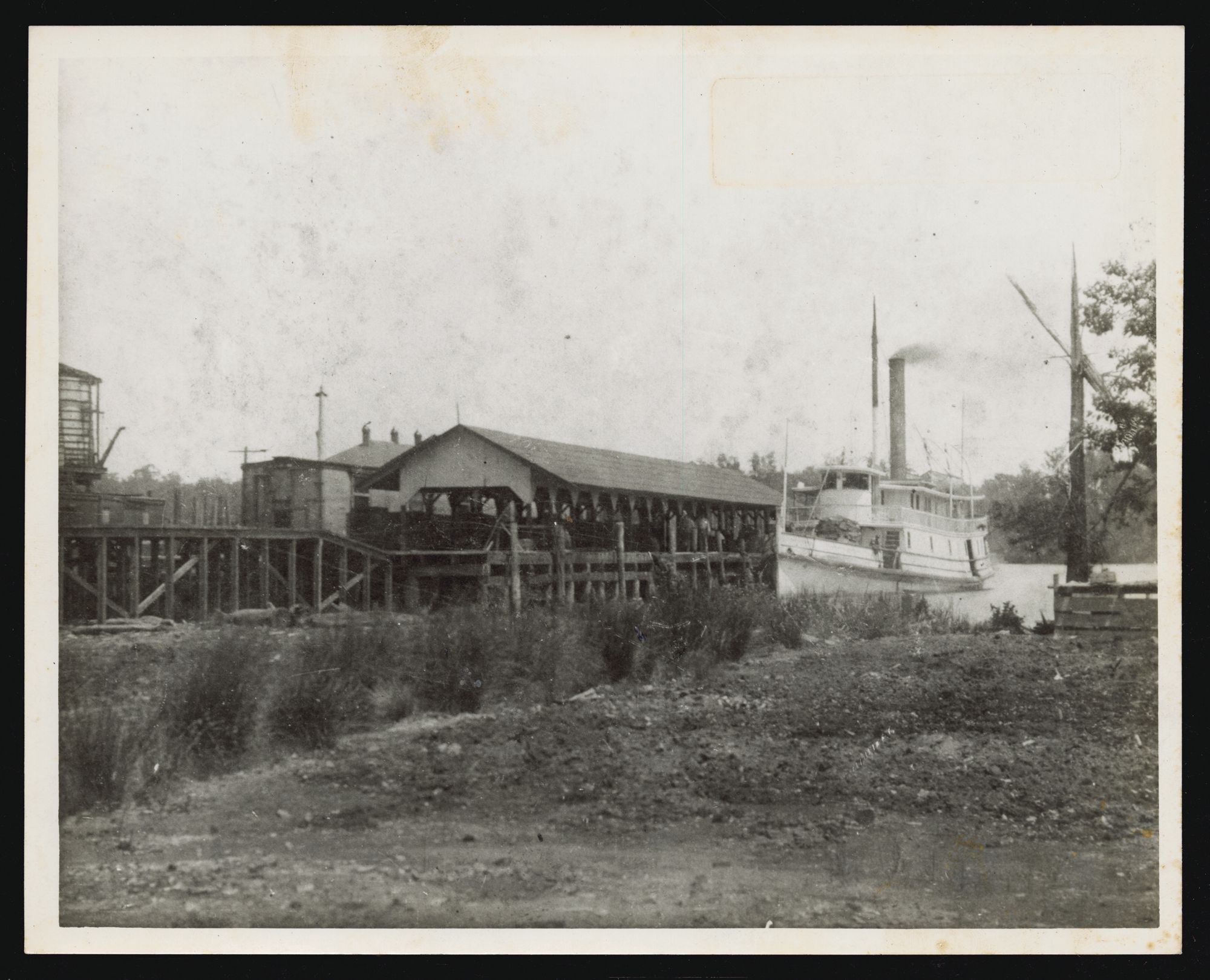 The steamboat OLIVE tied up at the Tunis Warf (on Chowan River) Atlantic Coast Line Railroad station at loft.