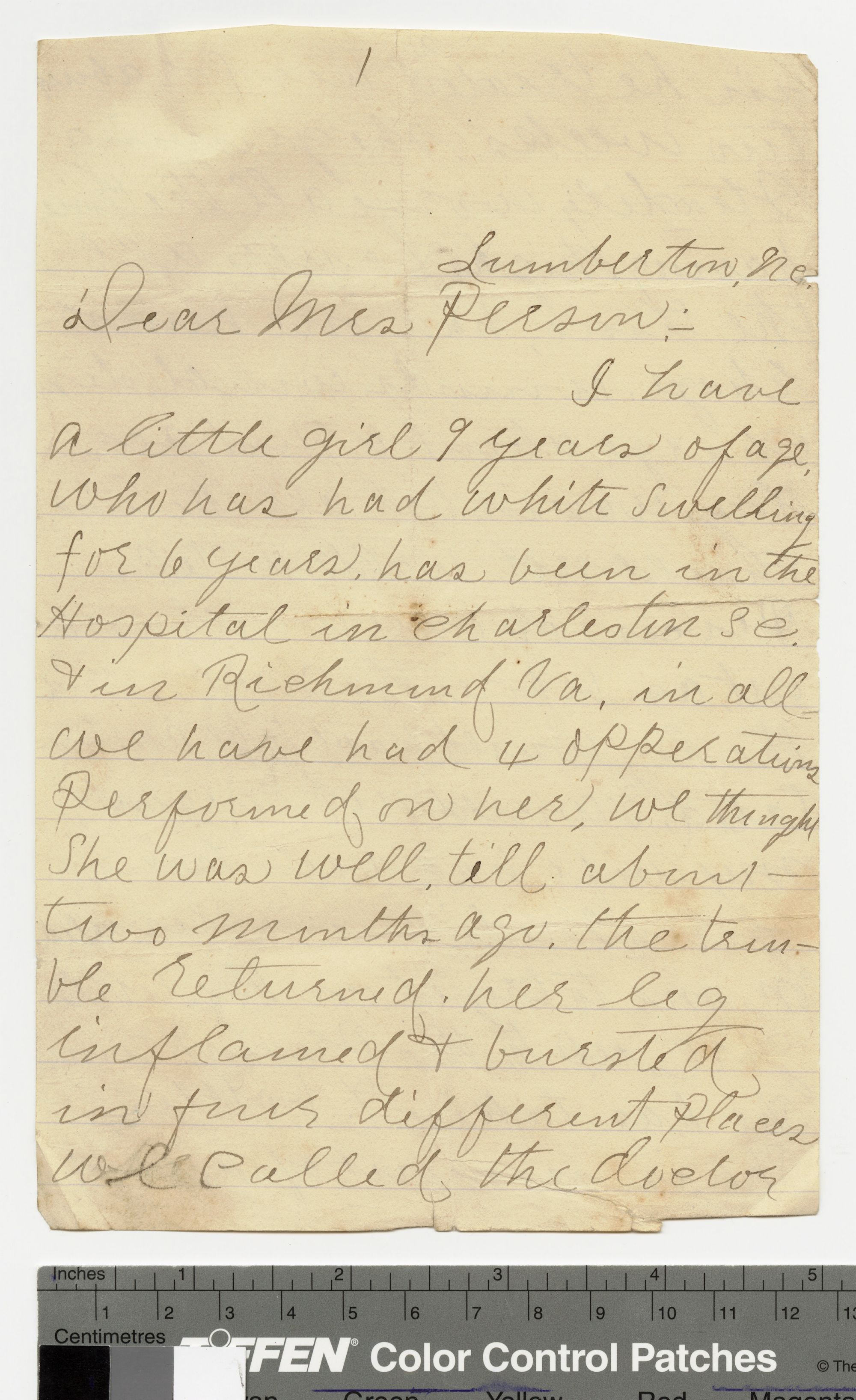 I have a little girl 9 years of age, who has had white swelling for 6 years, has been in the Hospital in Charleston S.C. & in Richmond Va. In all we have had 4 operations performed on her. We thought she was well, till about two months ago. The trouble returned, her leg inflamed & bursted in four different places. We called the doctor