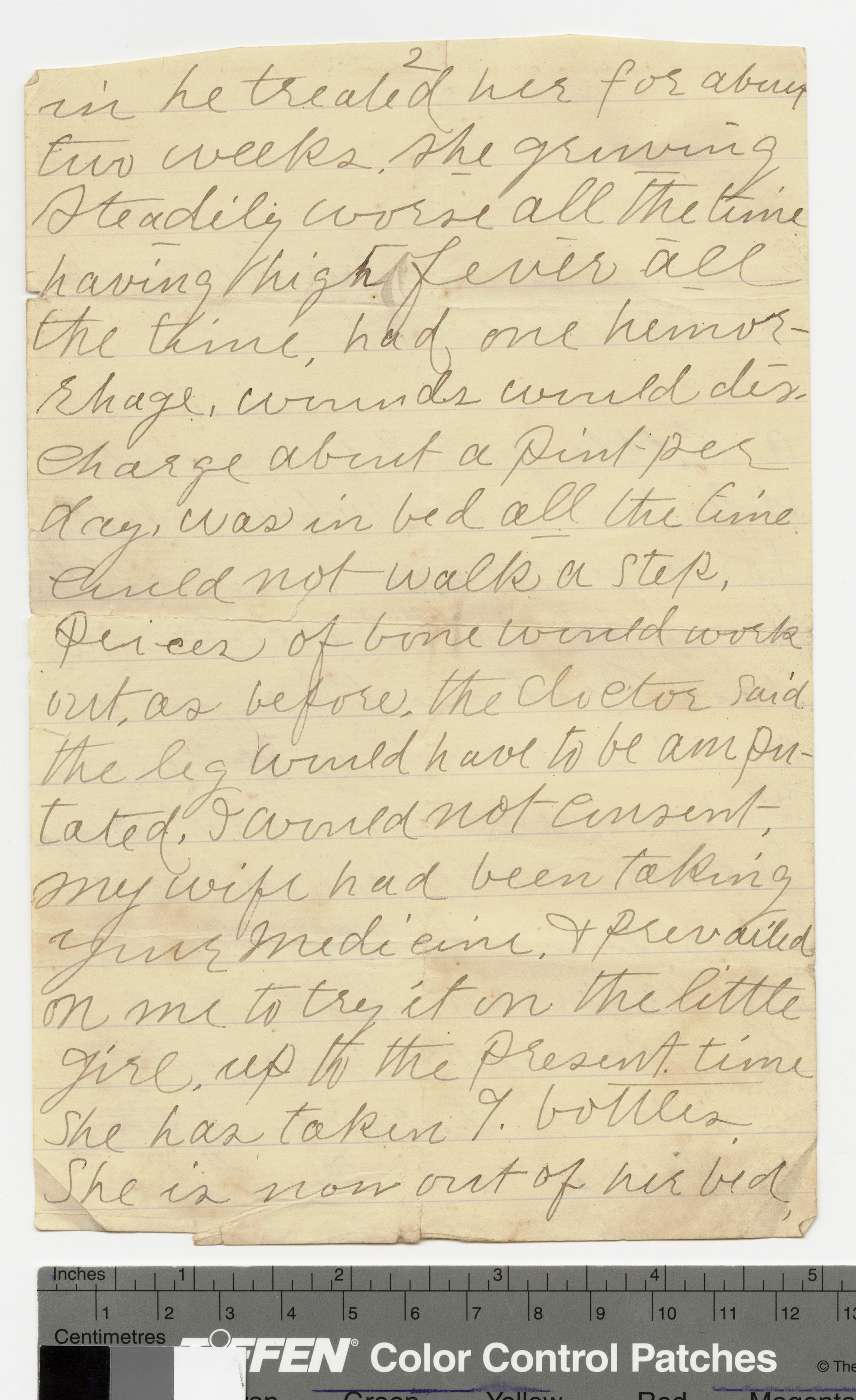 in he treated her for about two weeks, she growing steadily worse all the time, having high fever all the time, had one hemorrhage, wounds would discharge about a pint per day, was in bed all the time could not walk a step. Pieces of bone would work out, as before, the doctor said the leg would have to be amputated. I would not consent. My wife had been taking your medicine & prevailed on me to try it on the little girl. Up to the present time she has taken 9 bottles. She is now out of her bed.
