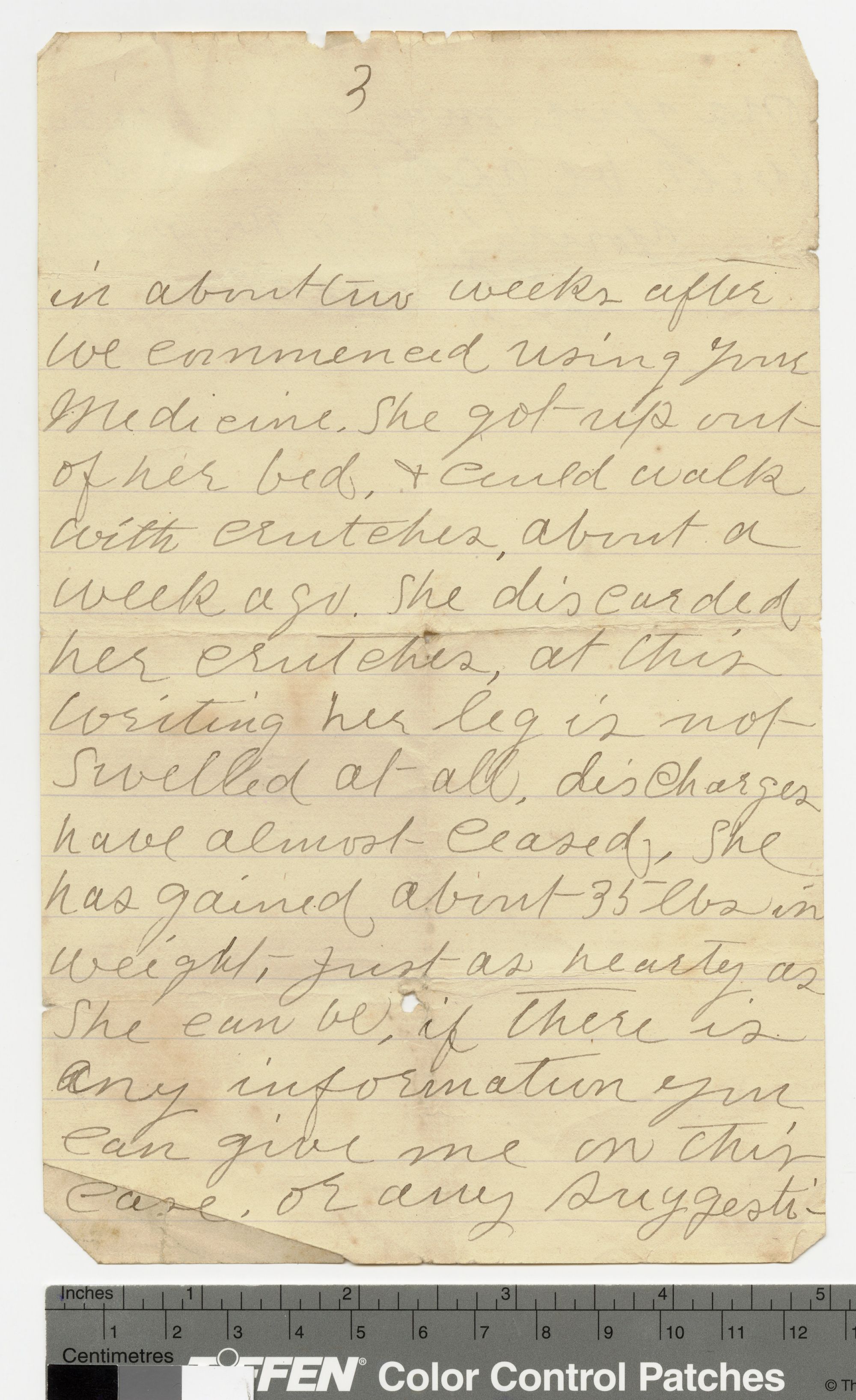 In about two weeks after we commenced using your medicine, she got up out of her bed and could walk with crutches. About a week ago she discarded her crutches. At this writing her leg is not swelled at all, discharges have almost ceased. She has gained about 35 lbs. in weight. Just as hearty as she can be. If there is any information you can give me on this case, or any suggesti-