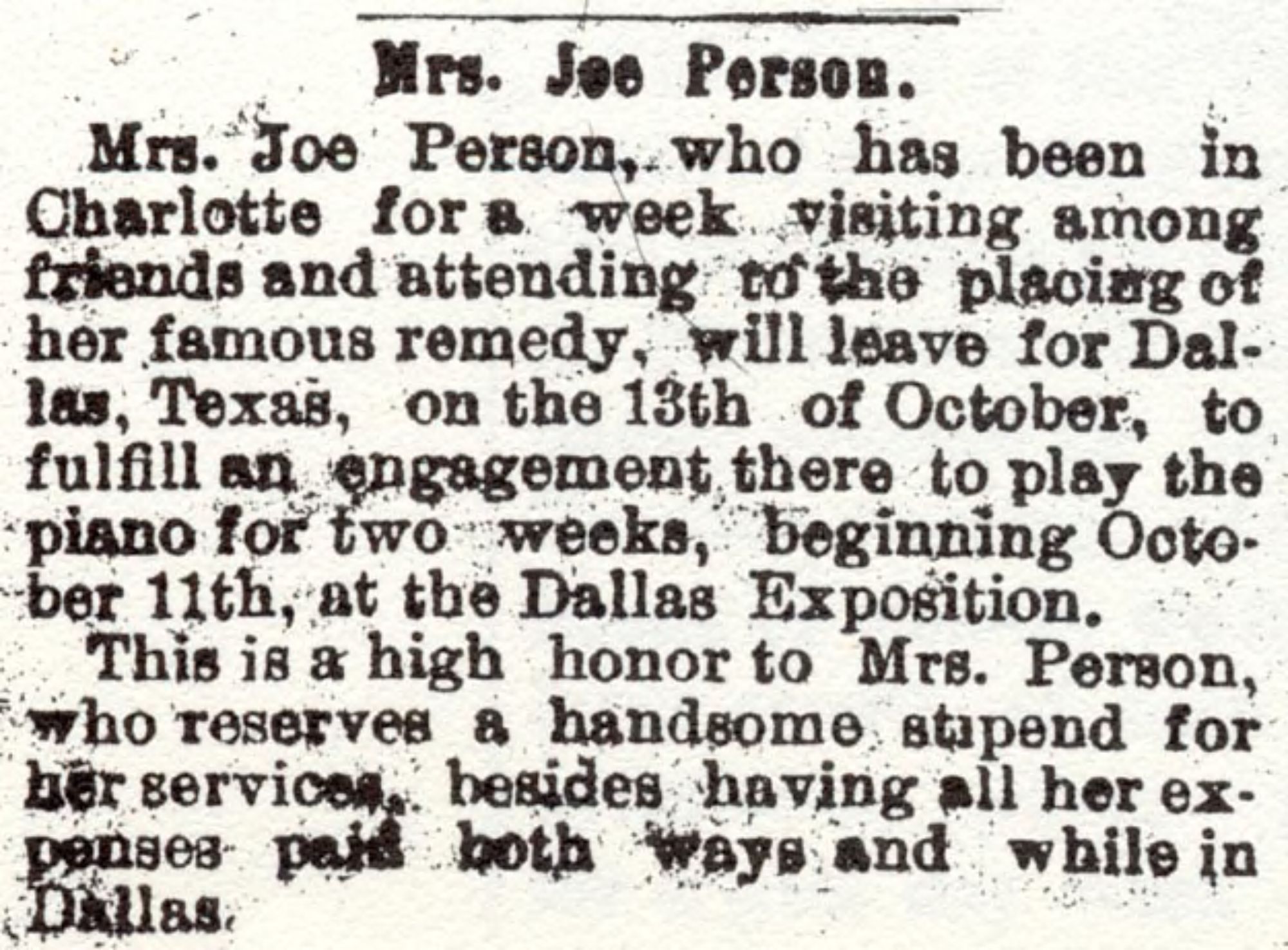 Mrs. Joe Person, who has been in Charlotte for a week visiting among friends and attending to the placing of her famous remedy, will leave for Dallas, Texas on the 13th of October, to fulfill an engagement there to play the piano for two weeks, begining October 11th, at the Dallas Exposition.