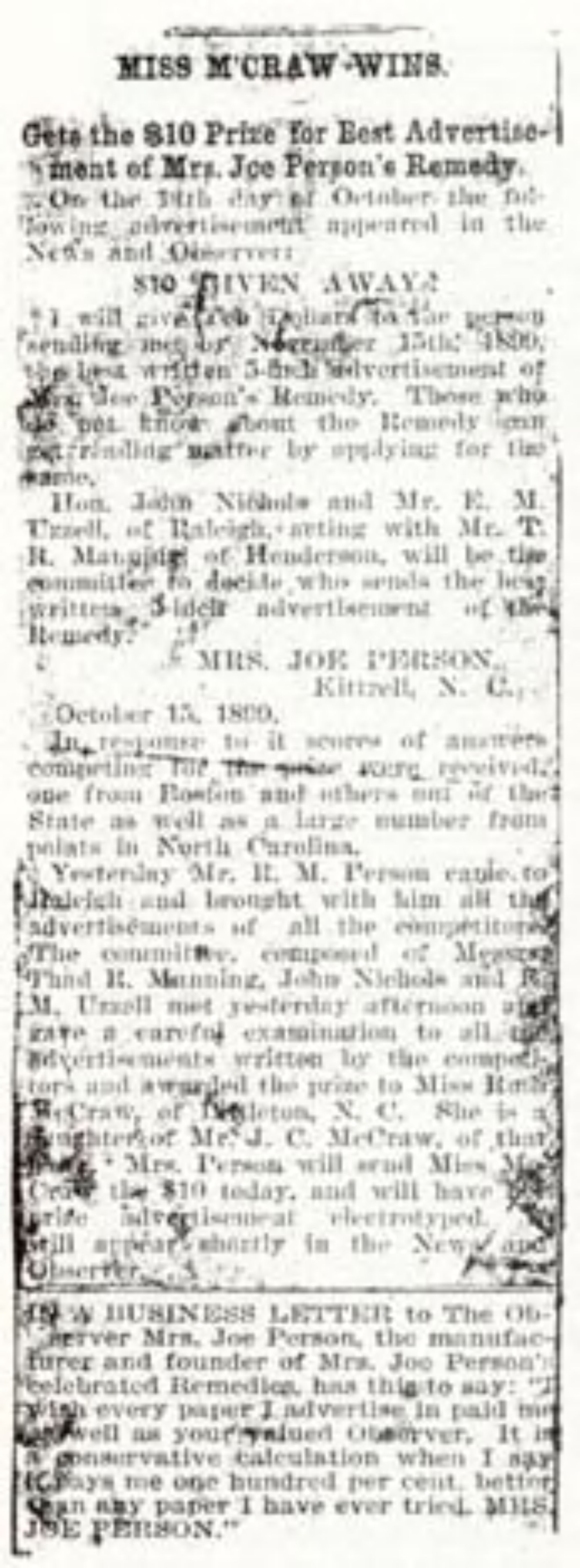 Yesterday Mr. R. M. Person came to Raleigh and brough with him all the advertisements of all the competitors. The committee, composed of Mssrs. Thad R. Manning, John Nichols and H. M. Uzzell met yesterday afternoon and gave a careful examination to all the advertisements written by the competitors and awarded the prize to Miss Ruth McCraw, of Littleton, N.C. She is a daughter of Mr. J. C. McCraw, of that [illegible]. Mrs. Person will send Miss McCraw the $10 today, and will have the prize advertisement electrotyped. It will appear shortly in the News and Observer.