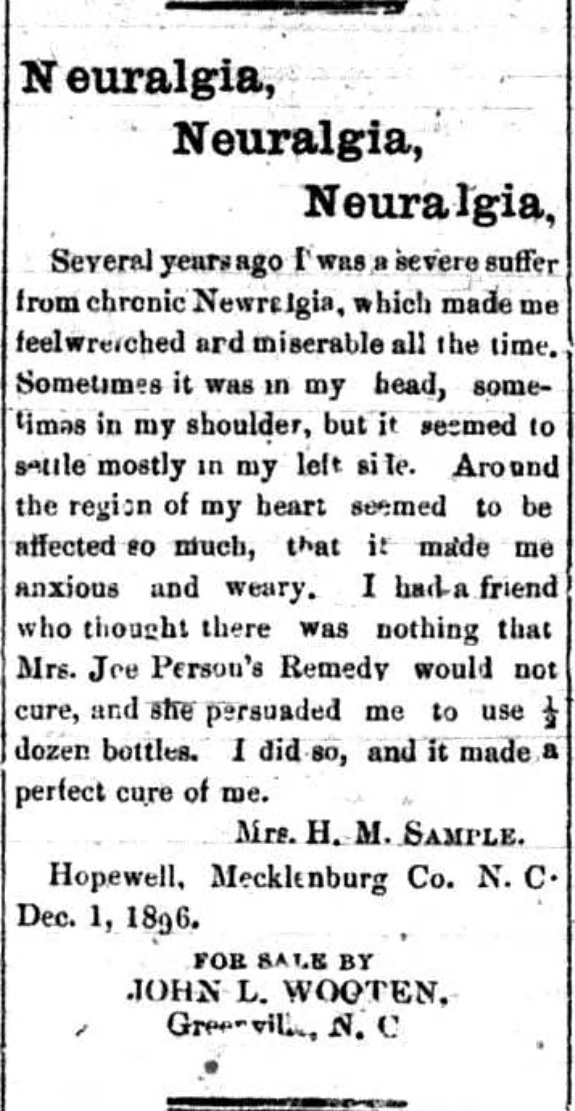 Several Years ago I was a severe suffer from chronic Newralgia, which made me feel wretched and miserable all the time. Sometimes it was in my head,sometimes in my shoulder, but it seemed to settle mostly in my left side. Around the region of my heart seemed to be affected so much, that it made me anxious and weary. I had a friend who thought there was nothing that Mrs. Joe Person's Remedy would not cure, and she persuaded me to use 1/2 dozen bottles. I did so, and it made a perfect cure of me.