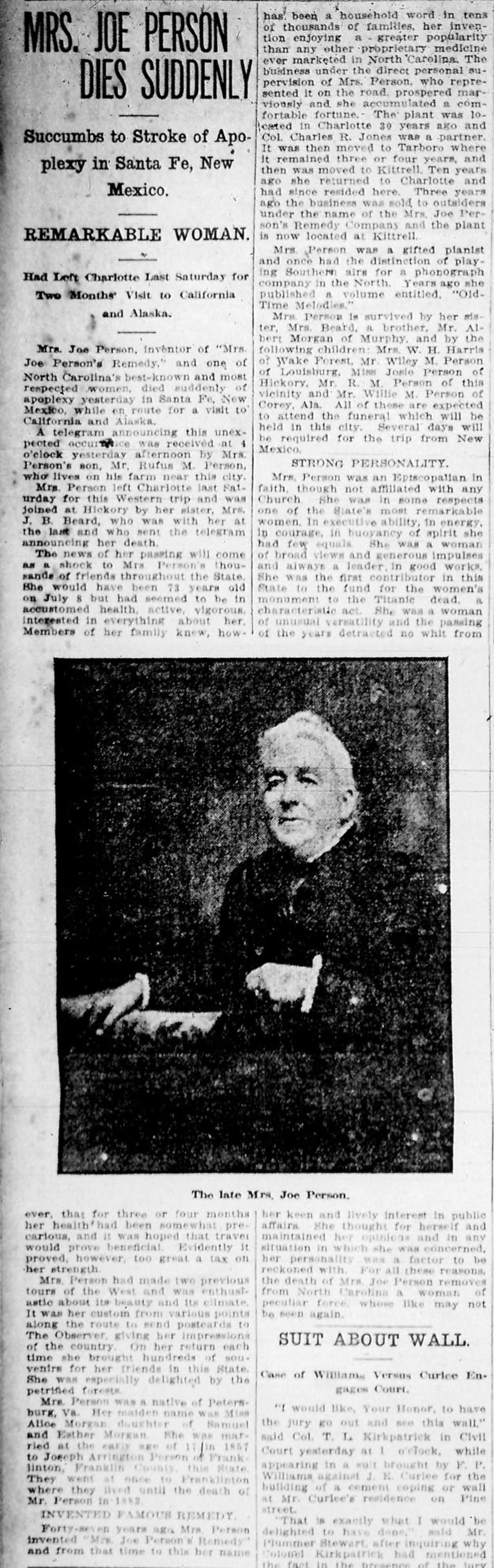 Mrs. Joe Person, inventor of “Mrs. Joe Person’s Remedy,” and one of North Carolina’s best-known and most respected women, died suddenly of apoplexy yesterday in Santa Fe, New Mexico, while en route for a visit to California and Alaska.