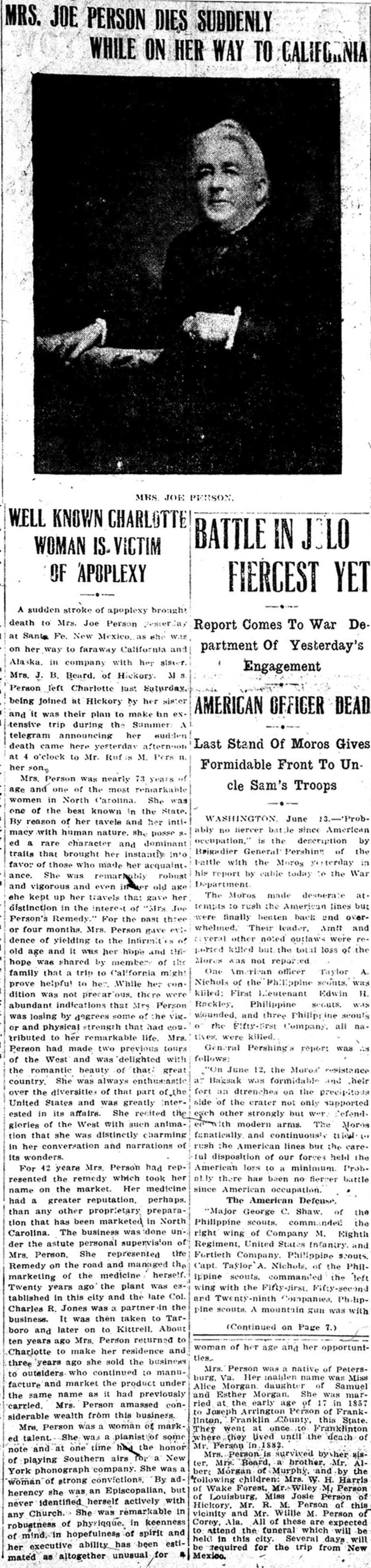 Mrs. Joe Person was nearly 73 years of age and one of the most remarkable women in North Carolina. She was one of the best known in the State. By reason of her tavels and her intimacy with human nature, she possessed a rare character and dominant traits that brought her instantly into favor of those who made her acquaintance. She was remarkably robust and vigorous and even in her old age she kept up her travels that gave her distinction in the interest of "Mrs. Joe Person's Remedy." For the past three or four months, Mrs. Person gave evidence of yielding to the infirmities of old age and it was her hope and this hope was shared by members of the family that a trip to California might prove helpful to her. While her condition was not precarious, there were abundant indications that Mrs. Person was losing by degrees some of her vigor and physical strength that had contributed to her remarkable life. Mrs. Person had made two previous tours of the West and was delighted with the romantic beauty of that great country. She was always enthusiastic over the diversities of that part of the United States and was greatly interested in its affairs. She recited the glories of the West with such animation that she was distinctly charming in her conversation and narrations of its wonders.