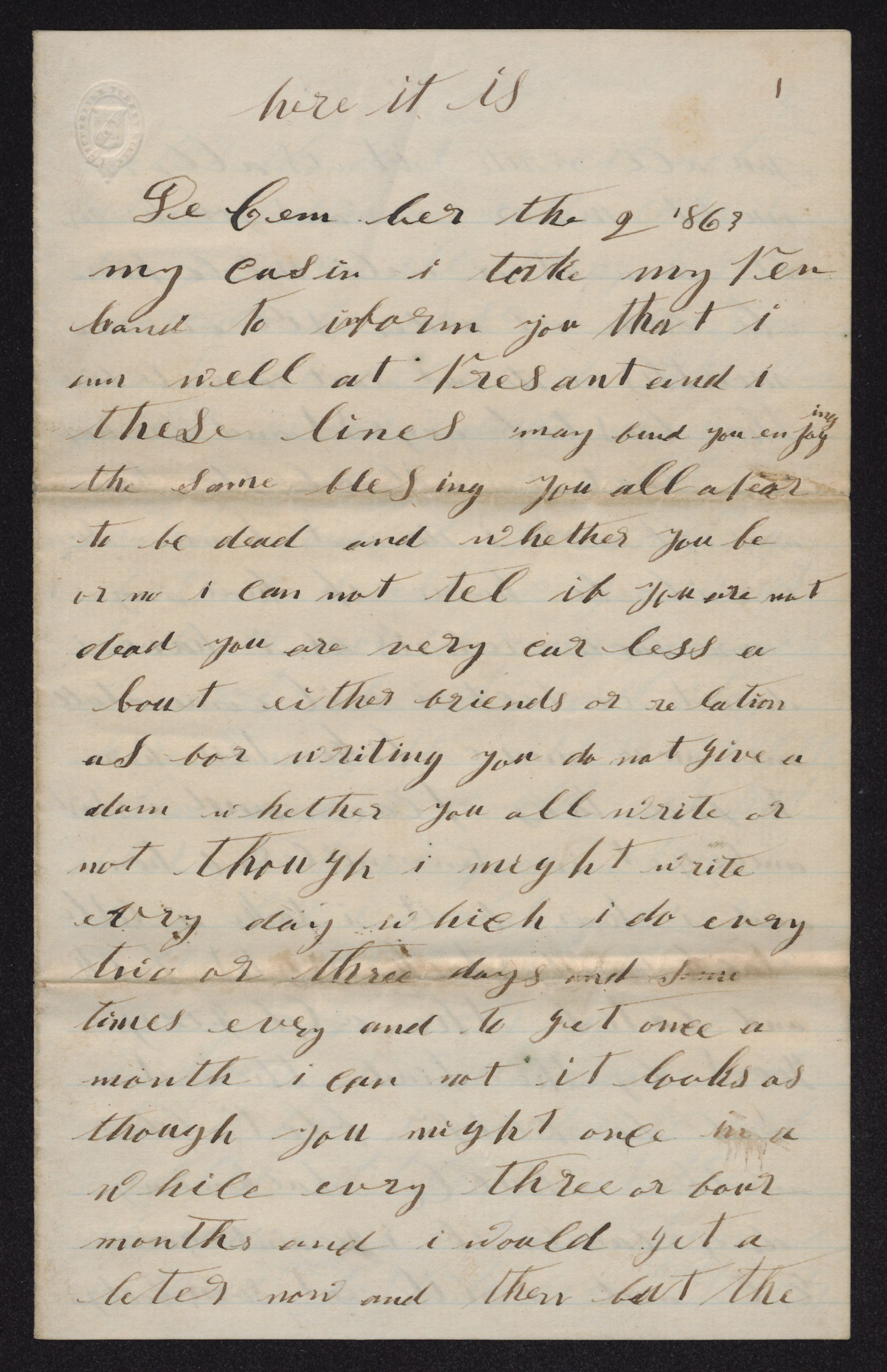I take my pen in hand to inform you that I am well at present and I ( ) these lines may find you enjoying the same blessing. You all afear to be dead and whether you be or no I can not tell if if you are not dead you are very careless about either friends or relation and for writing you do not give a damn whether you all write or not though I might write every day which I do every two or three days and sometimes every and to get once a month I can not it looks as though you might once in a while every
