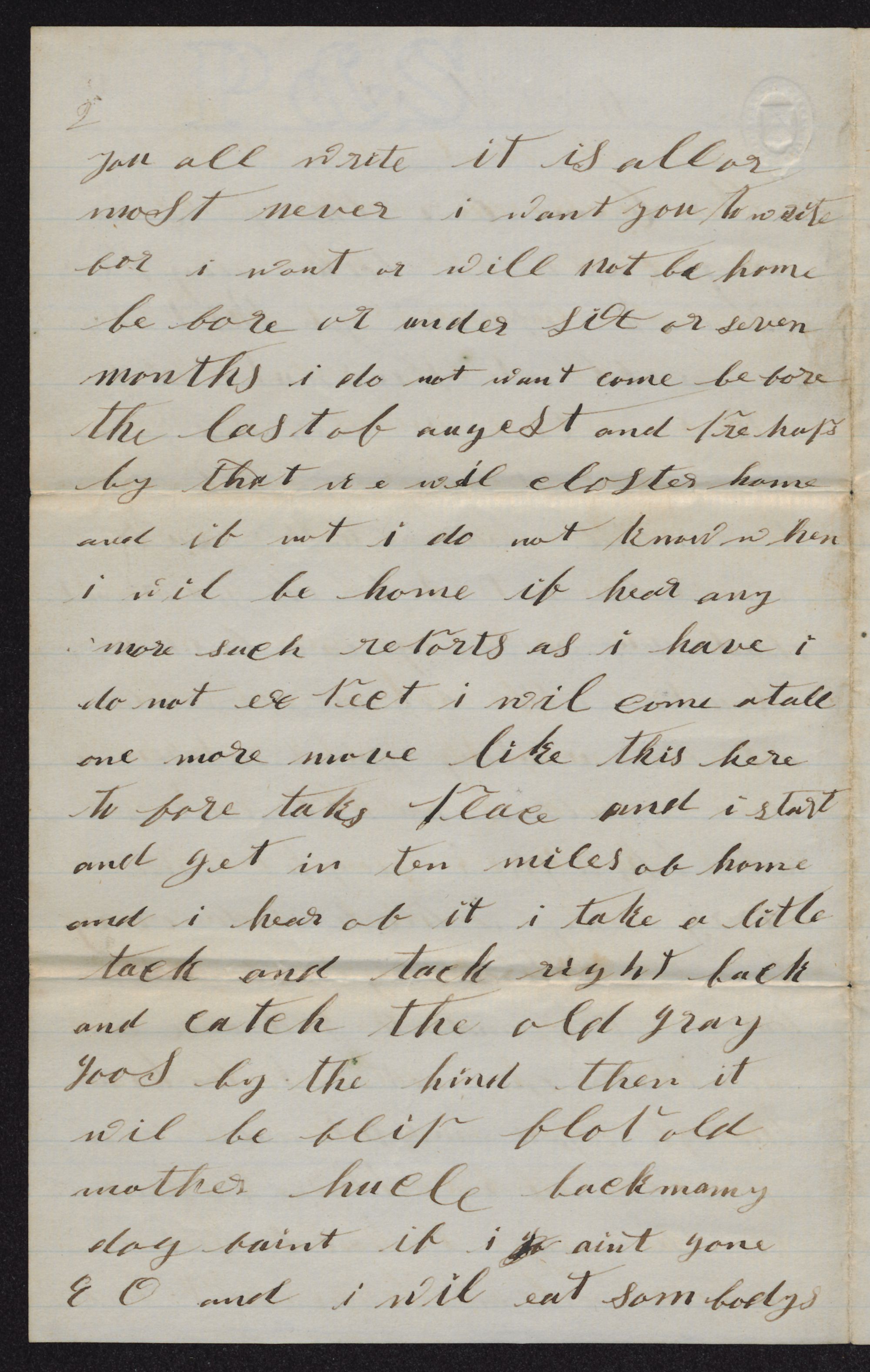 If-hear any more such reports as I have I do not expect I will come at all one more move like this heretofore takes place and I start and get in ten miles of home and I hear of it, I-take a little tack and tack right back and catch the old gray goose by the hind then 1t will be flip flop old mother huckle backmamy dog bait it I aint gone E.O. and I will eat somebody's