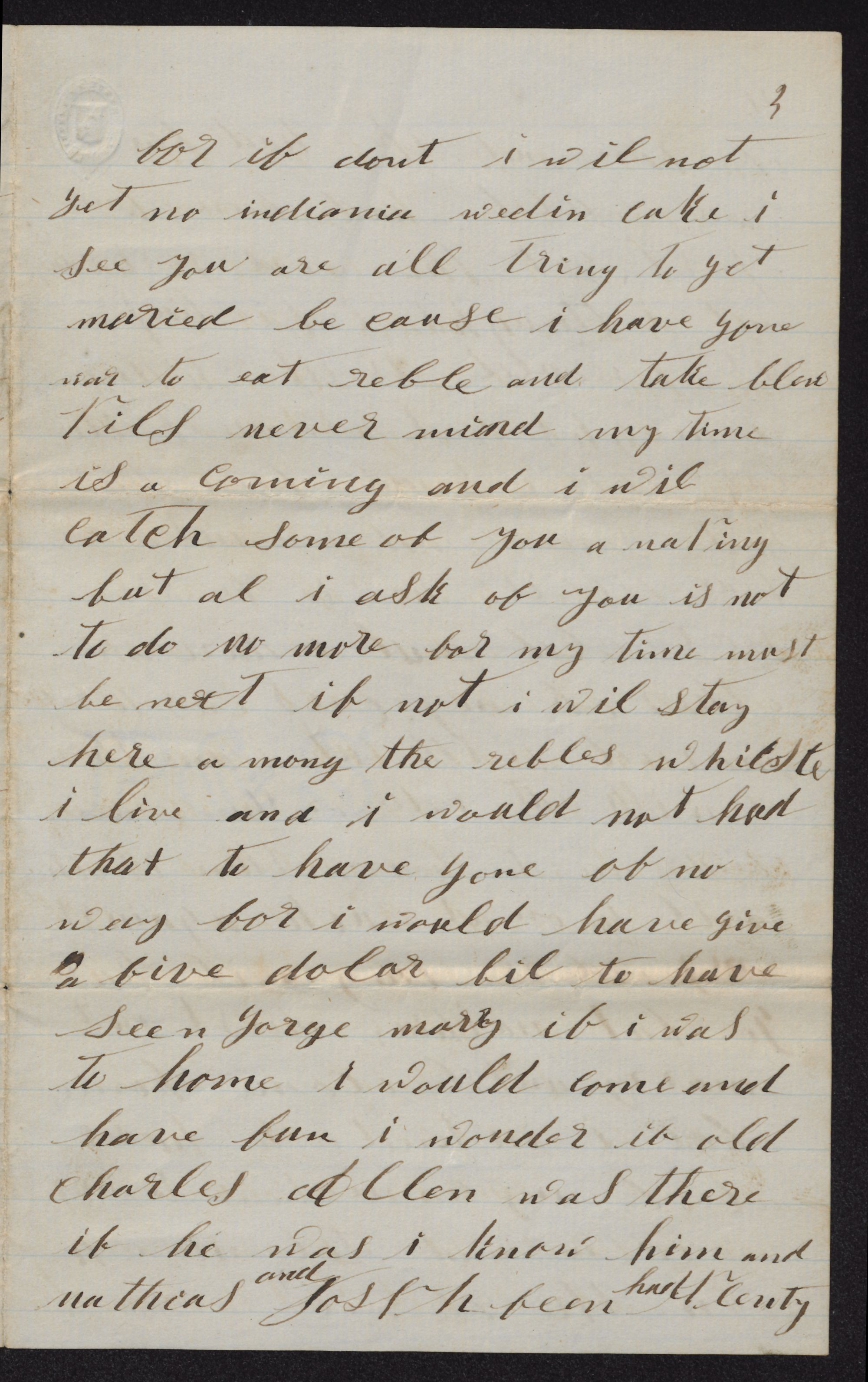 Never mind my time is a-coming and I will catch some of you a-napping but all I ask of you is not to do no more for my time must be next if not, I will stay here among the rebals which to live and I would not had that to have gone of no way for I would have given 2 five dollar bills to have seen George marry if I was to home I would come and have fun I wonder if old Charles Allen (?) was there if he was I know him and Mathias and Jos. P. Hapeen (?) had plenty