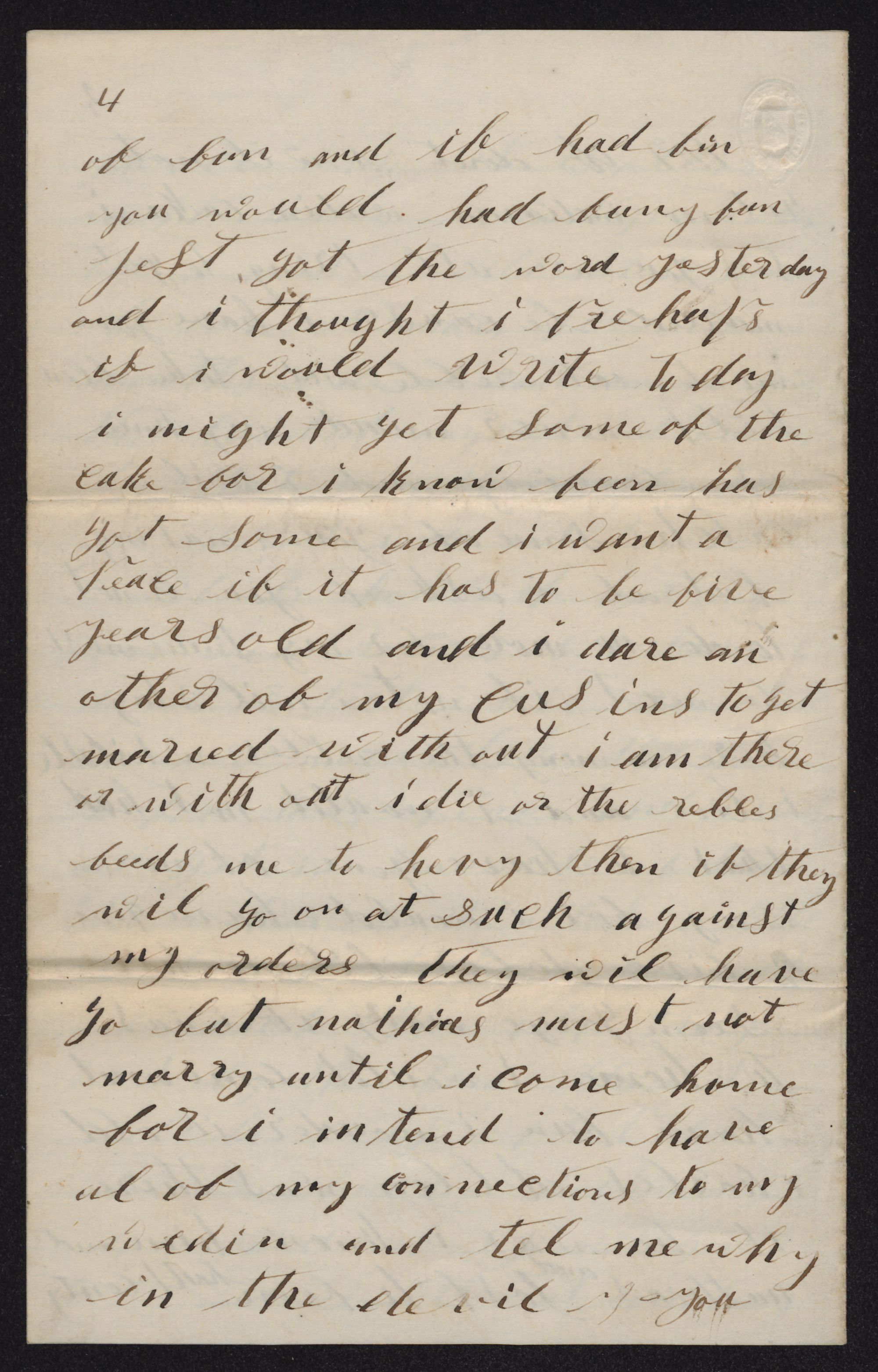 write today I might get some of the cake for I know (/) has got some and l want a piece of it has to be five years old and I dare another of my cousins to get married without I am there or without I die or the rebbals feeds me too heavy then then if they will go on at such against my orders they will have to but Mathias must not marry until I come home for I intend to have all of my connections to my wedding