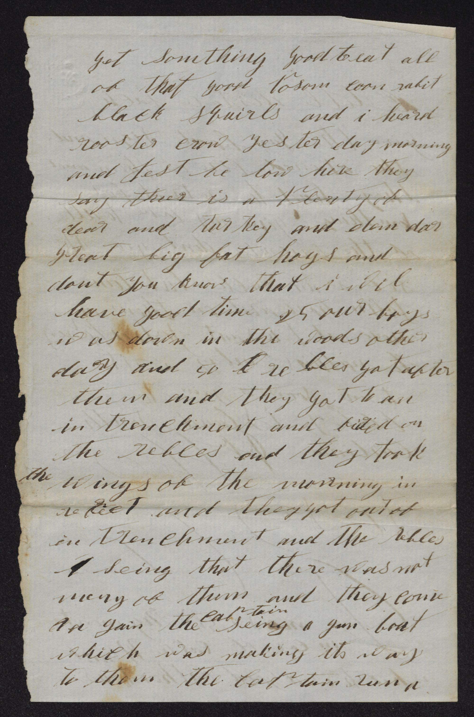 got something good to eat all of that good possum, coon, rabbit, black squirrel and I heard rooster crow yesterday morning and just below here they (line covered up)deer and turkey and dem dar great big fat hogs and don't you know that I will have good times. 25 our boys was down in the woods other day and rebals got after them and they got to an intrenchment and fired on the rebals and they took the wings of the morning in retreat and they got out of intrenchment and the rebels seeing that there was not many of them and they come again. The captain seeing a gunboat which was making its way to them the captain run