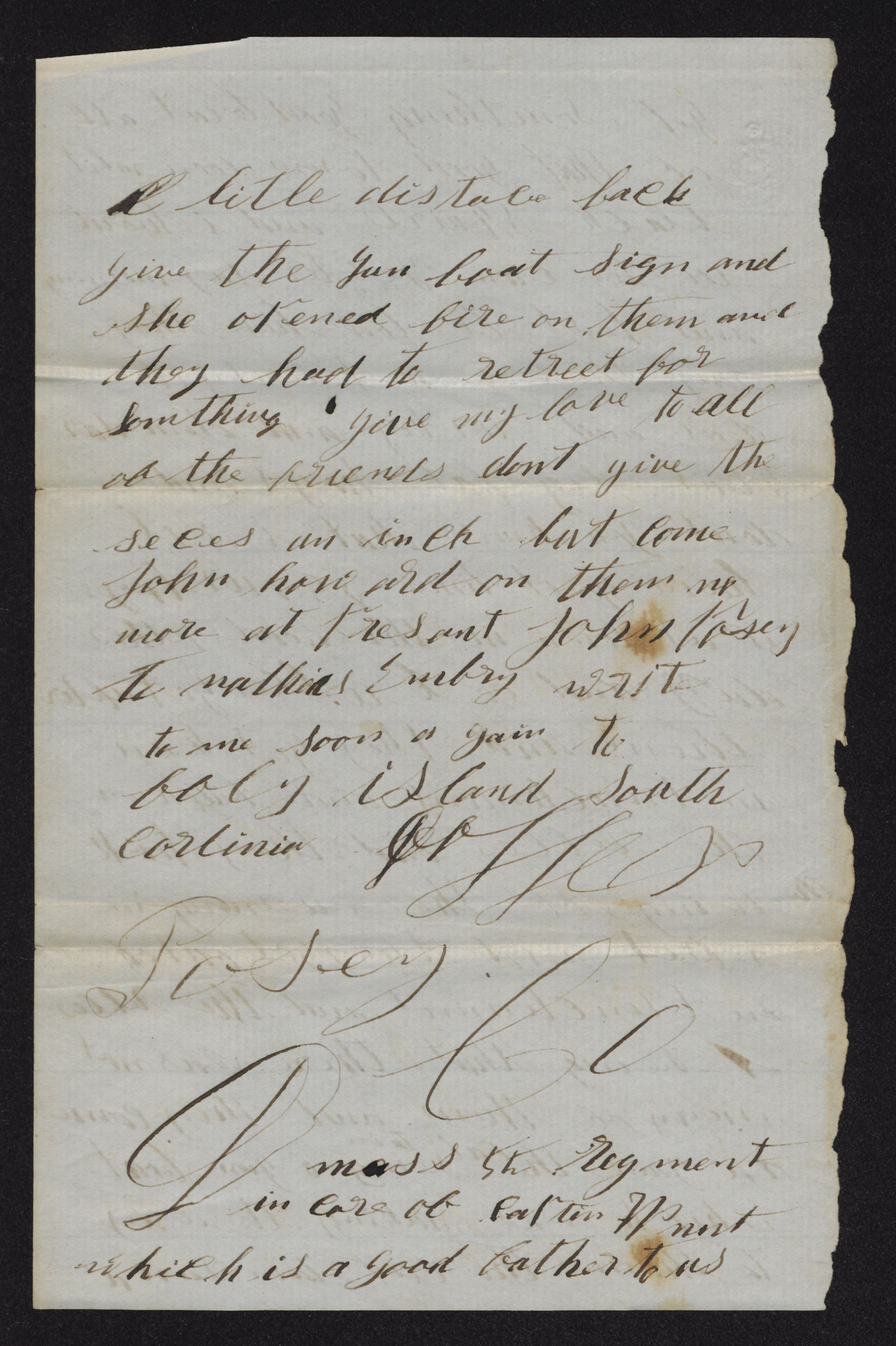 John Posey, Company J, Mass. 5th Regiment, in care of Captain W nnt who is a good father to us.