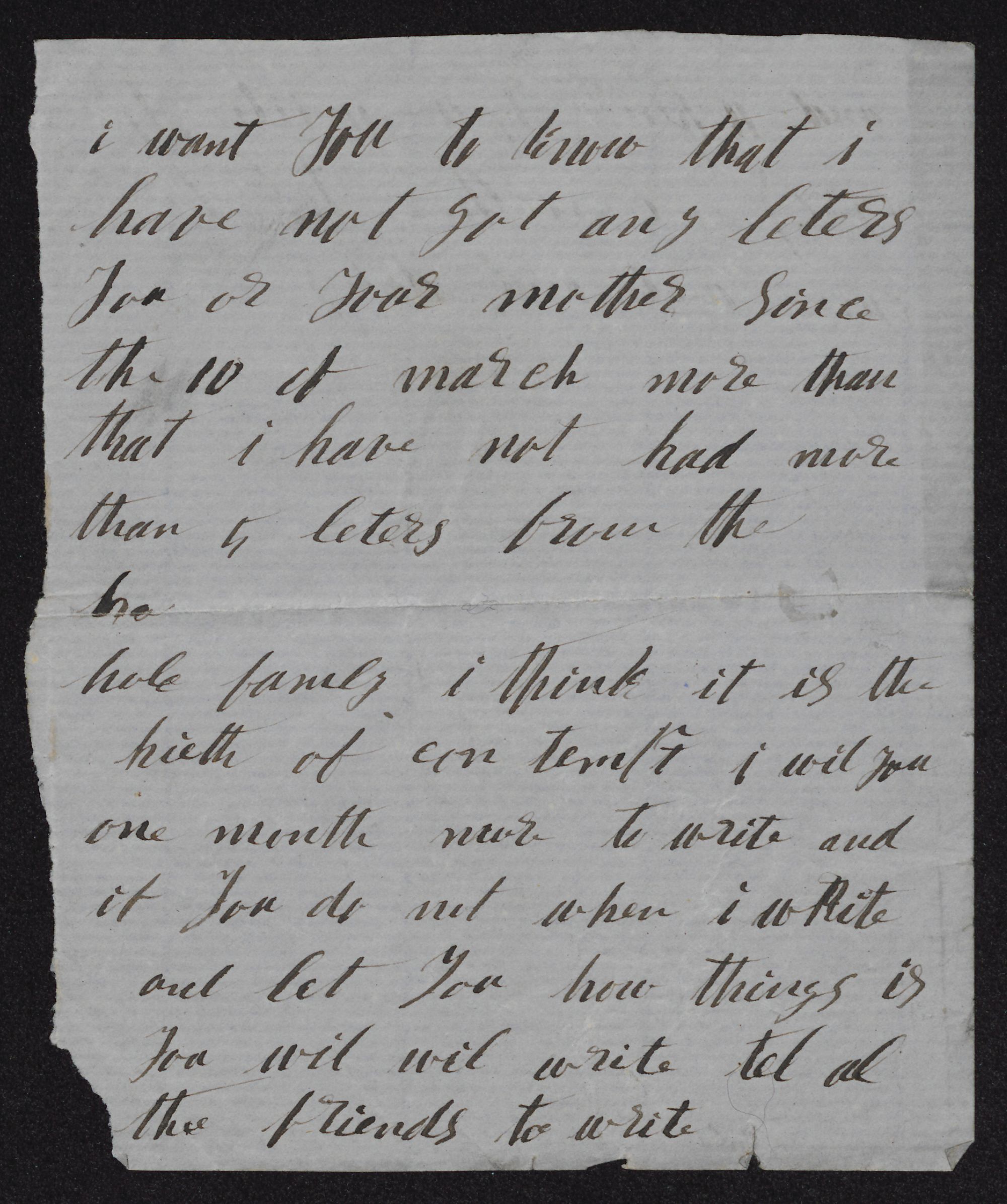 I want you to know that I have not got any letters you or your mother since the 10th of March more than that I have not had more than 4 letters from the whole family, I think it is the height of contempt. I will give you one month more to write and if you do not when I write and tell you how things is you will write tell all the friends to write