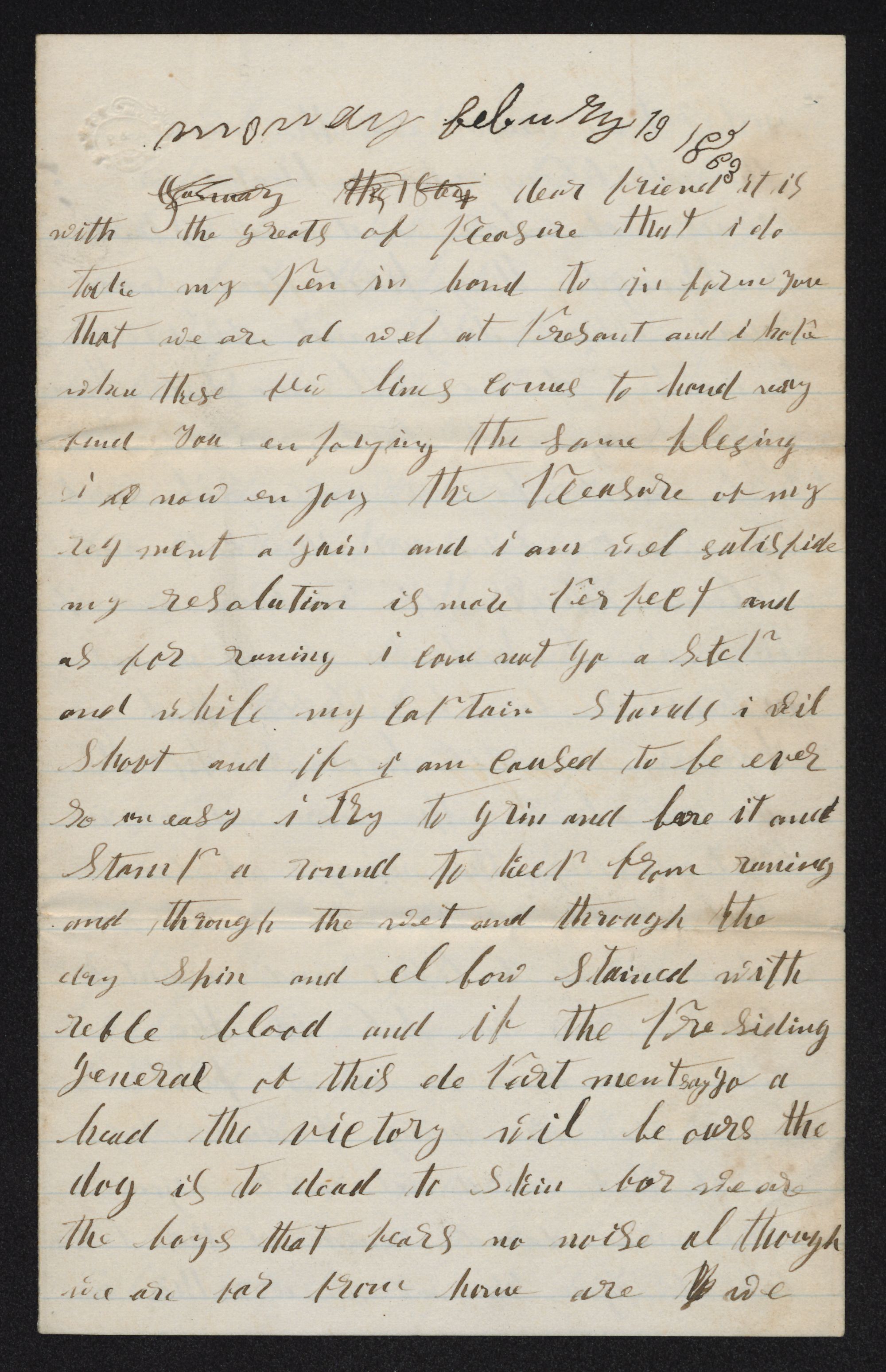 Dear friend: It is with the greatest of pleasure that I do take my pen in hand to inform you that we are all well at present and I hope when these few lines come to hand may find you enjoying the same blessing. I now enjoy the pleasure of my regiment again and I am well satisfied my resolution is made perfect and as for running I cannot go a step and while my Captain stands I will shoot and if I am caused to be ever so Uneasy 1 try to grin and bear it and stamp around to keep from running and through the wet and through the dry , shin and elbow stained with rebel blood and if the presiding general of this department says go ahead, the victory will be ours the dog is too dead to skin for we are the boys that fear no noise although we are far from home we are