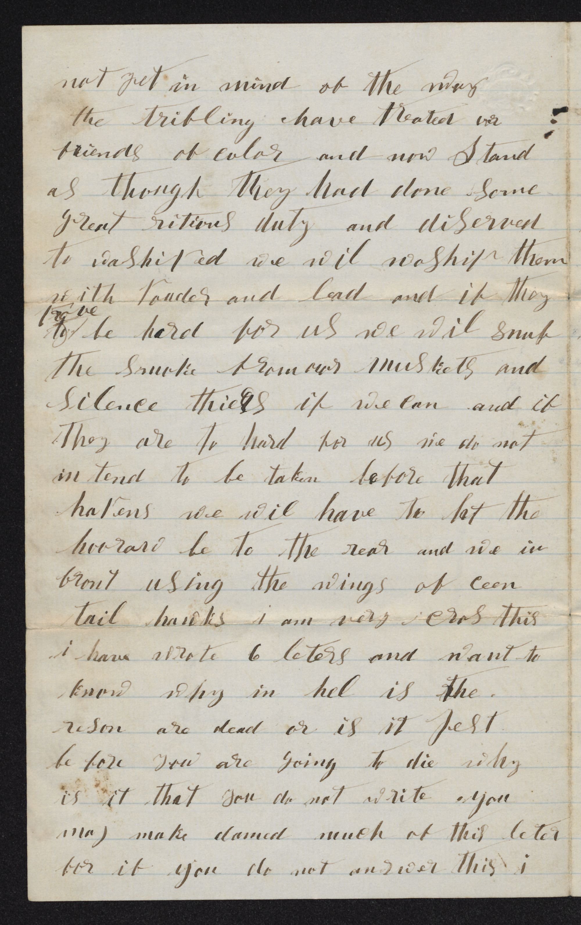 not yet in mind of the way the tribling have treated we friends of color and now stand as though they had done some great righteous duty and deserved to worshiped we will worship them with powder and lead and if they prove to be hard for us we will snuff the smoke from our muskets and silence theirs if we can and if they are too hard for us, we do not intend to be taken, before that happens we will have to let the h to the rear and we in front using the wings of contrail hawks
