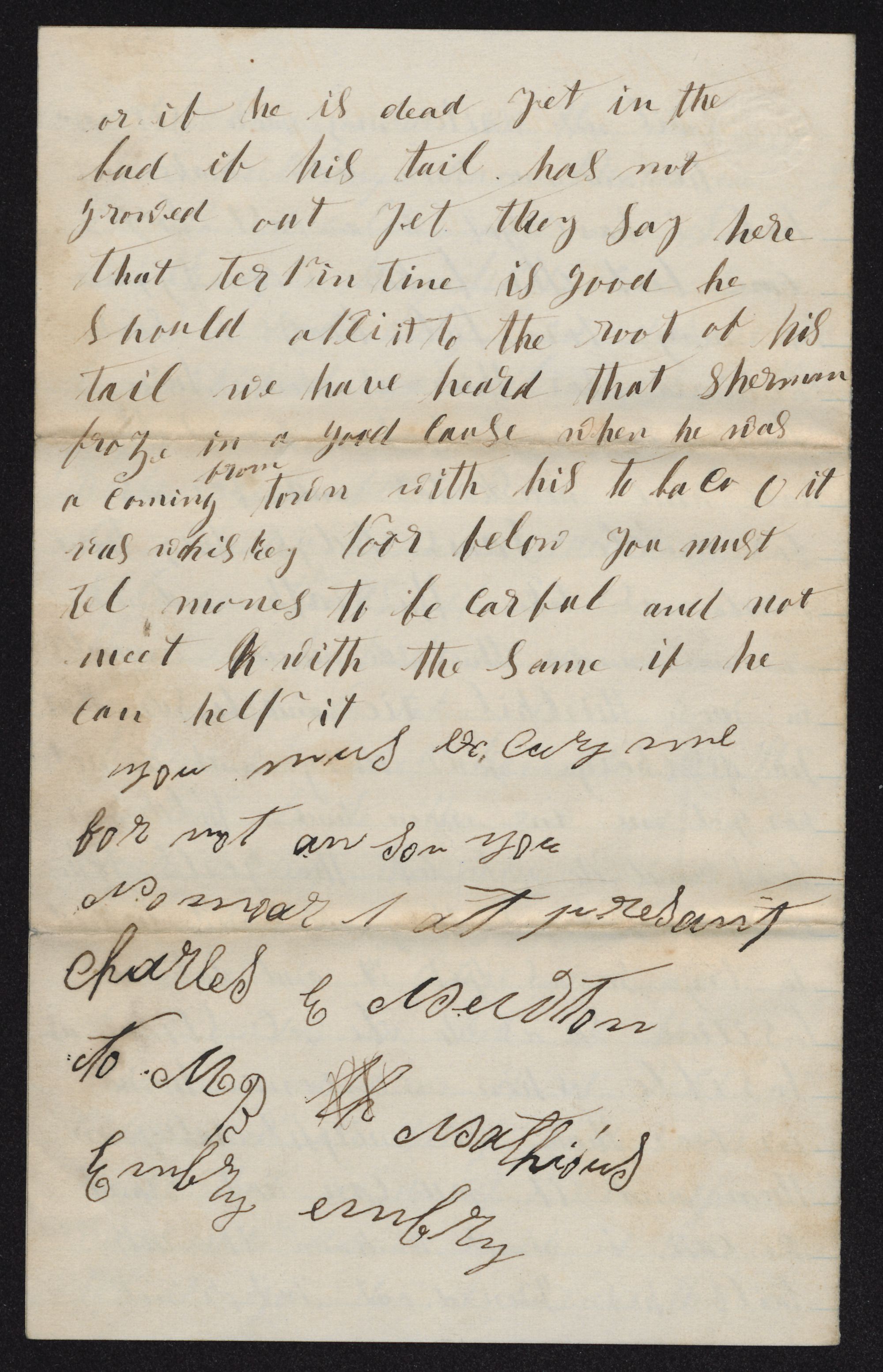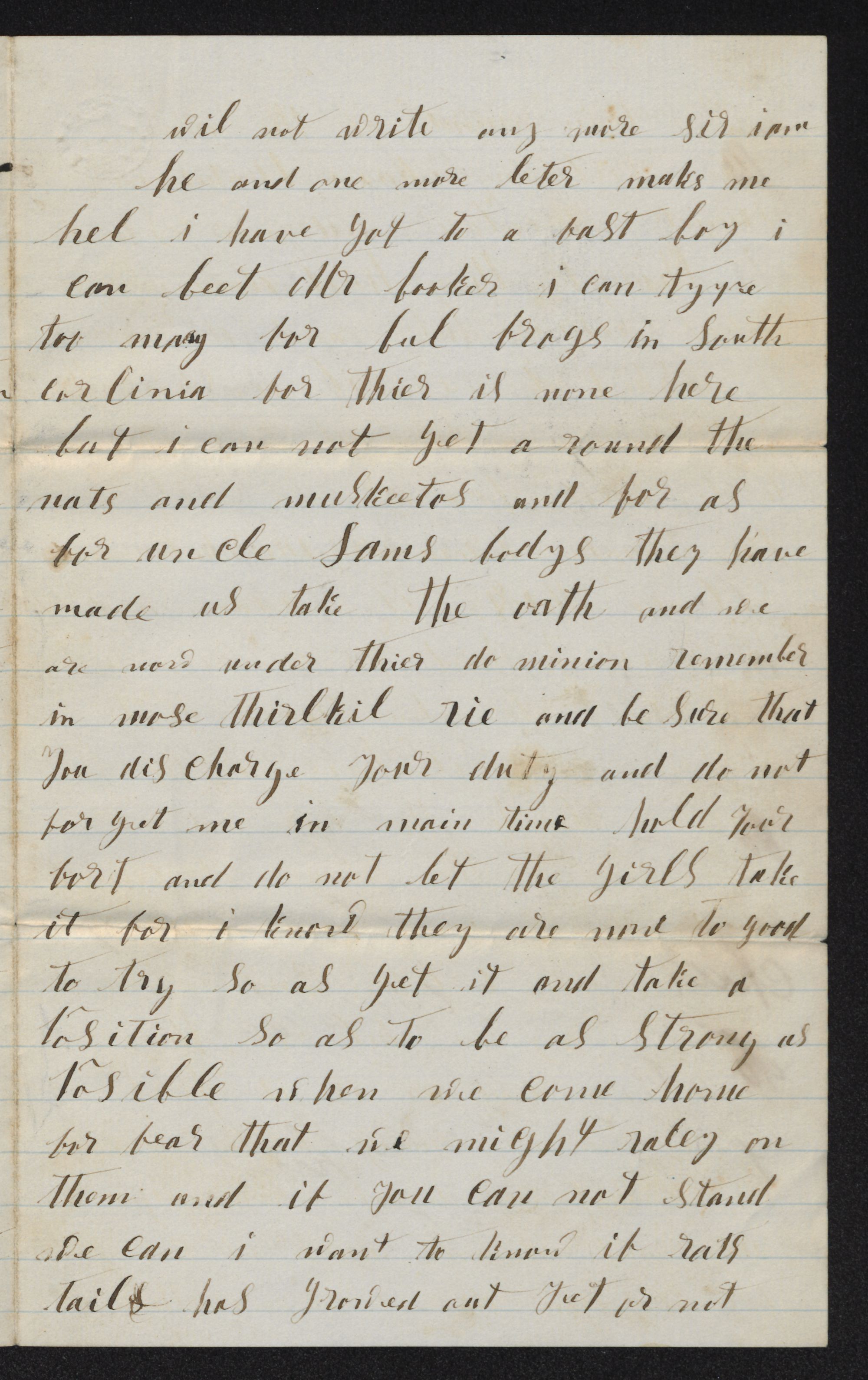 will not write any more. Sir, I am he and one more: letter makes me Hell, I have go9t a fast boy (?) I can beat the ( bull frogs if South: Carolina for there is none here. But I cannot get around the gnats and mosquitoes and far as for Uncle Sam's bullies (?) they have made us take the oath and ae are now under their dominion remember in Mose Thirlkil Rie (?) and be sure that you discharge your duty and do not forget me in meantime hold your fort and do not let the girls take it for I know they are none too good to try so as get it and take position so as be as strong