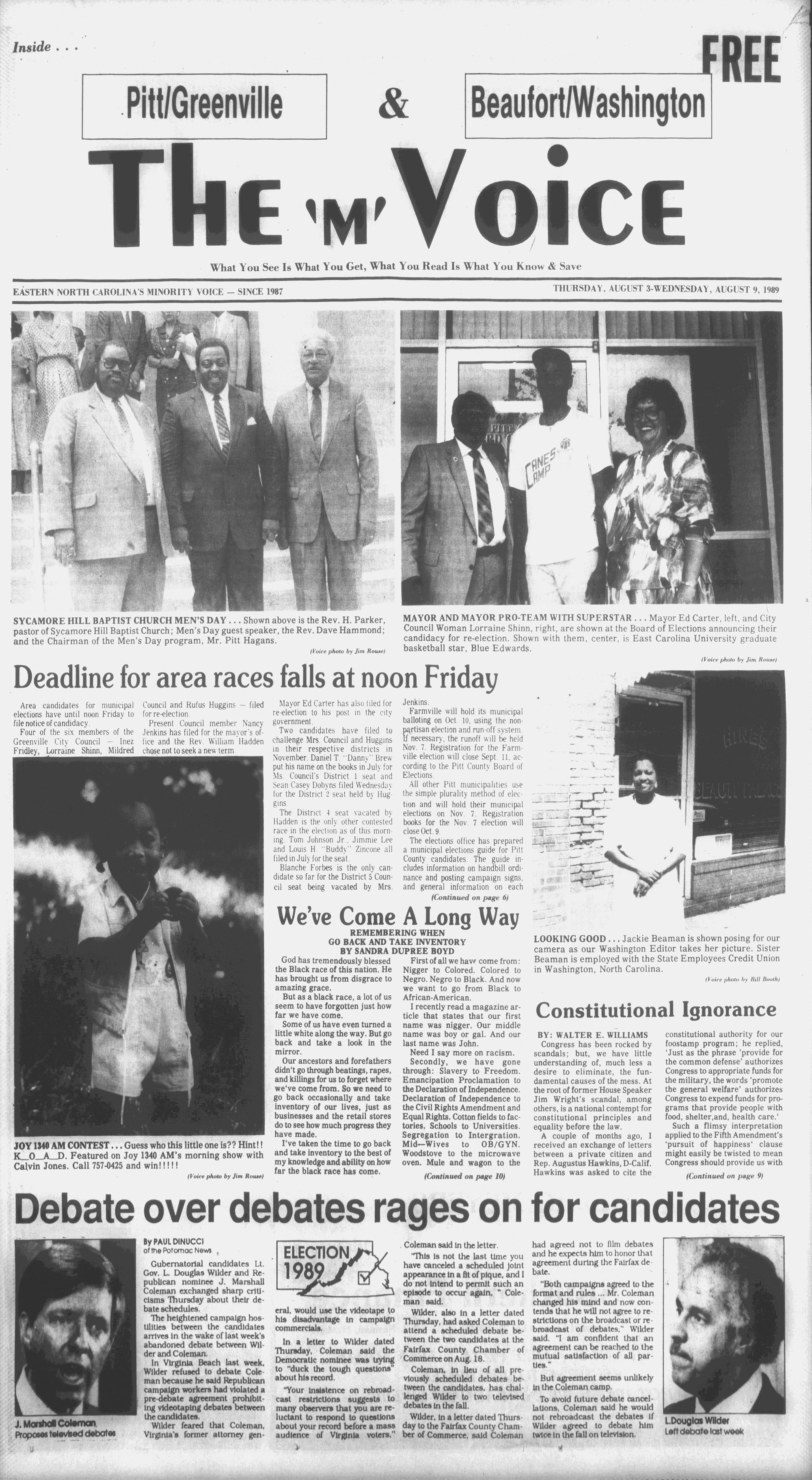 The 'M' voice : Eastern North Carolina's minority voice-since 1987. Greenville. N.C. : Minority Voice, inc. James Rouse, Jr. (1942-2017), began publication of The "M" Voice in 1987 with monthly issues published intermittently until 2010. At different times, the paper was also published as The "M"inority Voice and The Minority Voice. It focused on the Black community in Eastern North Carolina.