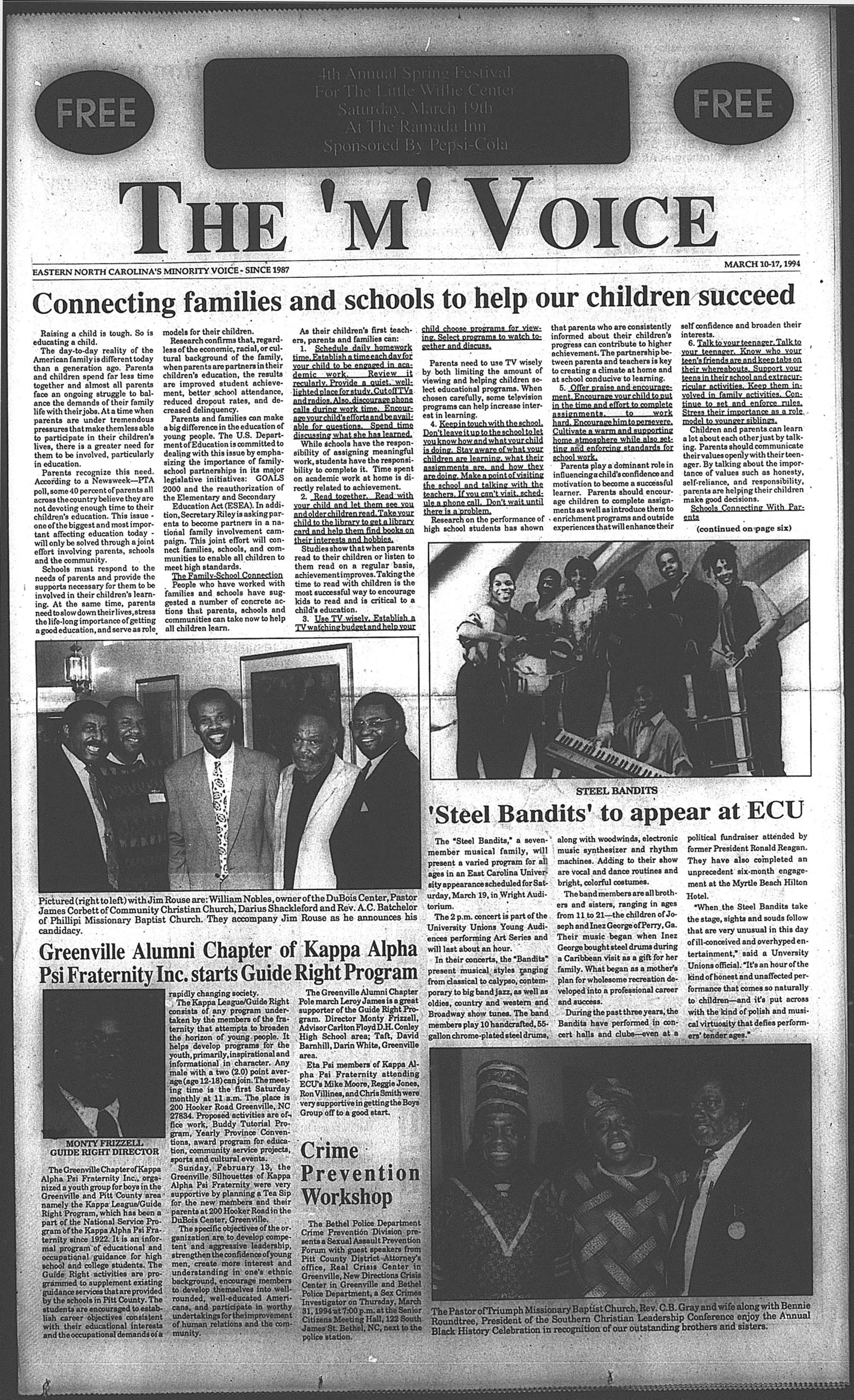The 'M' voice : Eastern North Carolina's minority voice-since 1987. Greenville. N.C. : Minority Voice, inc. James Rouse, Jr. (1942-2017), began publication of The "M" Voice in 1987 with monthly issues published intermittently until 2010. At different times, the paper was also published as The "M"inority Voice and The Minority Voice. It focused on the Black community in Eastern North Carolina.