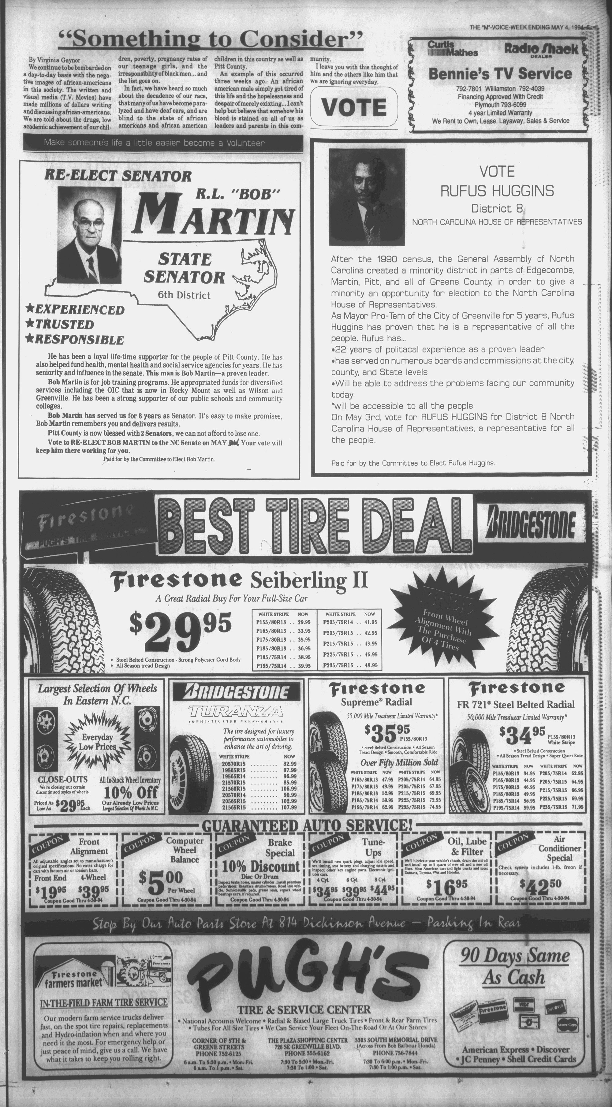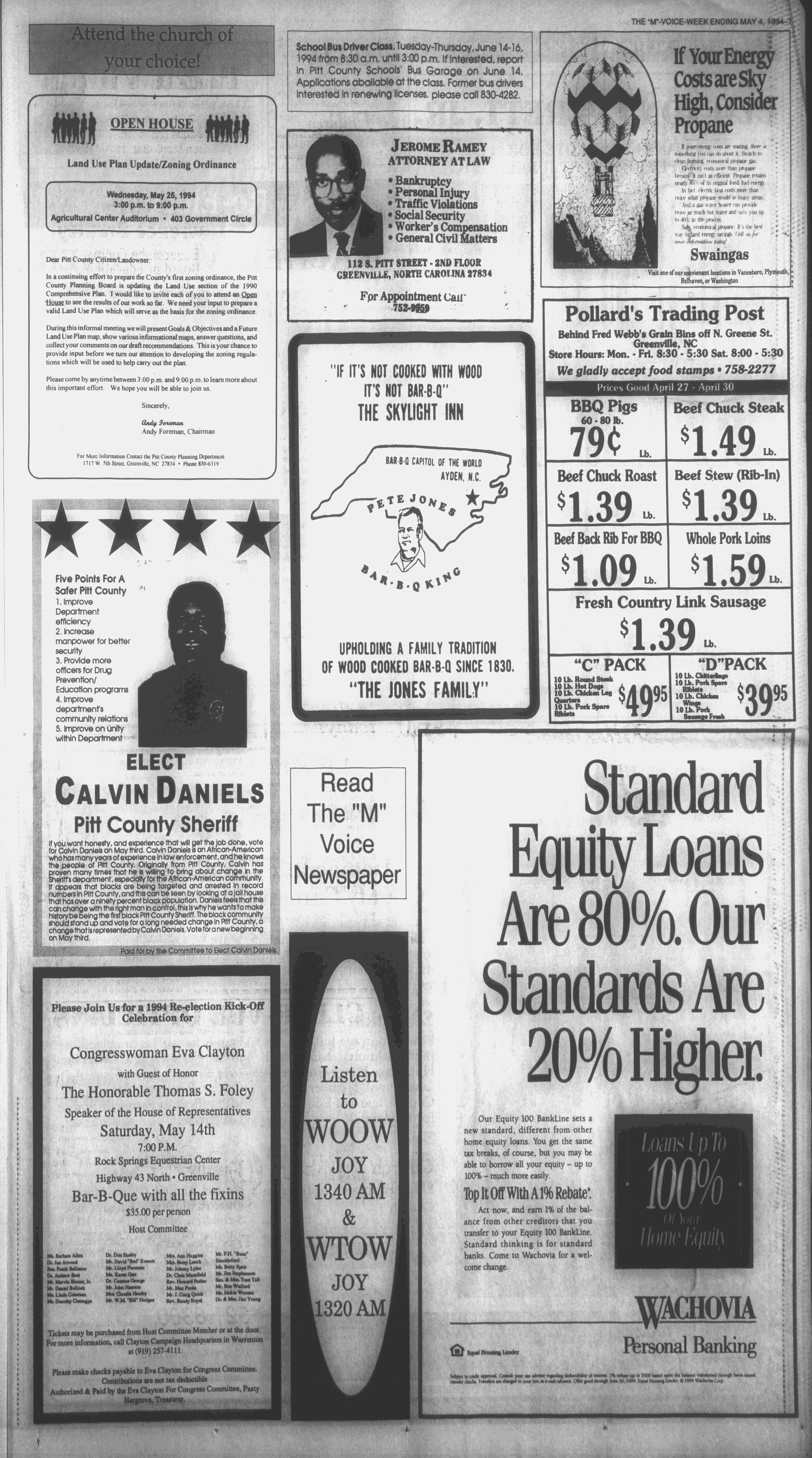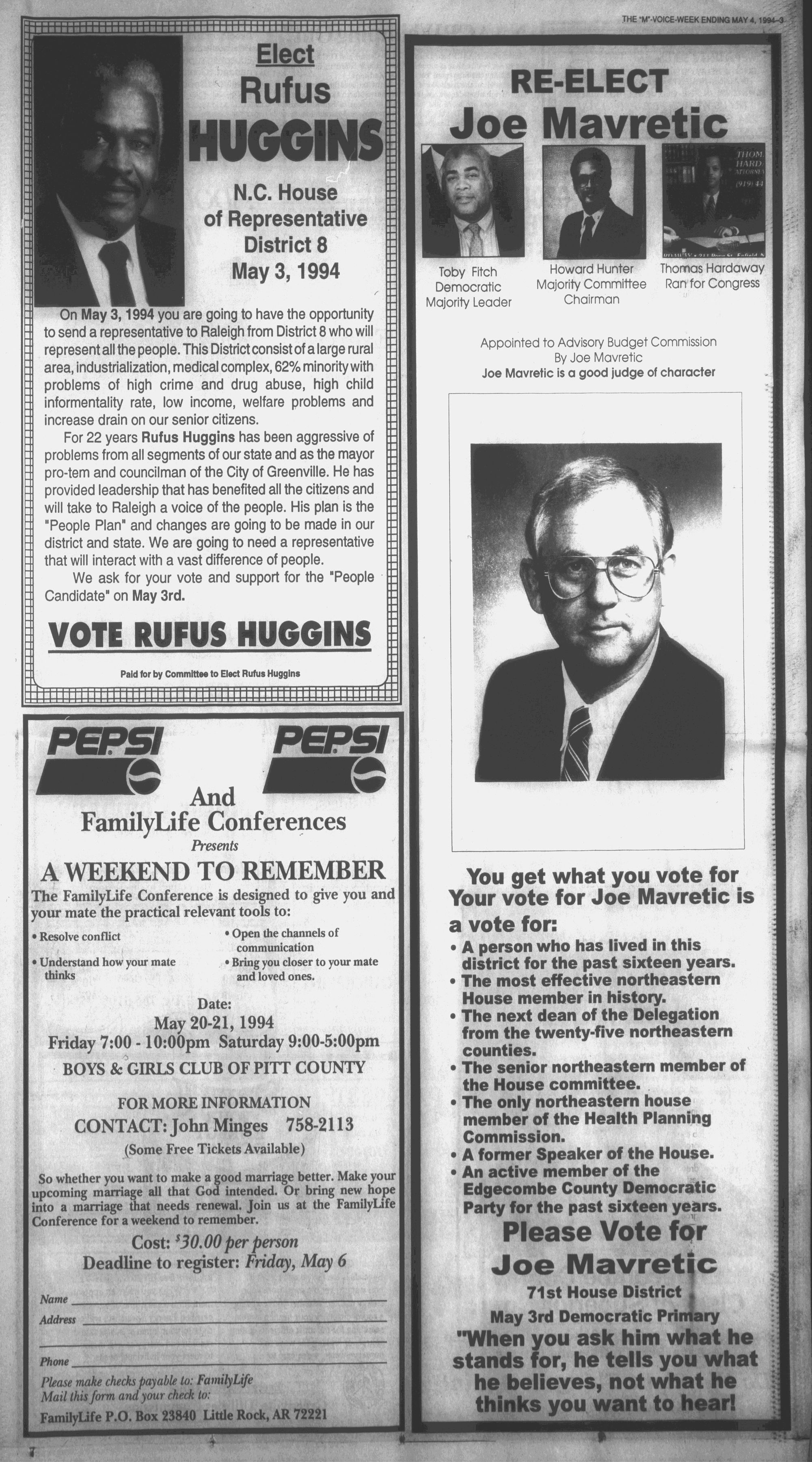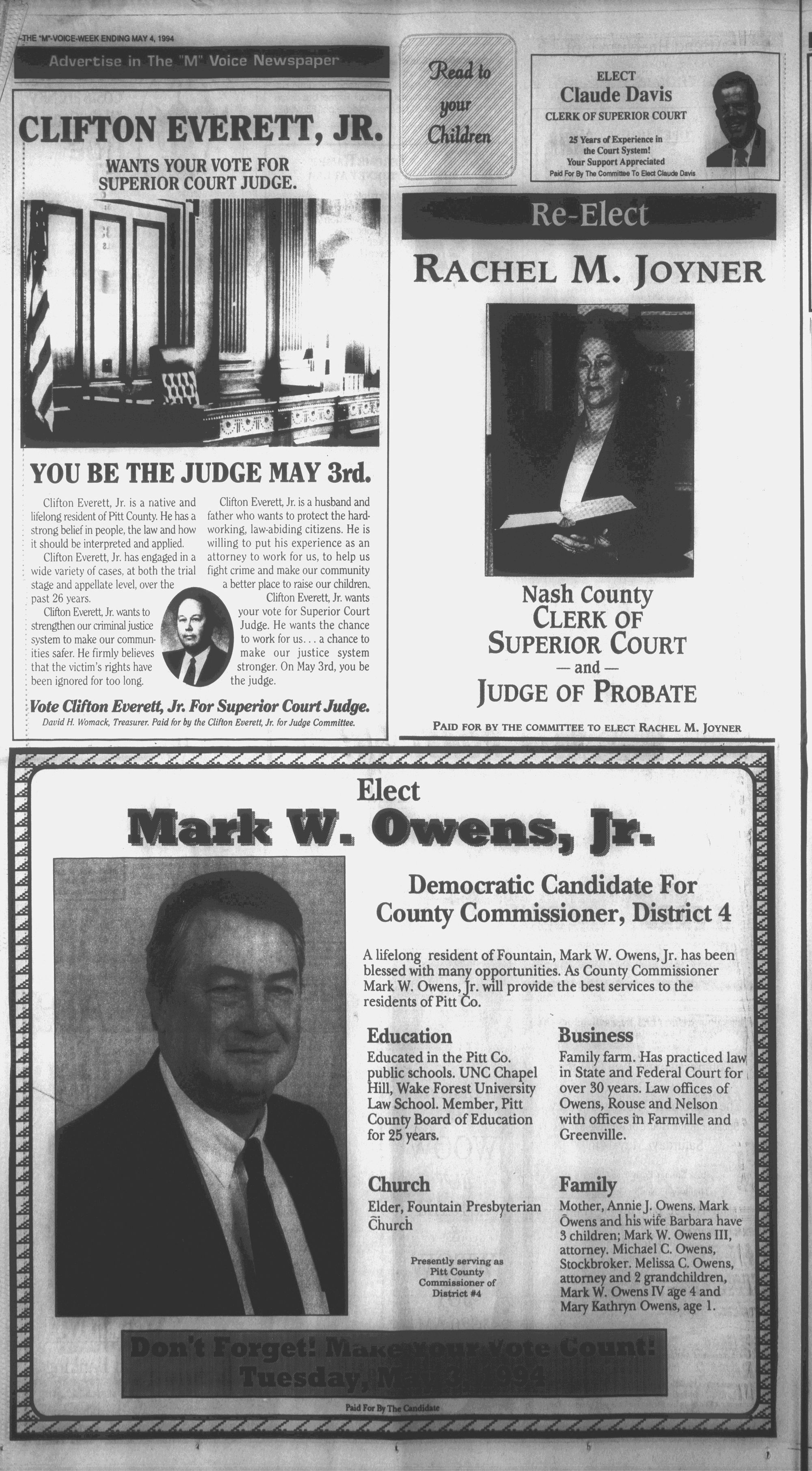 The 'M' voice : Eastern North Carolina's minority voice-since 1987. Greenville. N.C. : Minority Voice, inc. James Rouse, Jr. (1942-2017), began publication of The "M" Voice in 1987 with monthly issues published intermittently until 2010. At different times, the paper was also published as The "M"inority Voice and The Minority Voice. It focused on the Black community in Eastern North Carolina.