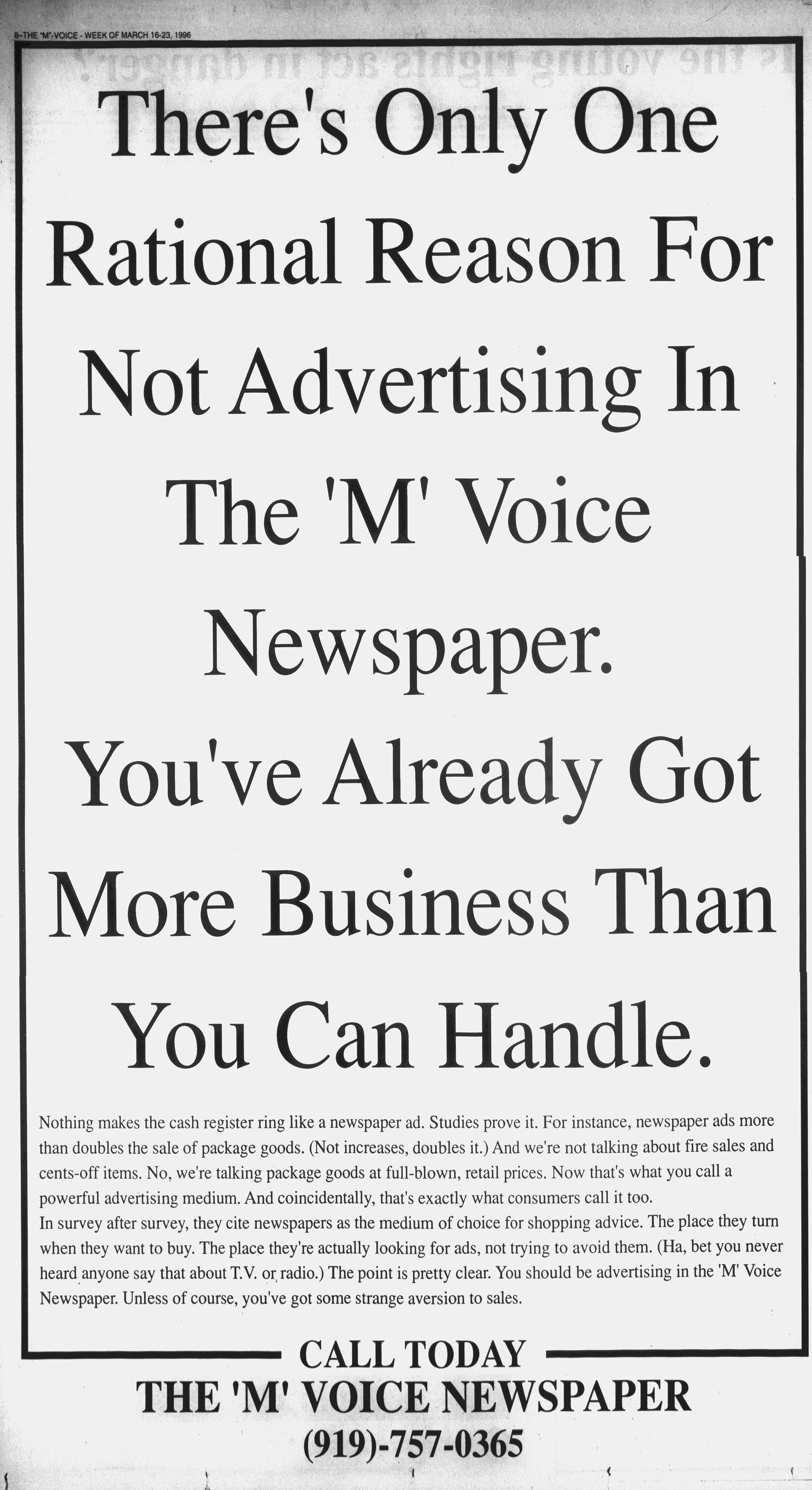 heard anyone say that about T.V. or radio.) The point is pretty clear. You should be advertising in the "M' Voice