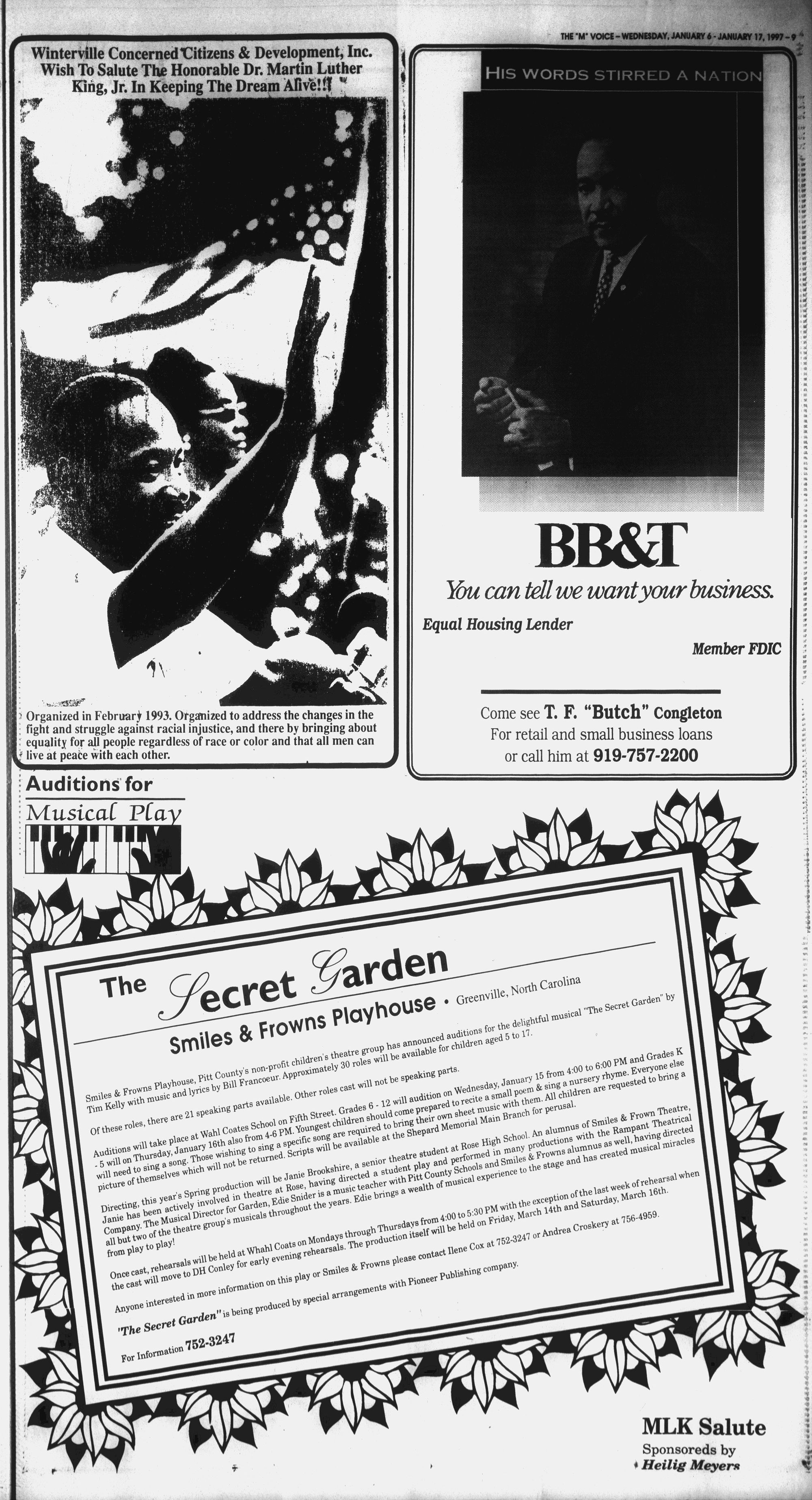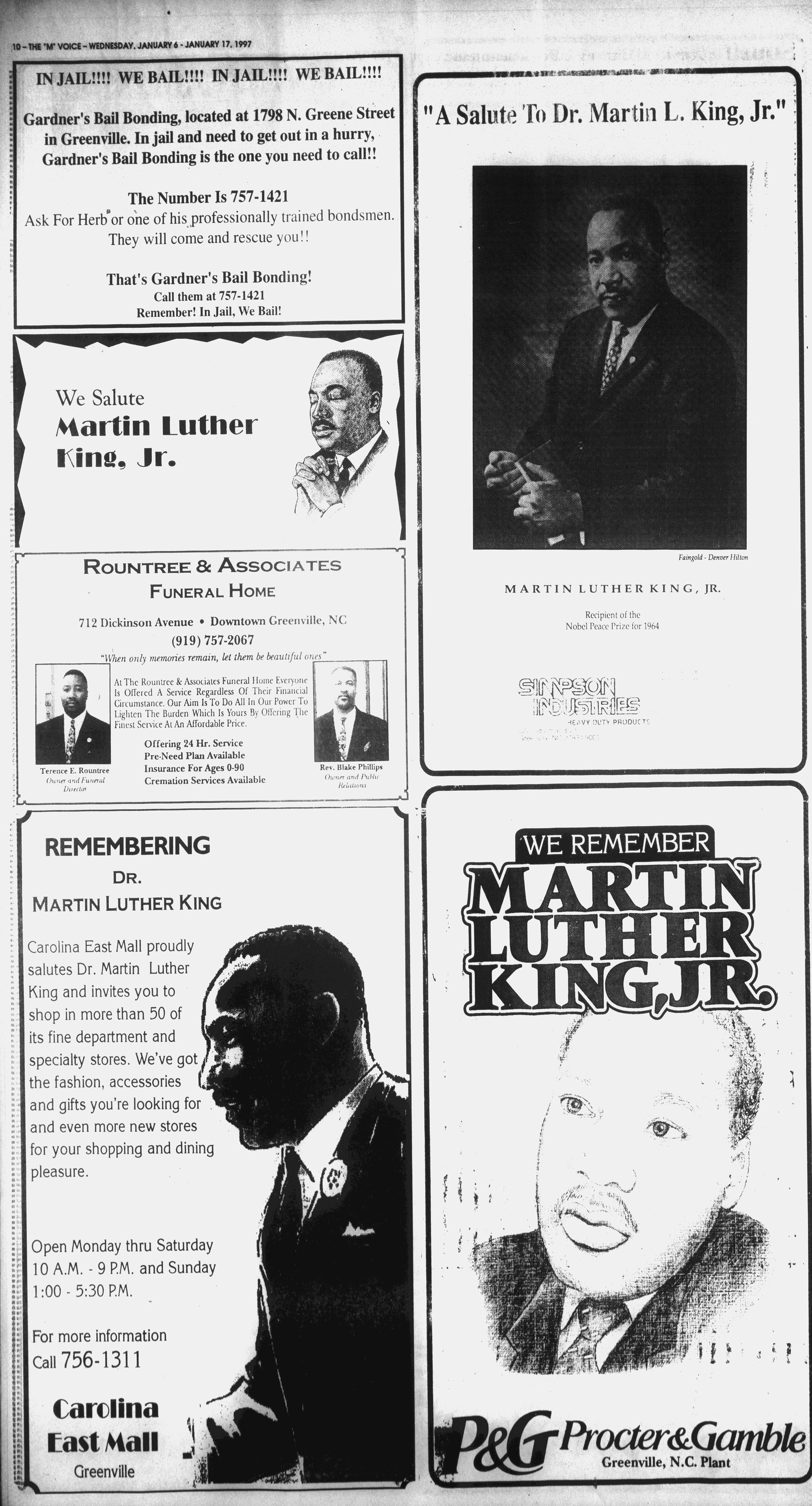 The 'M' voice : Eastern North Carolina's minority voice-since 1987. Greenville. N.C. : Minority Voice, inc. James Rouse, Jr. (1942-2017), began publication of The "M" Voice in 1987 with monthly issues published intermittently until 2010. At different times, the paper was also published as The "M"inority Voice and The Minority Voice. It focused on the Black community in Eastern North Carolina.