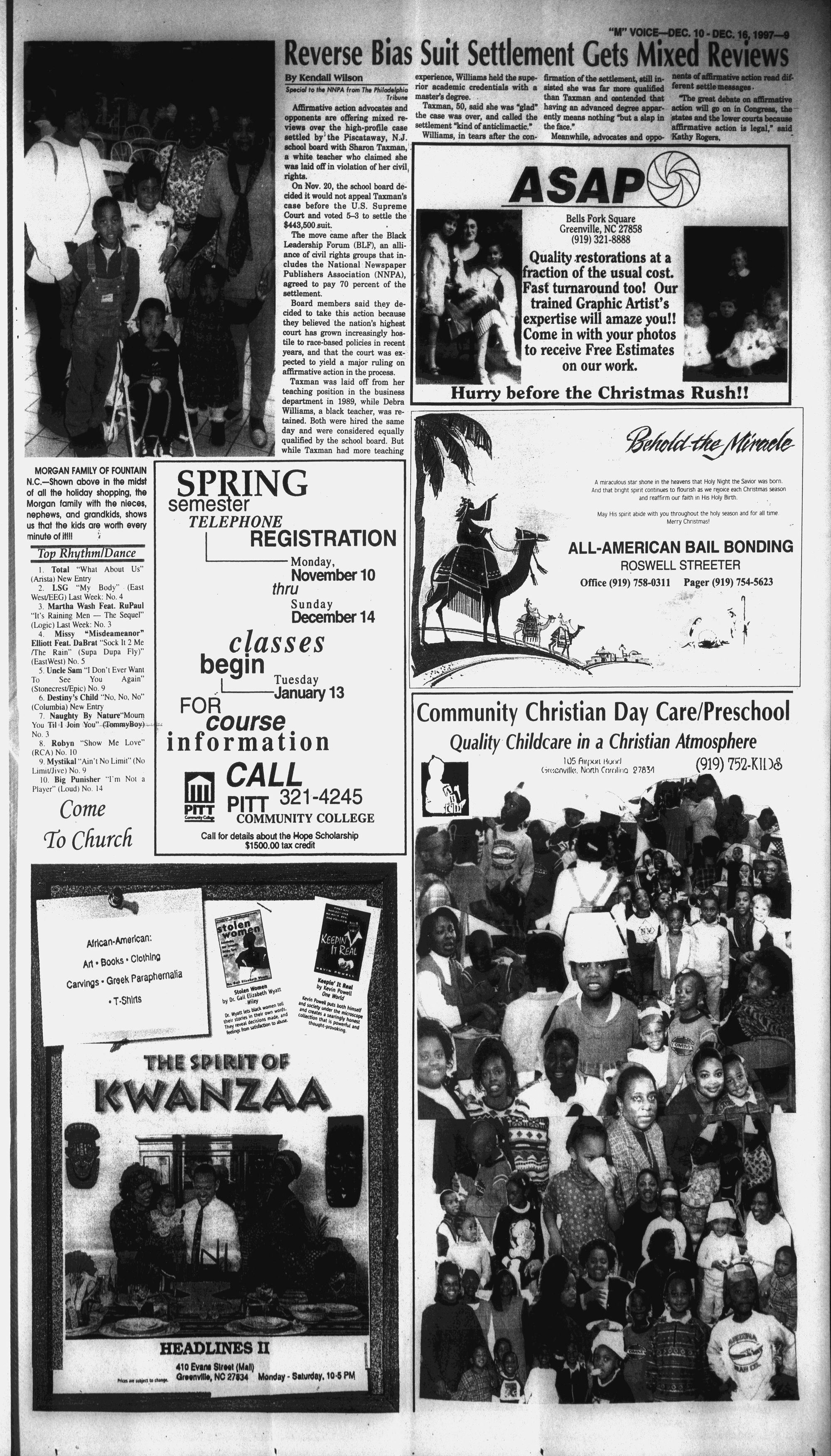 The 'M' voice : Eastern North Carolina's minority voice-since 1987. Greenville. N.C. : Minority Voice, inc. James Rouse, Jr. (1942-2017), began publication of The "M" Voice in 1987 with monthly issues published intermittently until 2010. At different times, the paper was also published as The "M"inority Voice and The Minority Voice. It focused on the Black community in Eastern North Carolina.