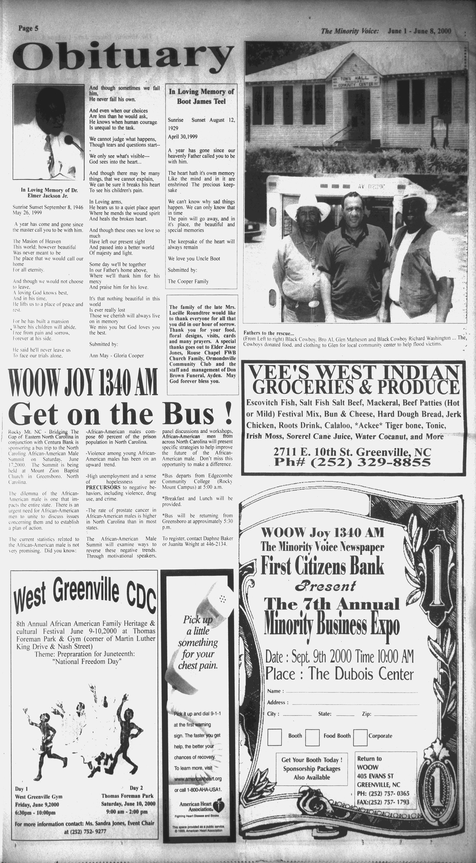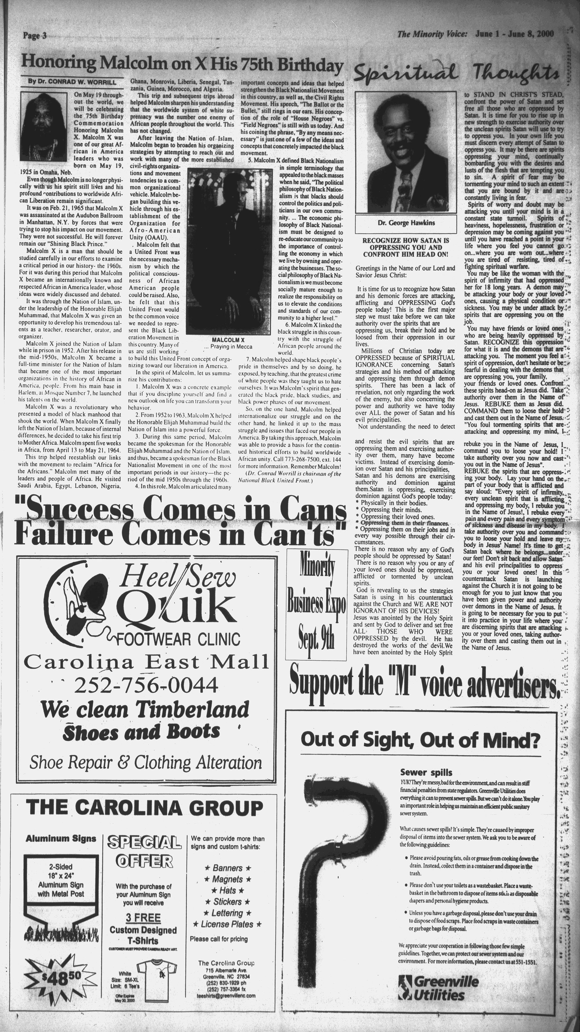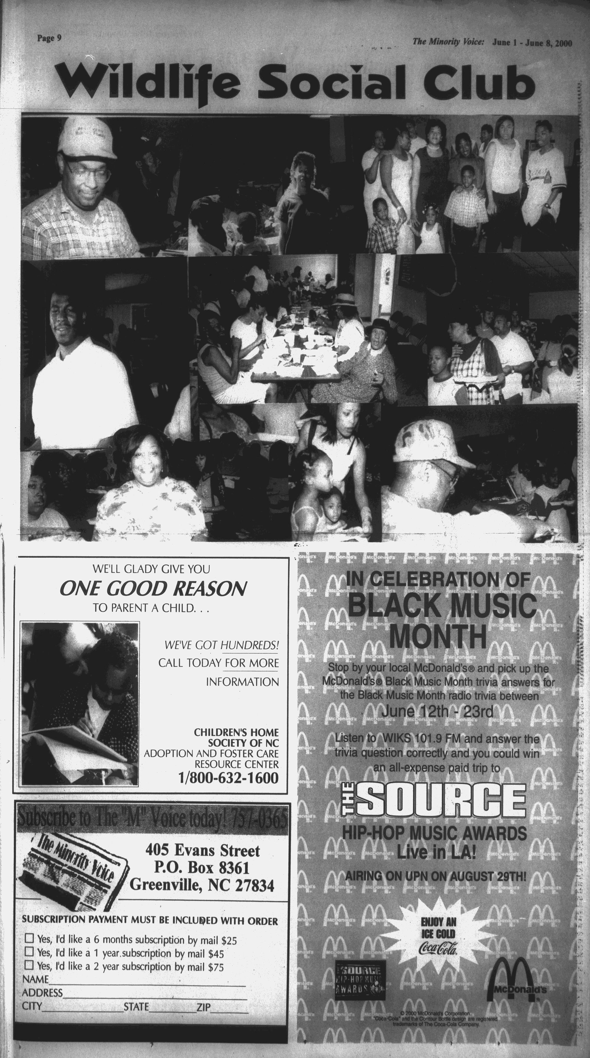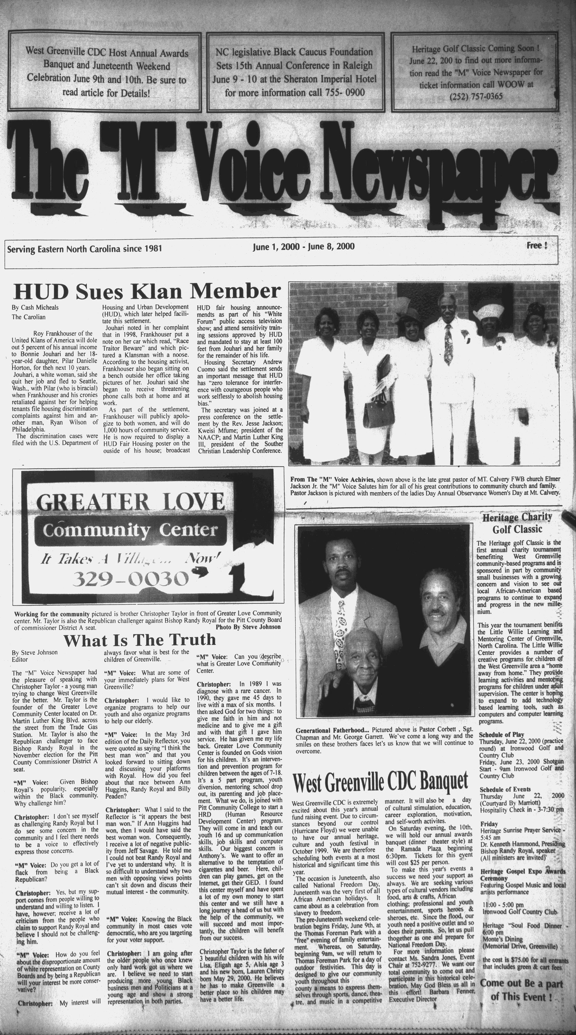 The 'M' voice : Eastern North Carolina's minority voice-since 1987. Greenville. N.C. : Minority Voice, inc. James Rouse, Jr. (1942-2017), began publication of The "M" Voice in 1987 with monthly issues published intermittently until 2010. At different times, the paper was also published as The "M"inority Voice and The Minority Voice. It focused on the Black community in Eastern North Carolina.