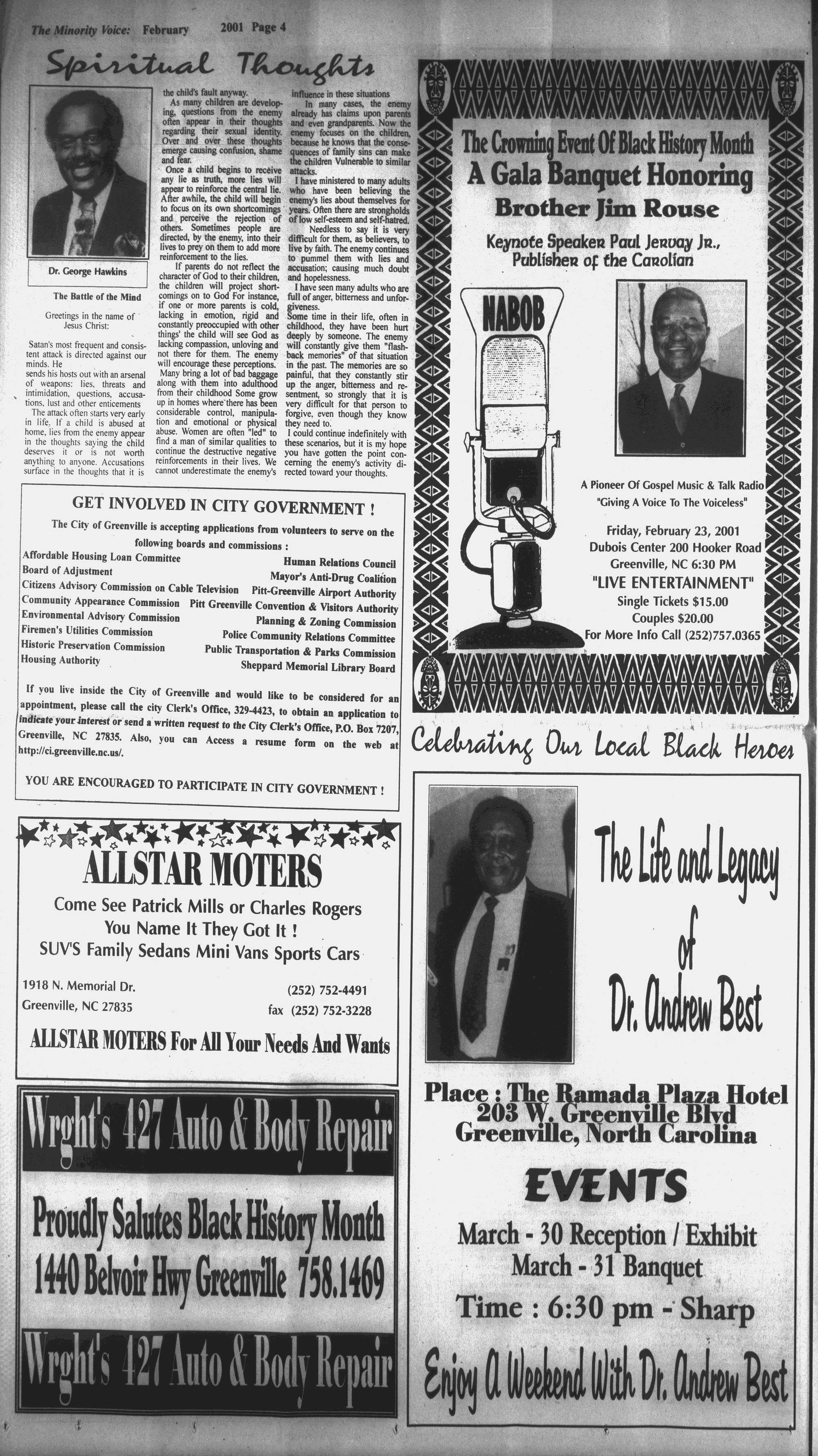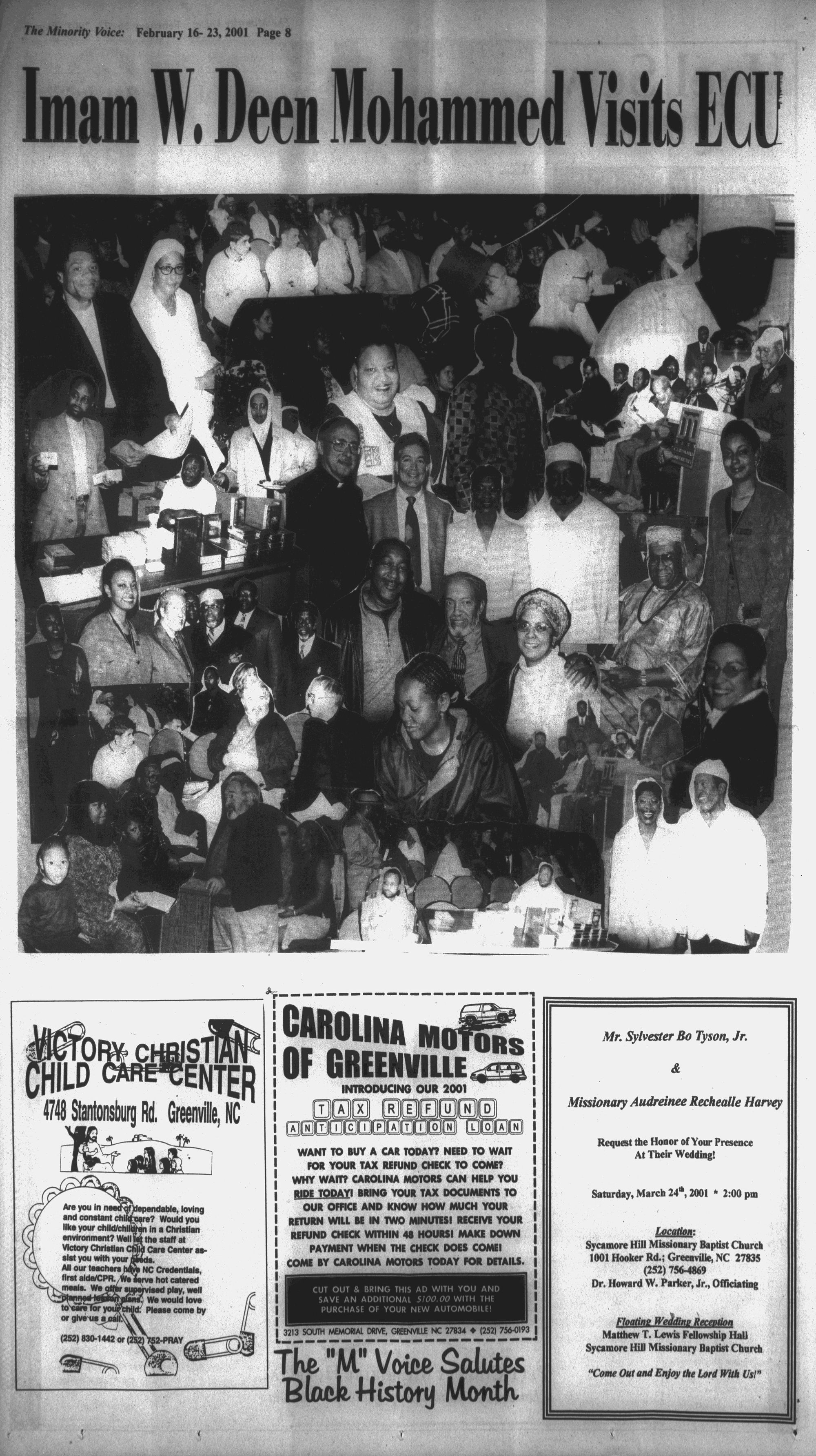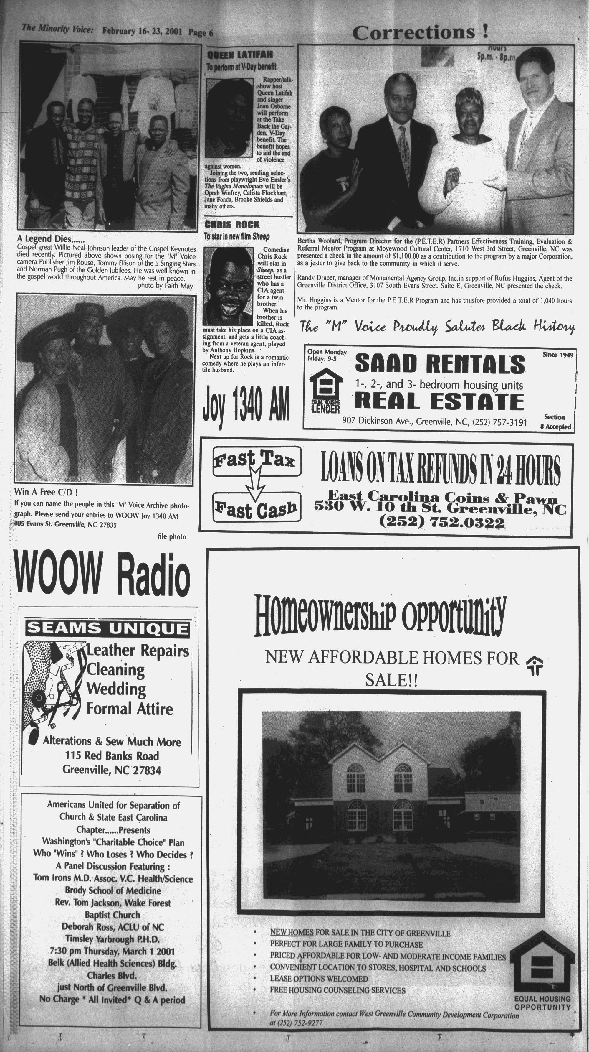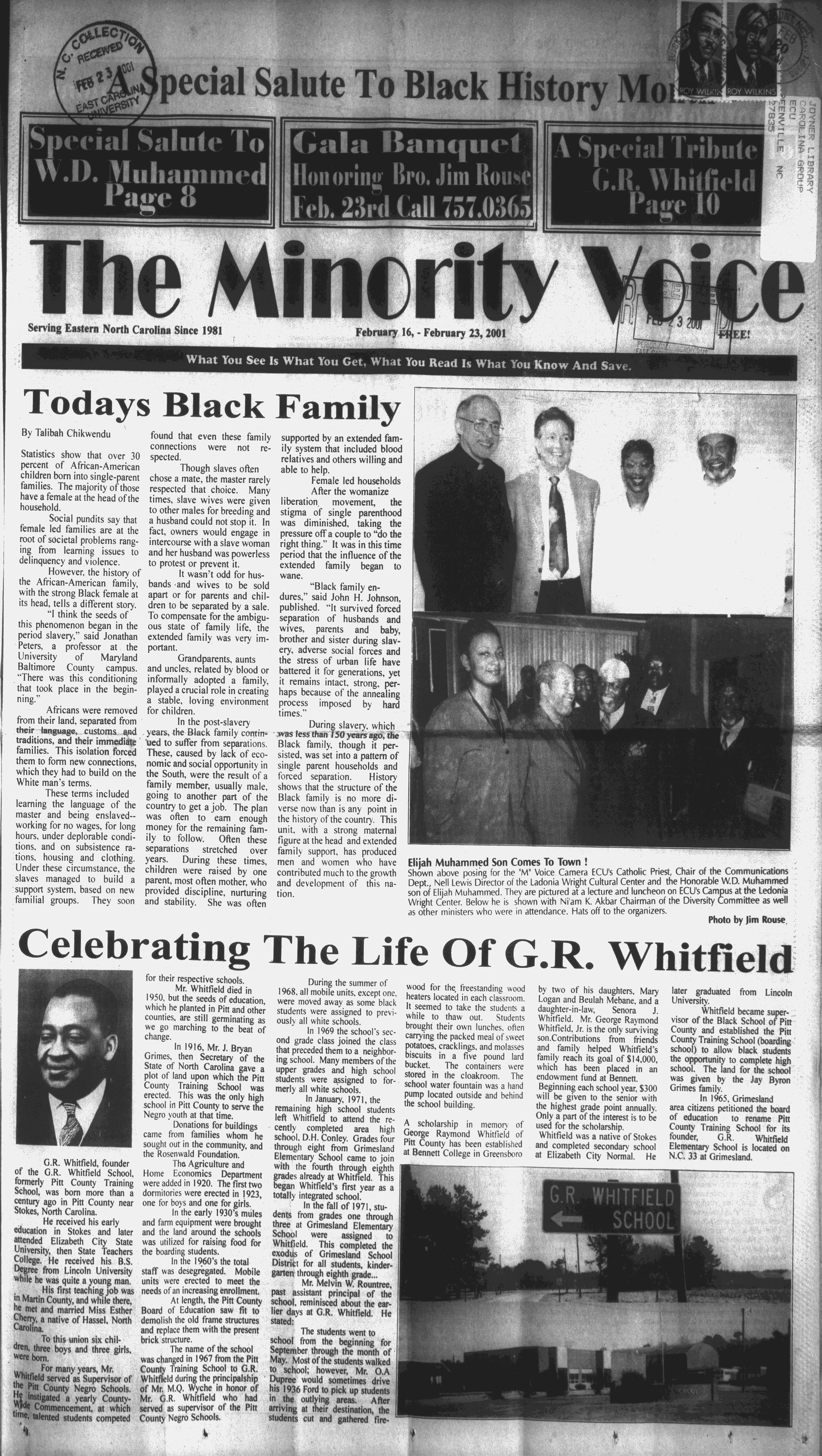 The 'M' voice : Eastern North Carolina's minority voice-since 1987. Greenville. N.C. : Minority Voice, inc. James Rouse, Jr. (1942-2017), began publication of The "M" Voice in 1987 with monthly issues published intermittently until 2010. At different times, the paper was also published as The "M"inority Voice and The Minority Voice. It focused on the Black community in Eastern North Carolina.