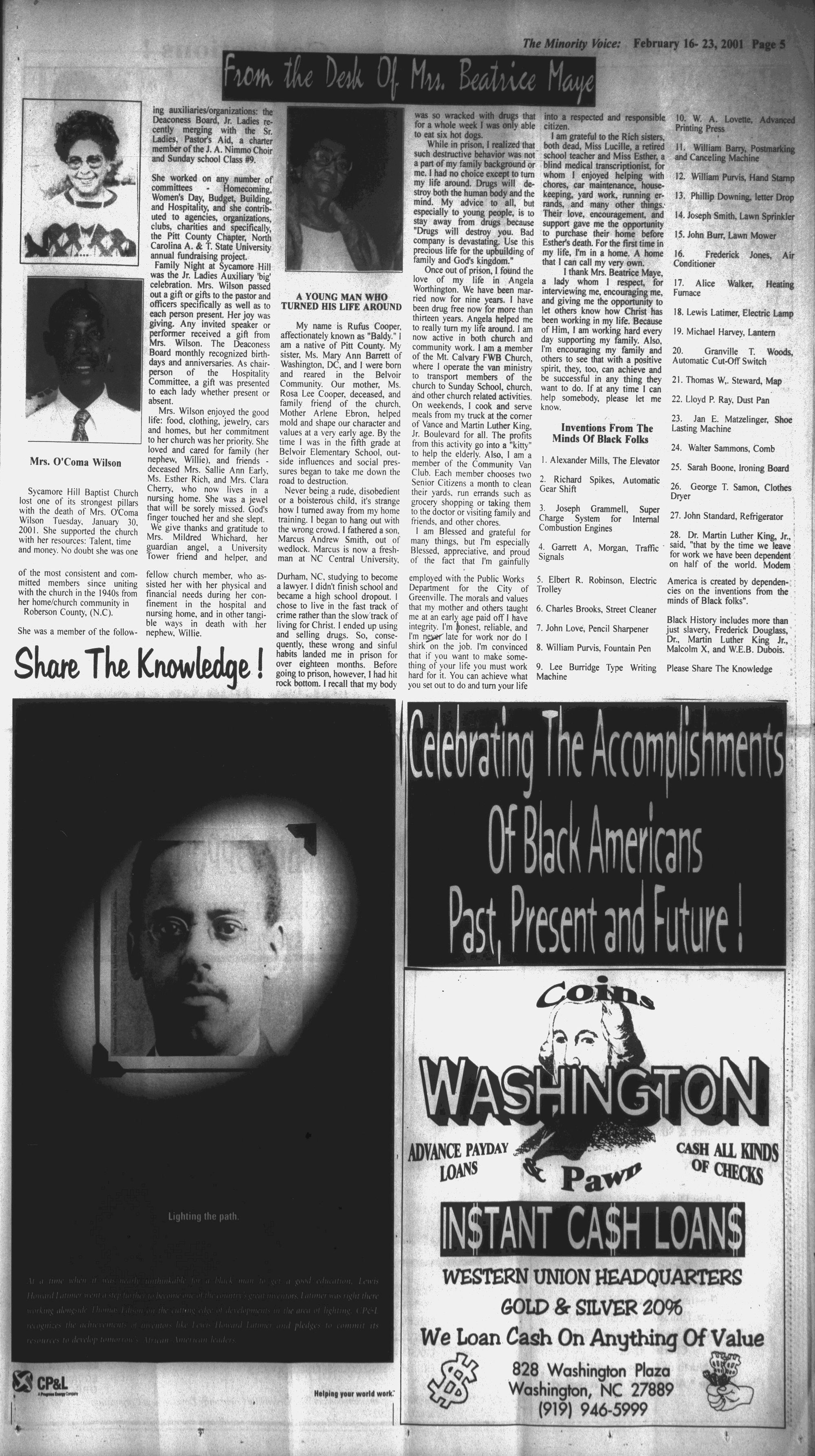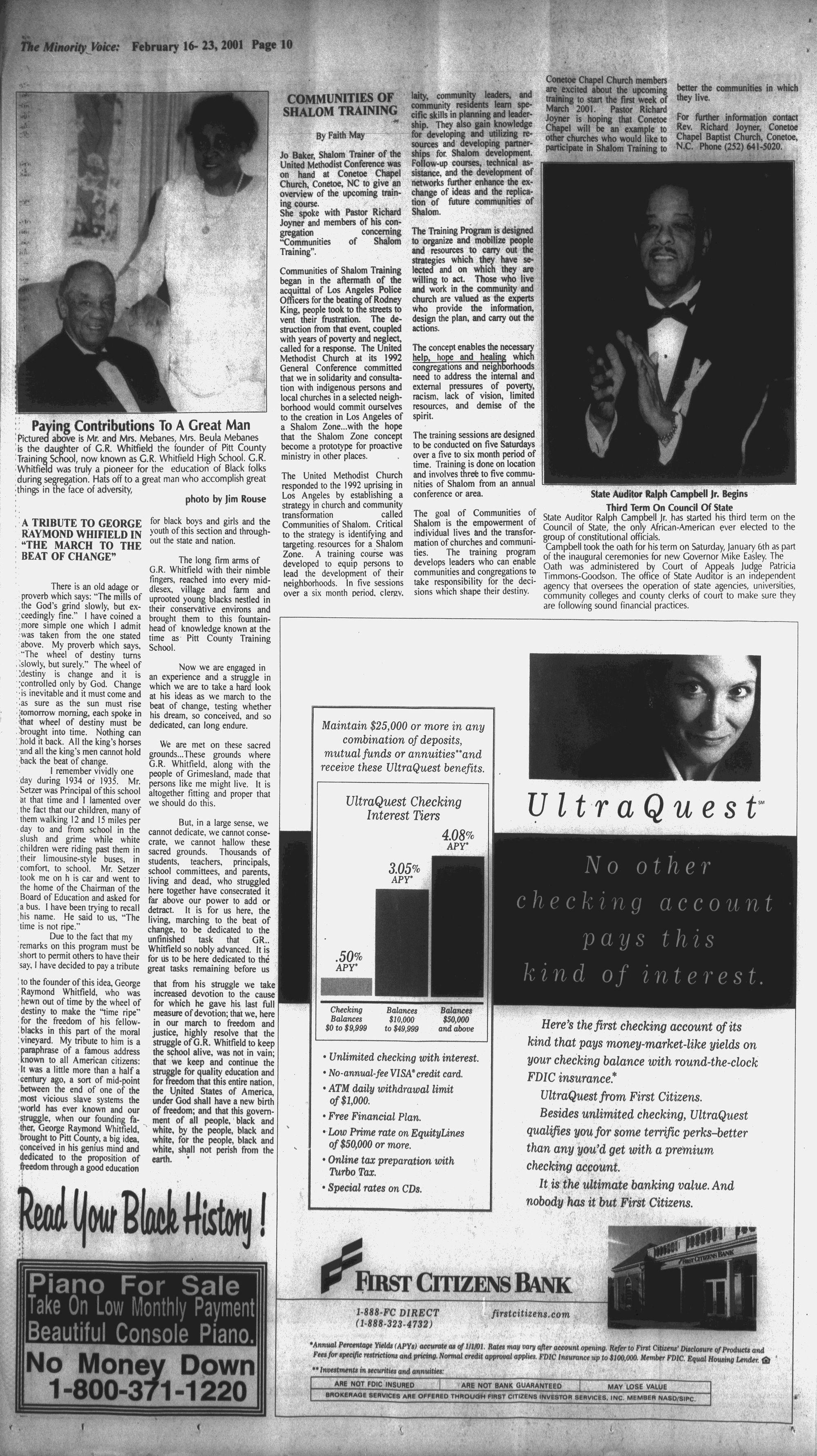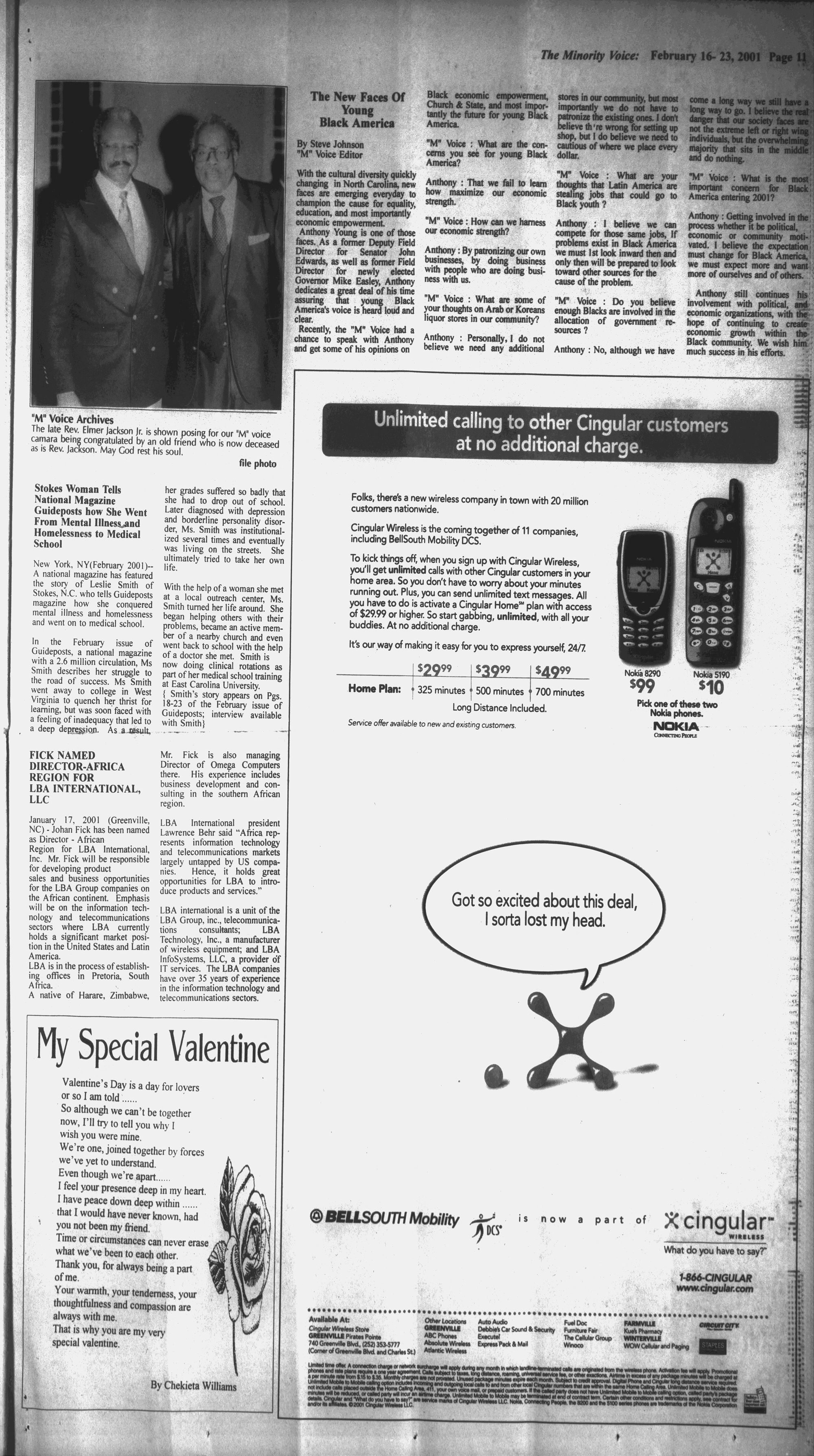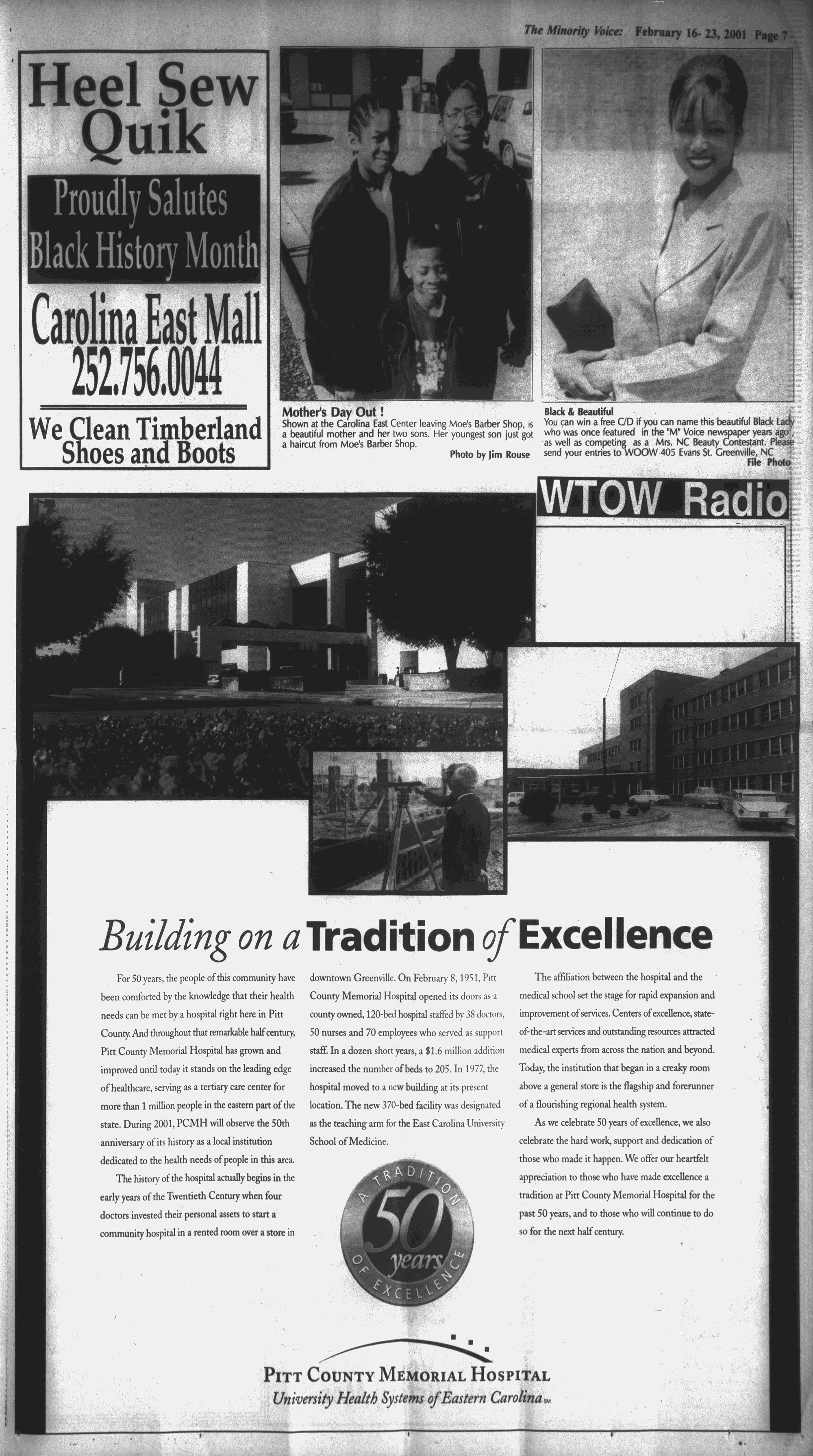 The 'M' voice : Eastern North Carolina's minority voice-since 1987. Greenville. N.C. : Minority Voice, inc. James Rouse, Jr. (1942-2017), began publication of The "M" Voice in 1987 with monthly issues published intermittently until 2010. At different times, the paper was also published as The "M"inority Voice and The Minority Voice. It focused on the Black community in Eastern North Carolina.