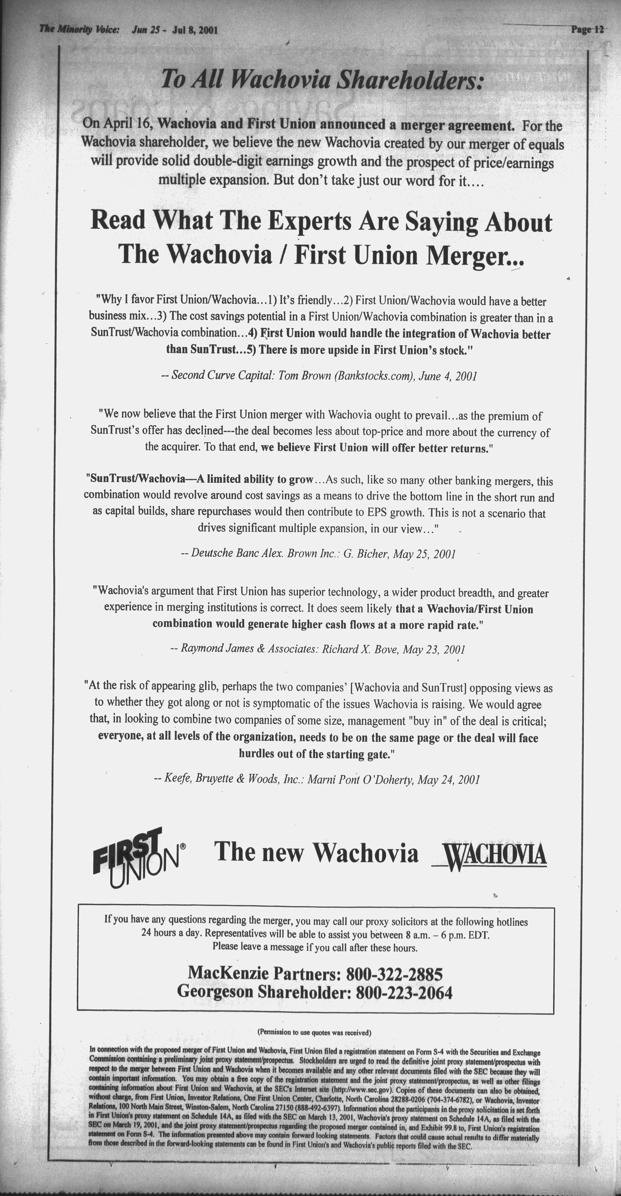 SEC 19, 2001, a : us regarding @ proposed merger contained in, and Exhibit 99.8 to, First Union's