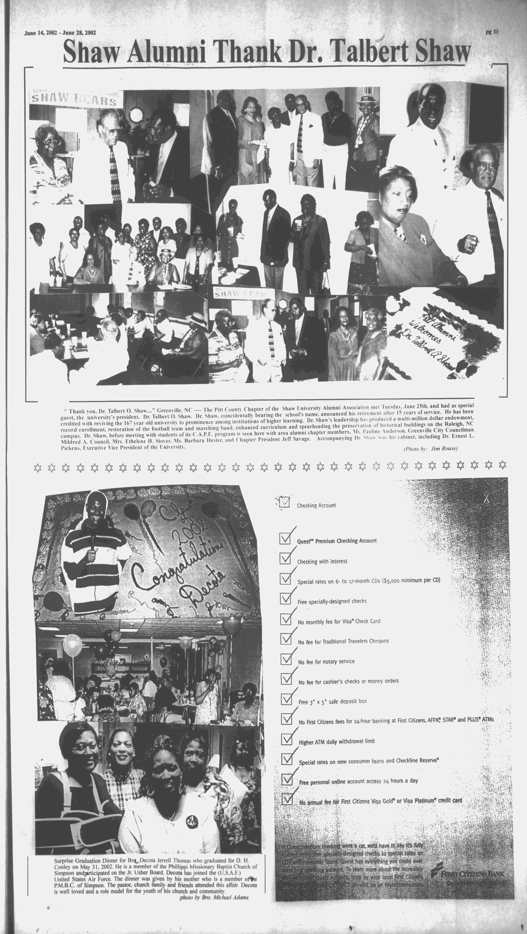 " Thank you, Dr. Talbert O. Shaw..." Greenville, NC ---- The Pitt County Chapter of the Shaw University Alumni Association met Tuesday, June 25th, and had as special