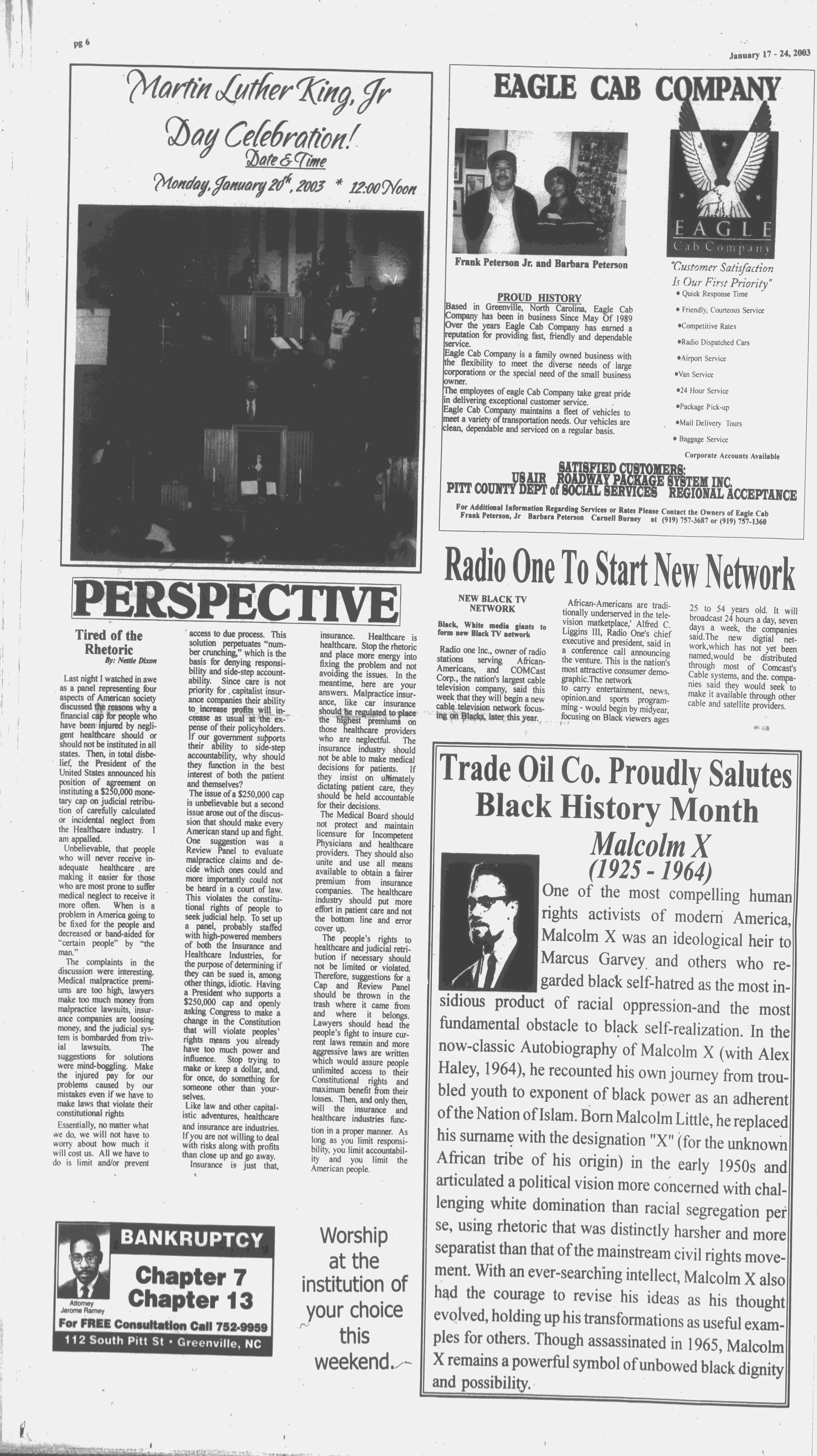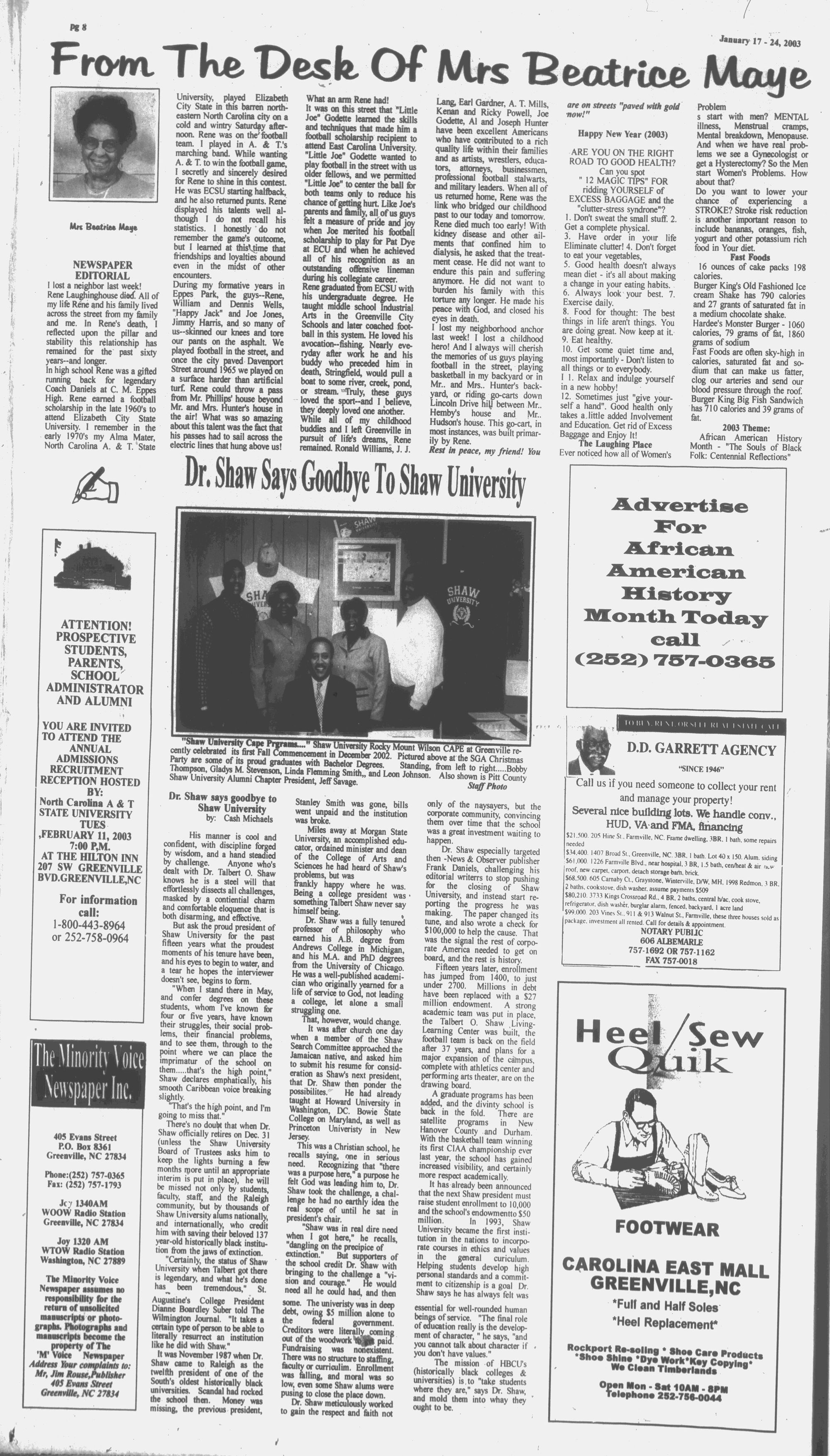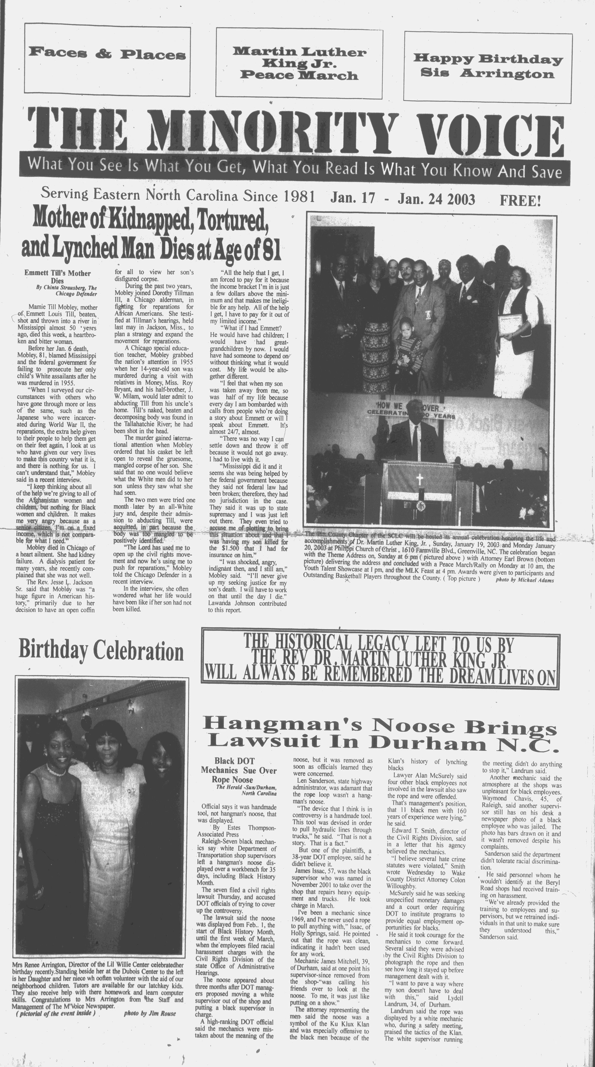 The 'M' voice : Eastern North Carolina's minority voice-since 1987. Greenville. N.C. : Minority Voice, inc. James Rouse, Jr. (1942-2017), began publication of The "M" Voice in 1987 with monthly issues published intermittently until 2010. At different times, the paper was also published as The "M"inority Voice and The Minority Voice. It focused on the Black community in Eastern North Carolina.