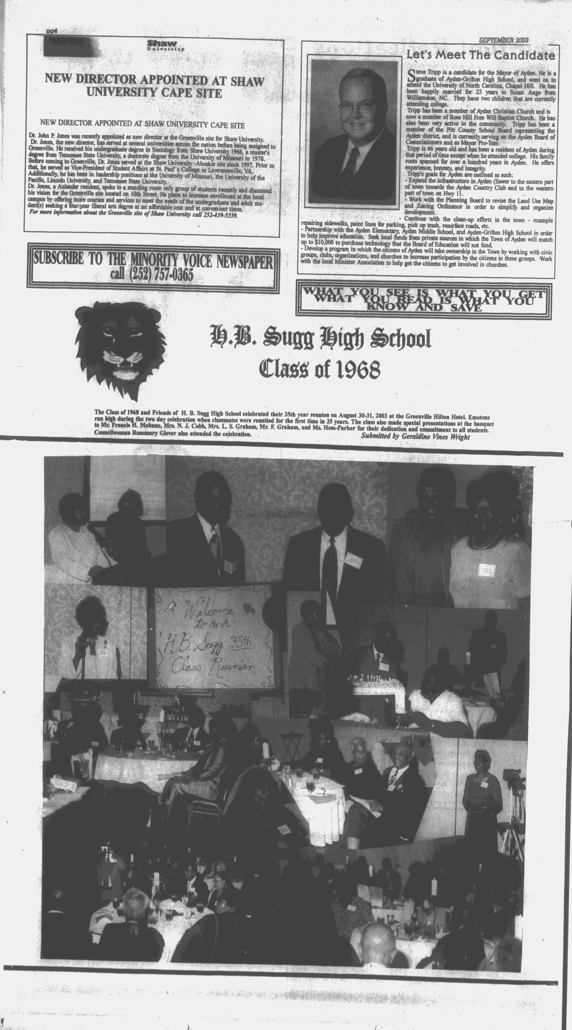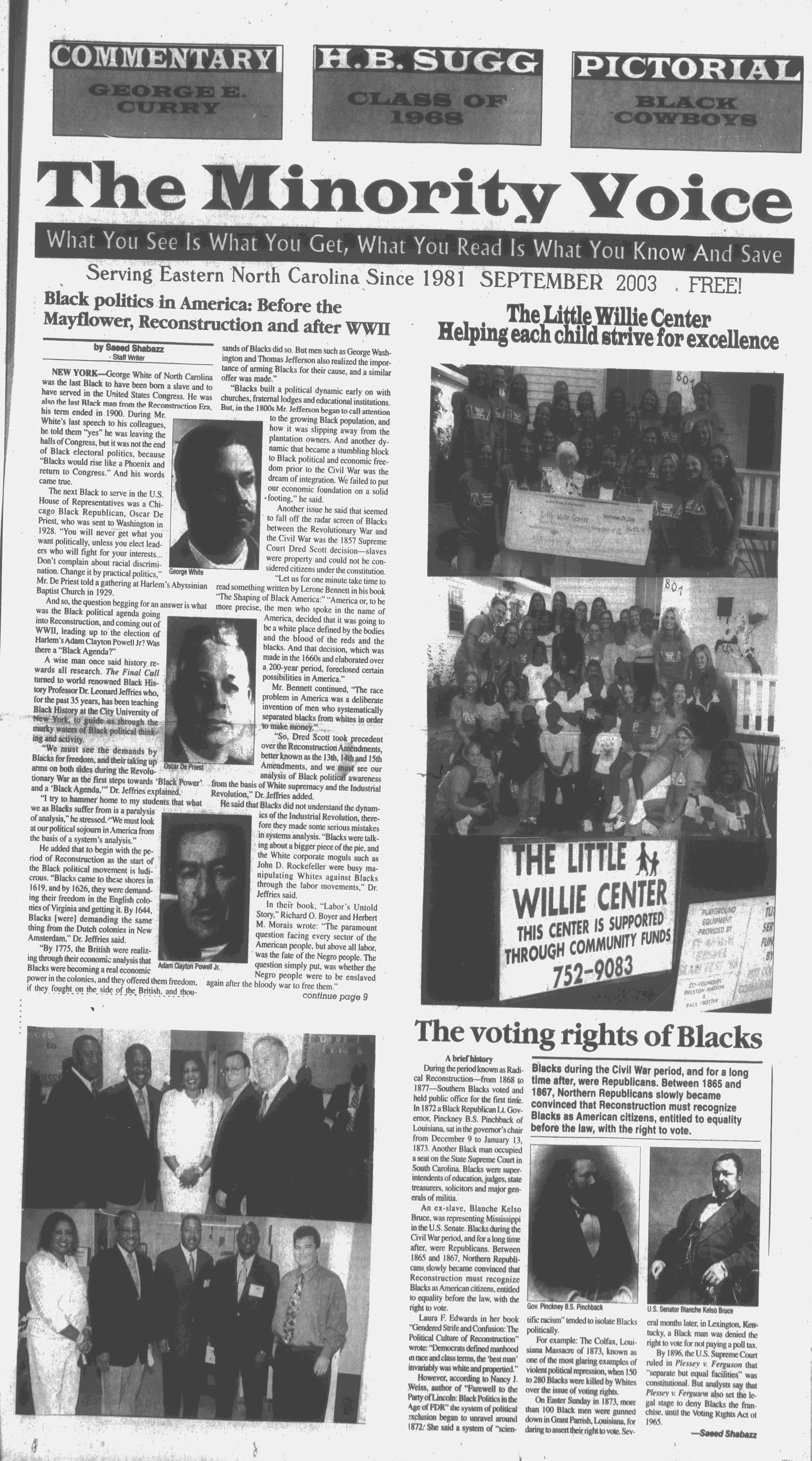 The 'M' voice : Eastern North Carolina's minority voice-since 1987. Greenville. N.C. : Minority Voice, inc. James Rouse, Jr. (1942-2017), began publication of The "M" Voice in 1987 with monthly issues published intermittently until 2010. At different times, the paper was also published as The "M"inority Voice and The Minority Voice. It focused on the Black community in Eastern North Carolina.