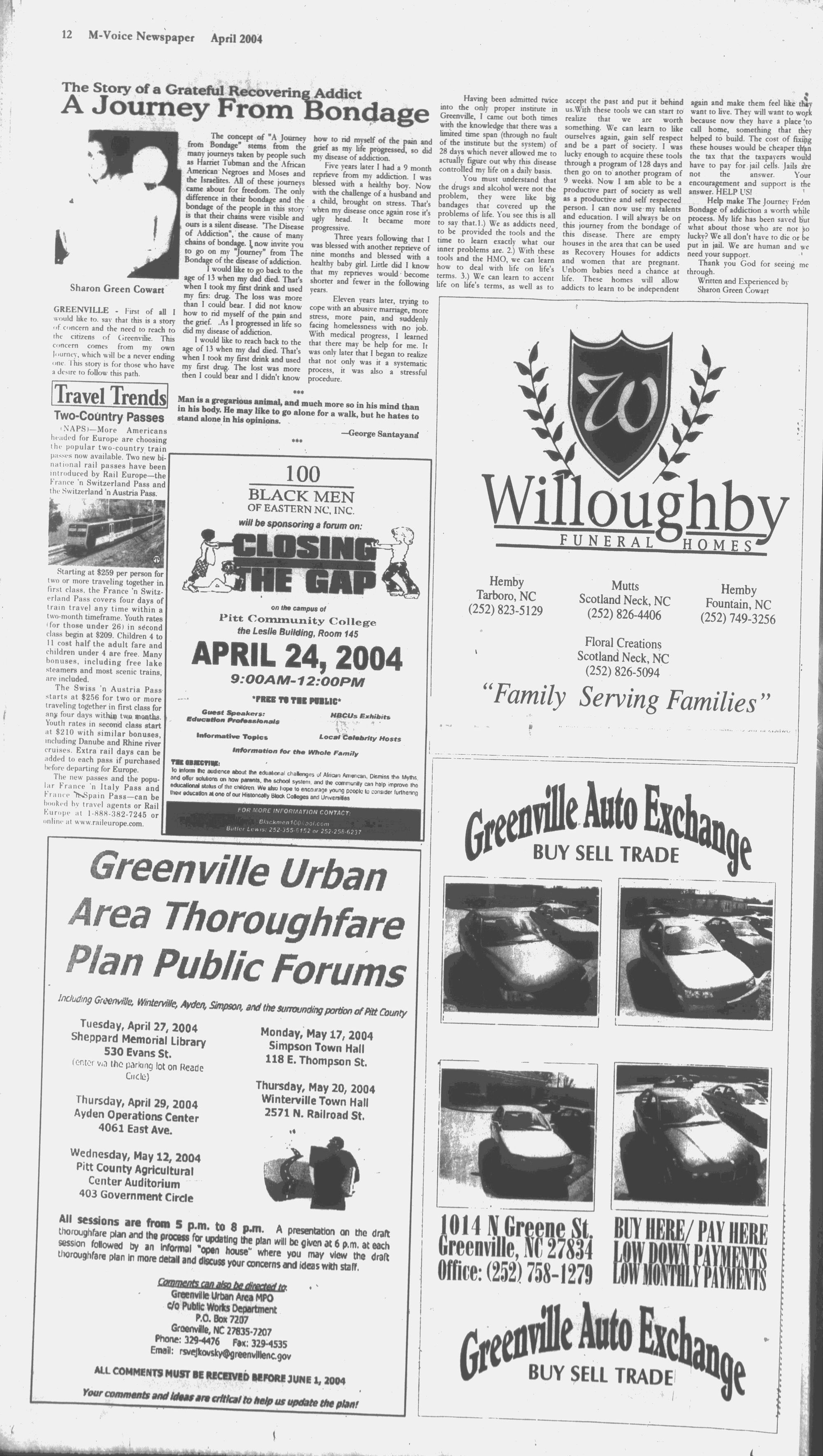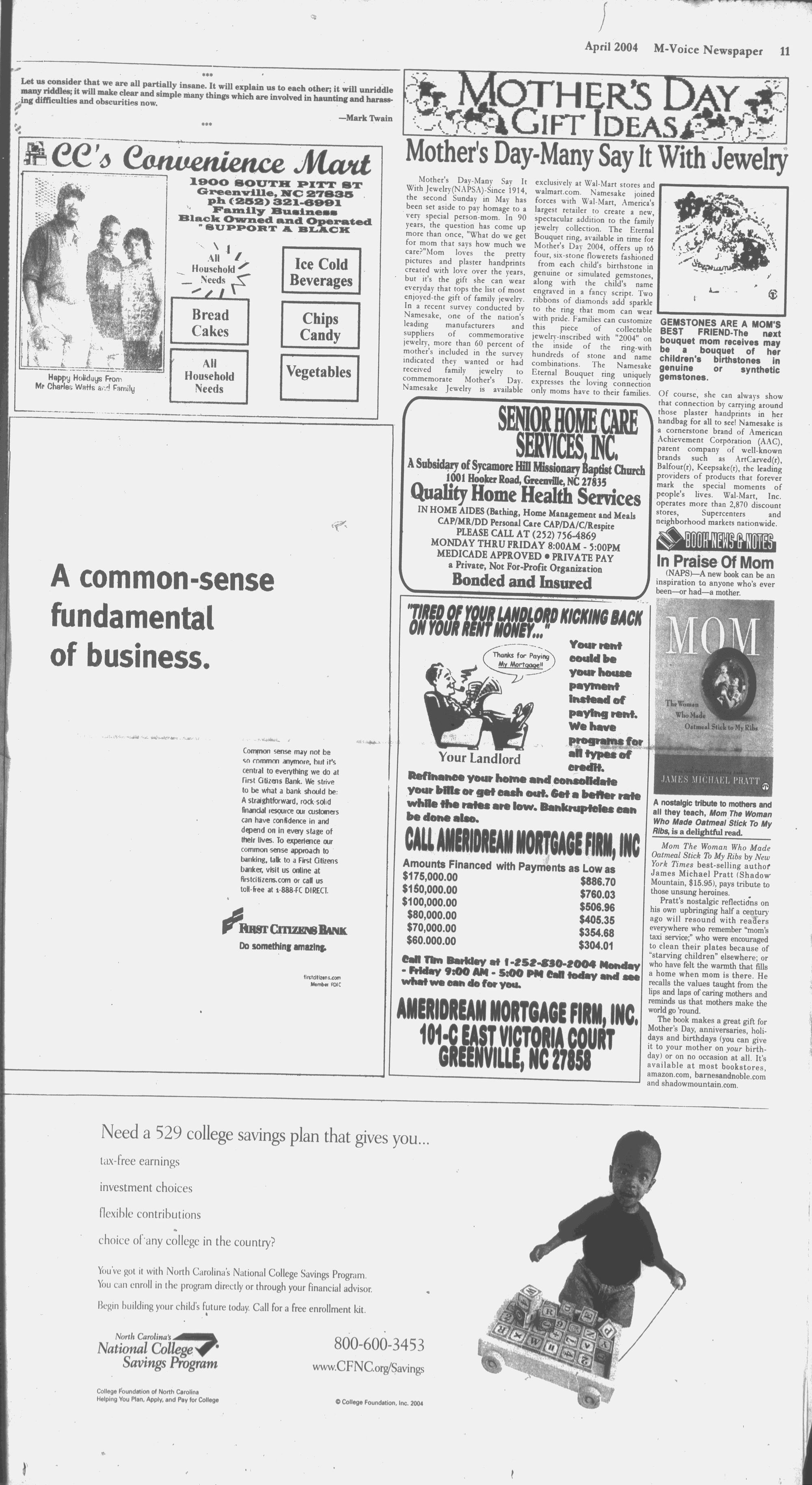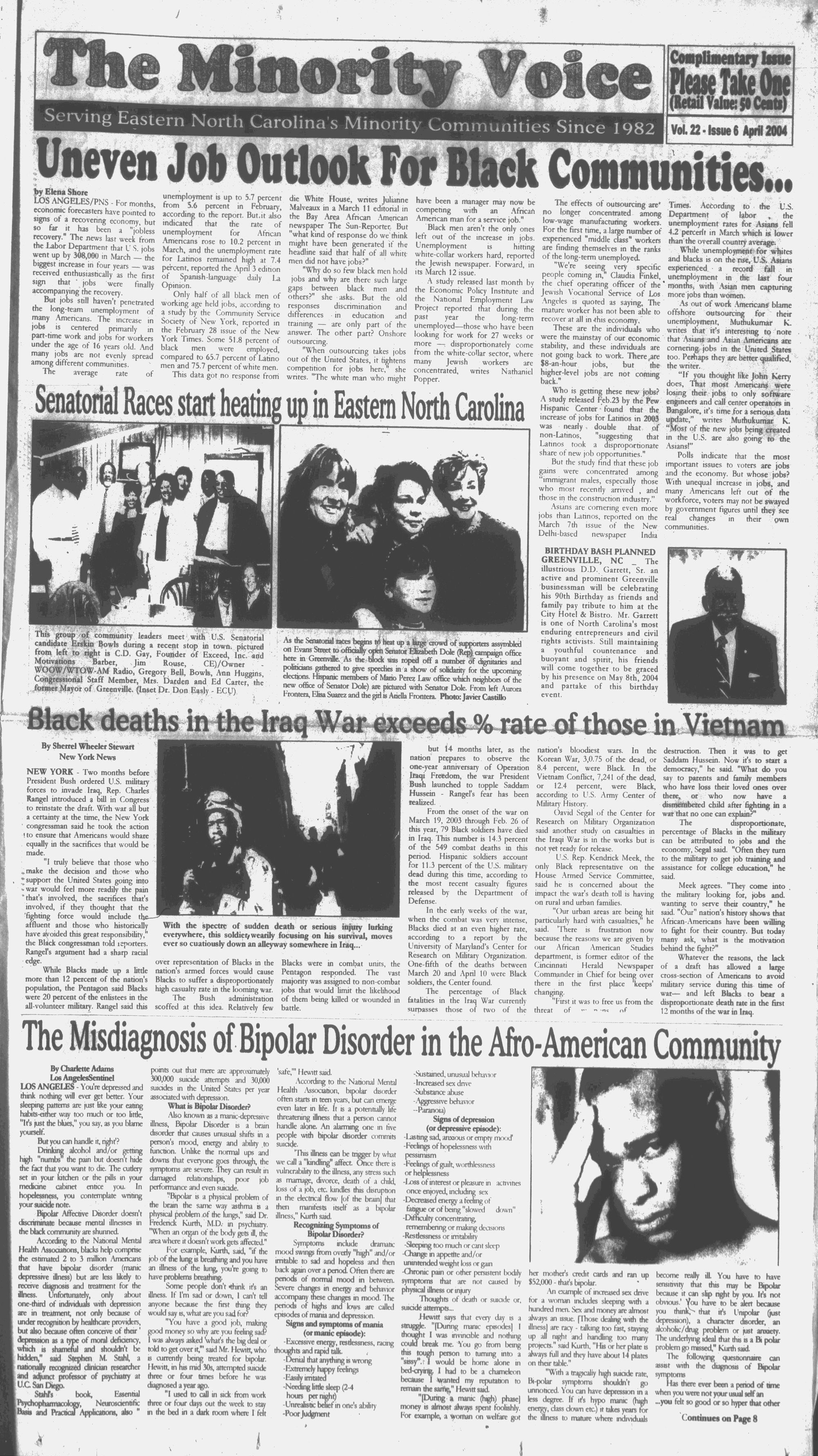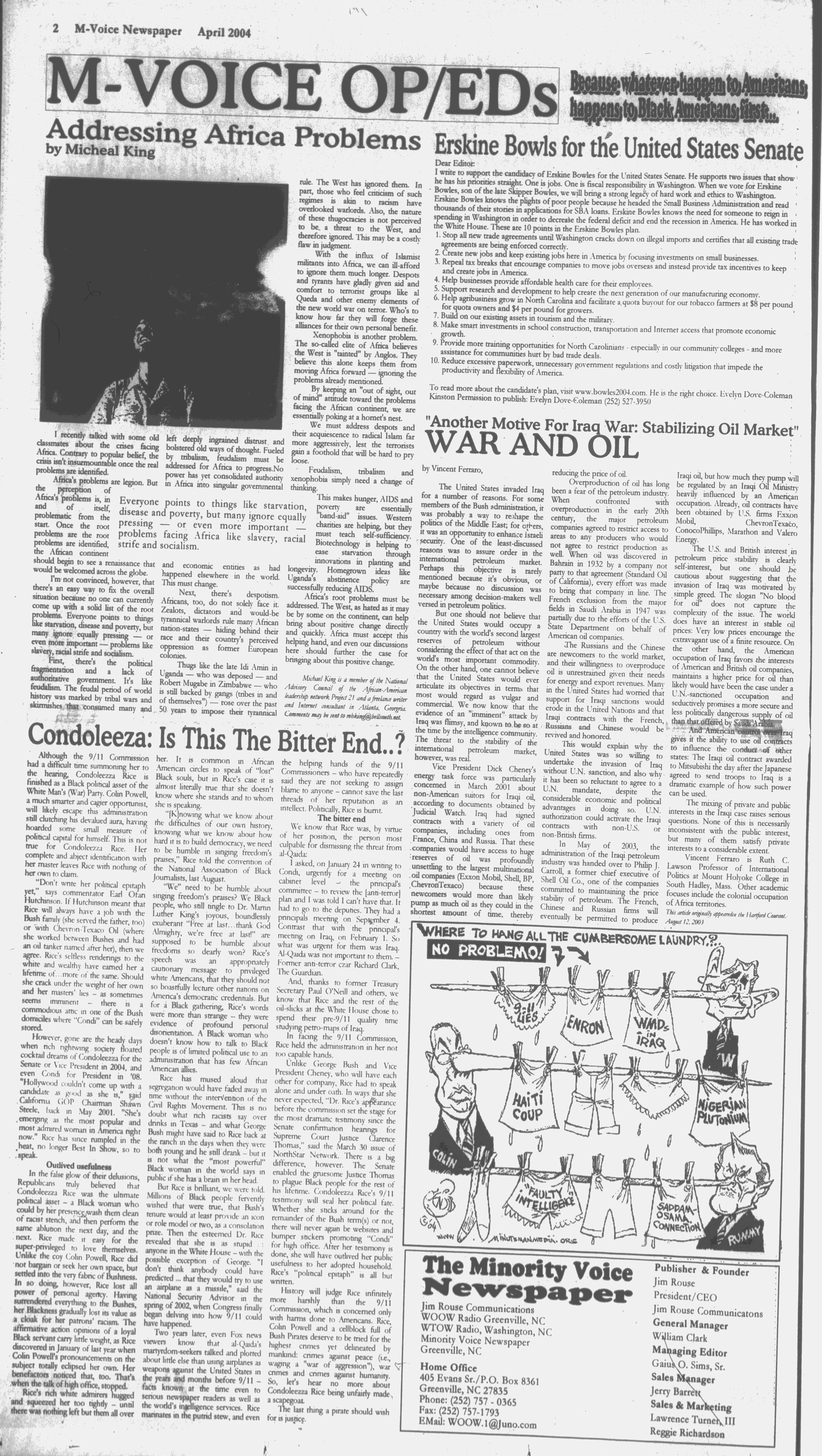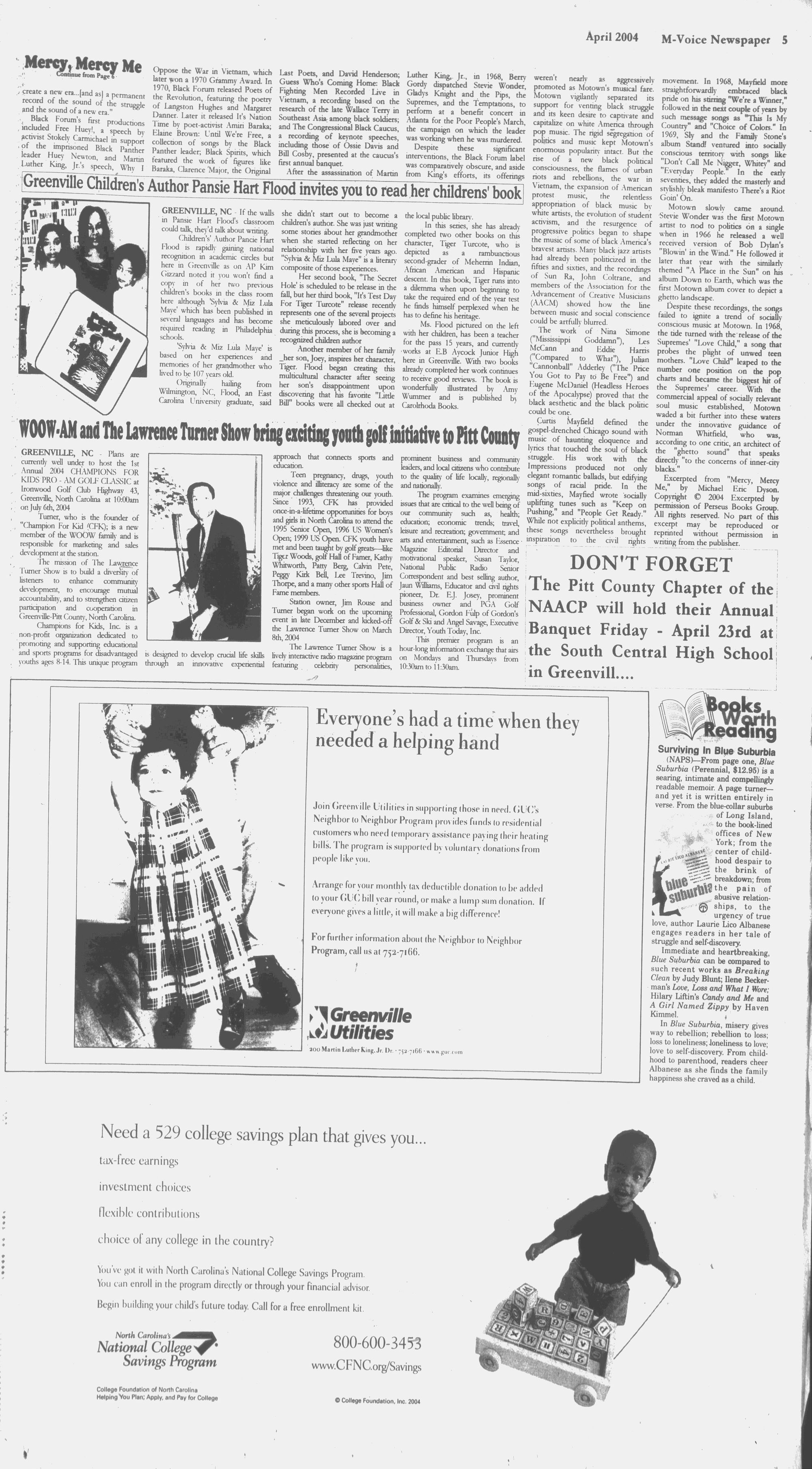 The 'M' voice : Eastern North Carolina's minority voice-since 1987. Greenville. N.C. : Minority Voice, inc. James Rouse, Jr. (1942-2017), began publication of The "M" Voice in 1987 with monthly issues published intermittently until 2010. At different times, the paper was also published as The "M"inority Voice and The Minority Voice. It focused on the Black community in Eastern North Carolina.