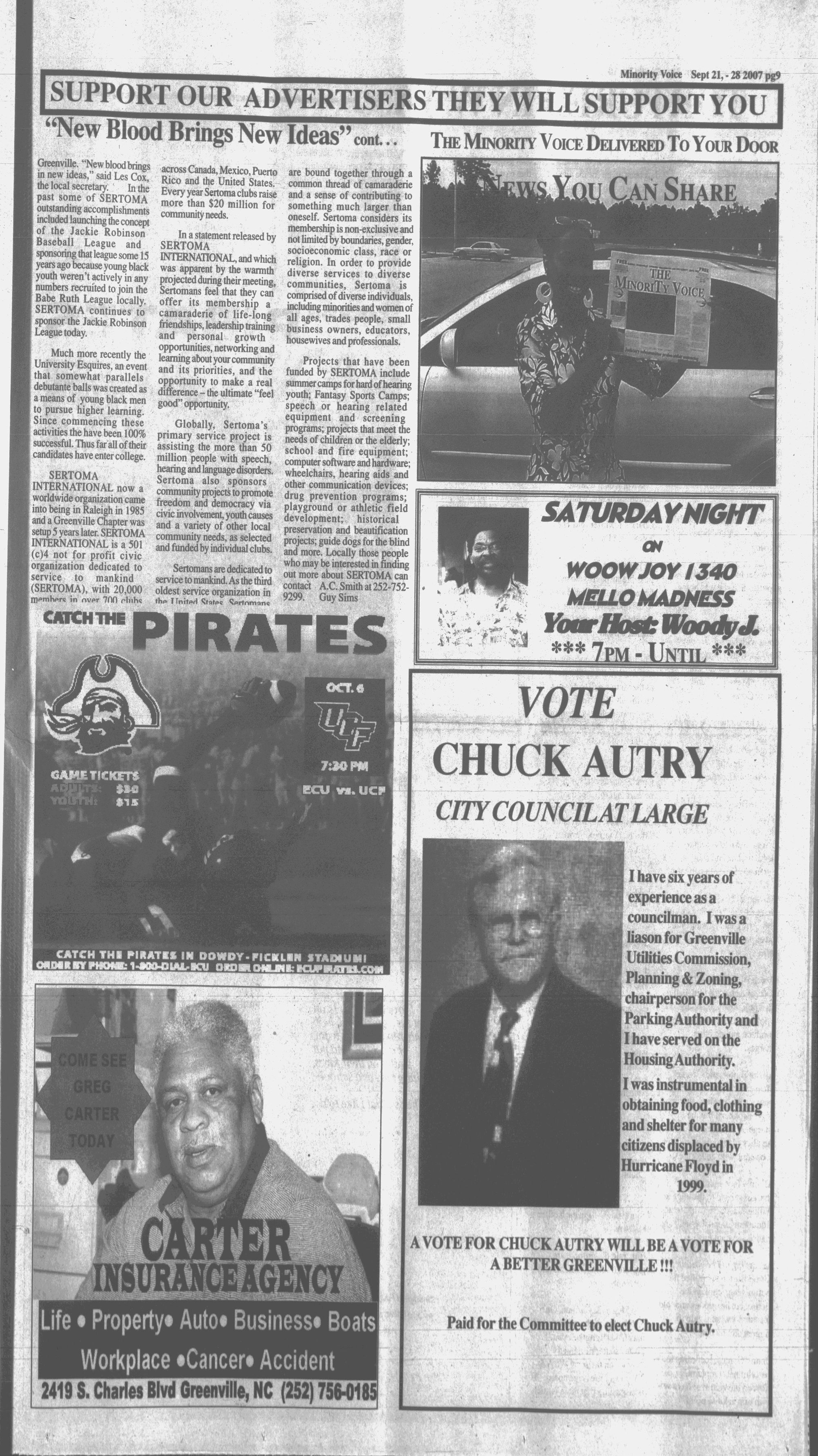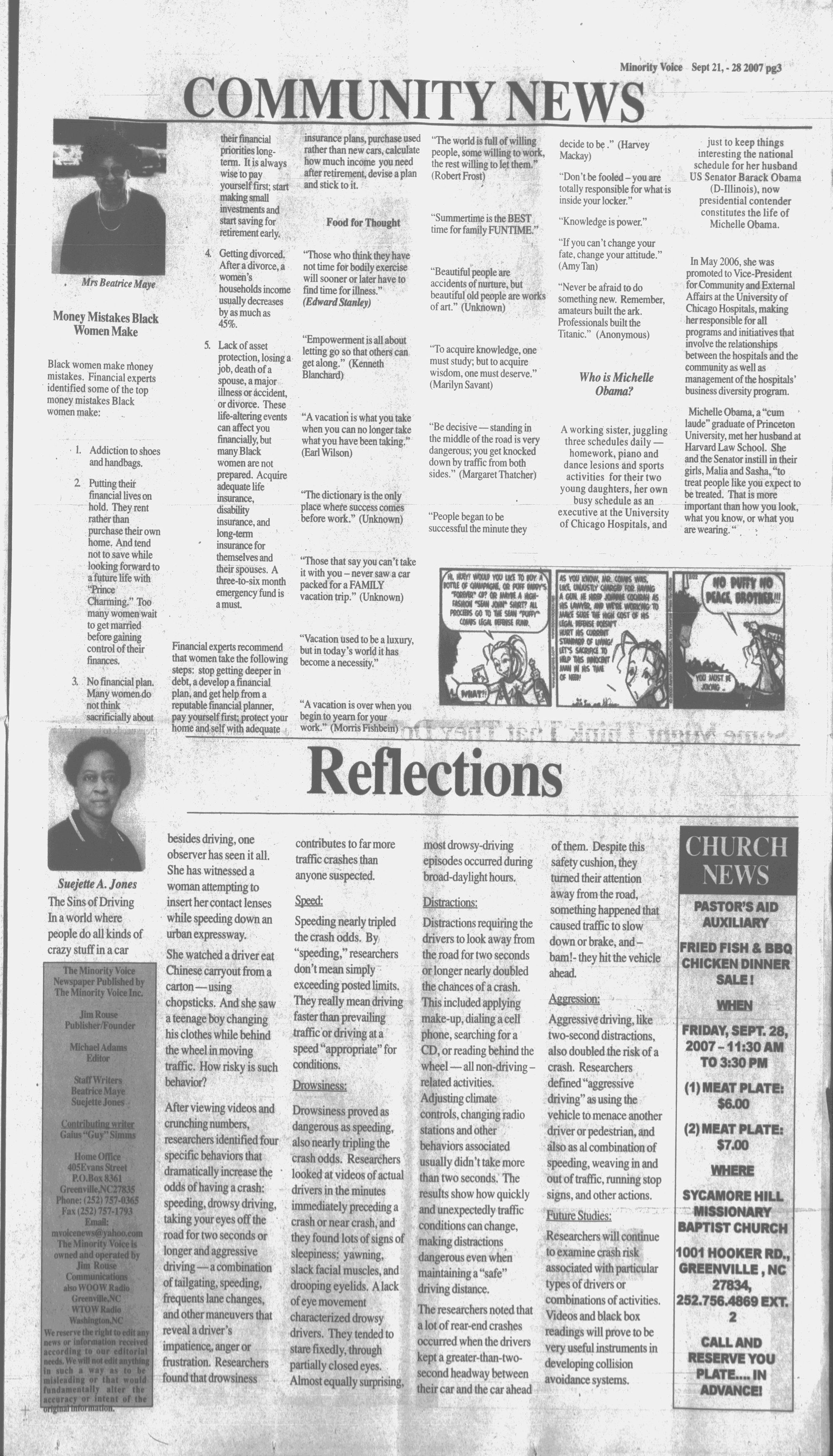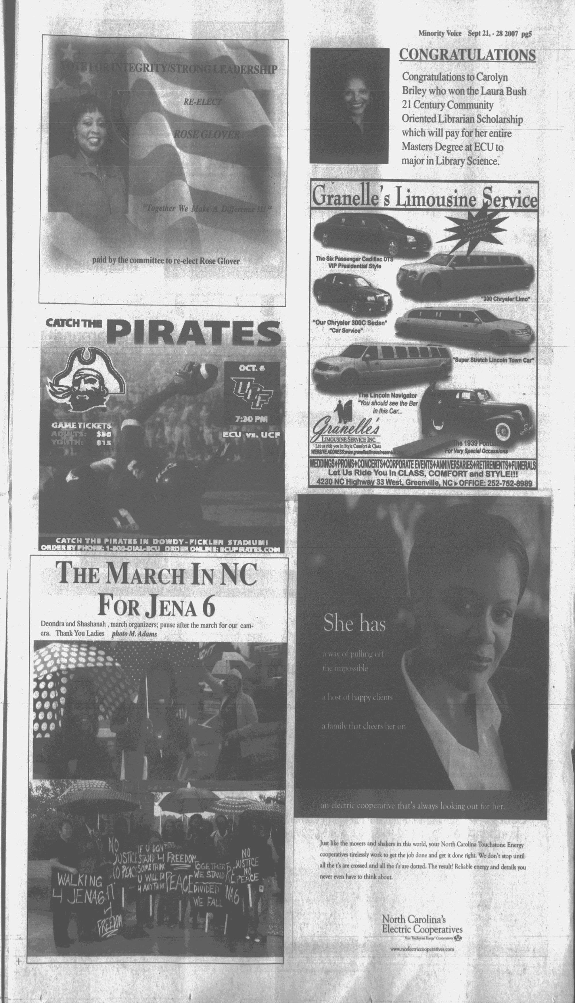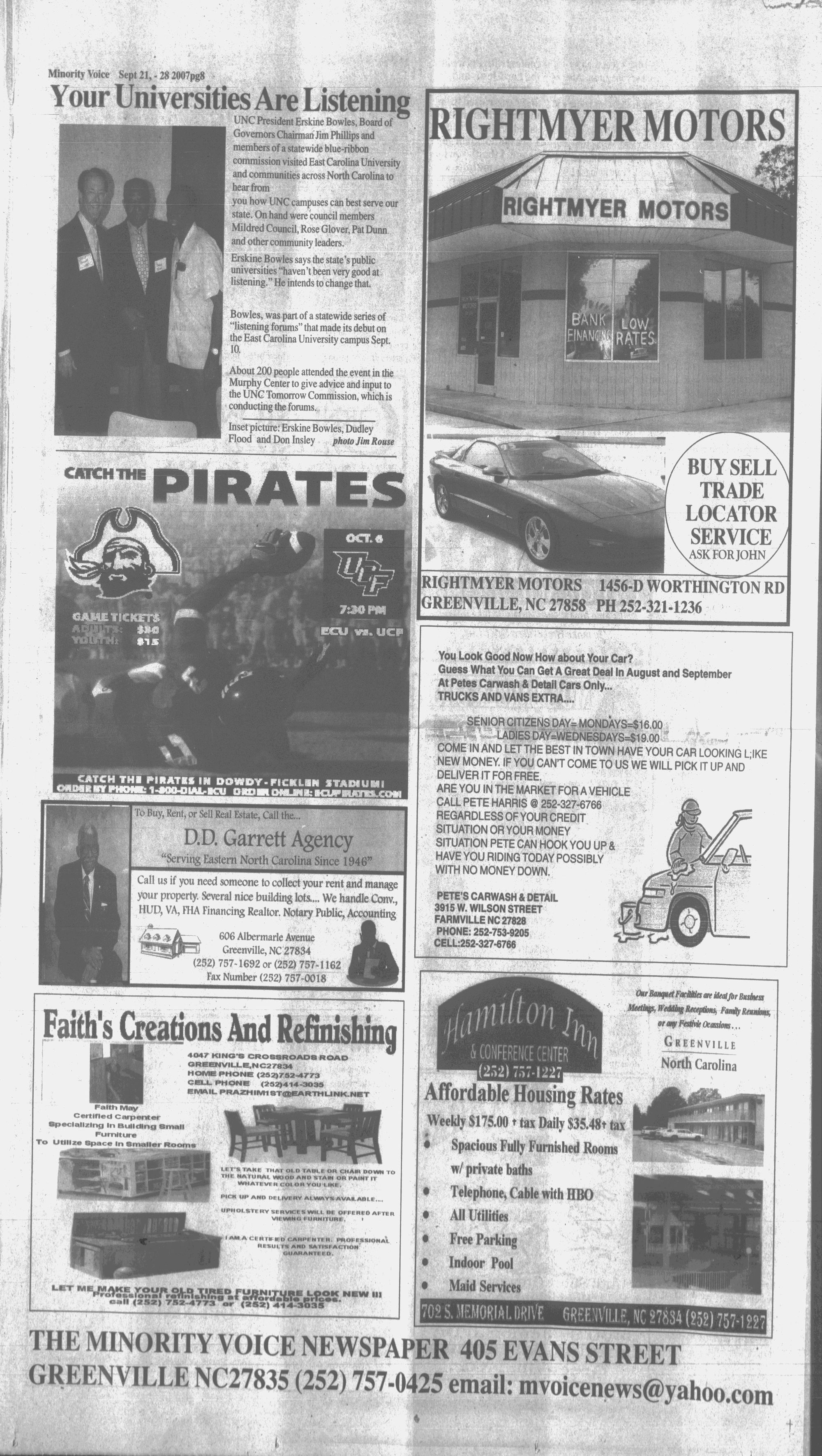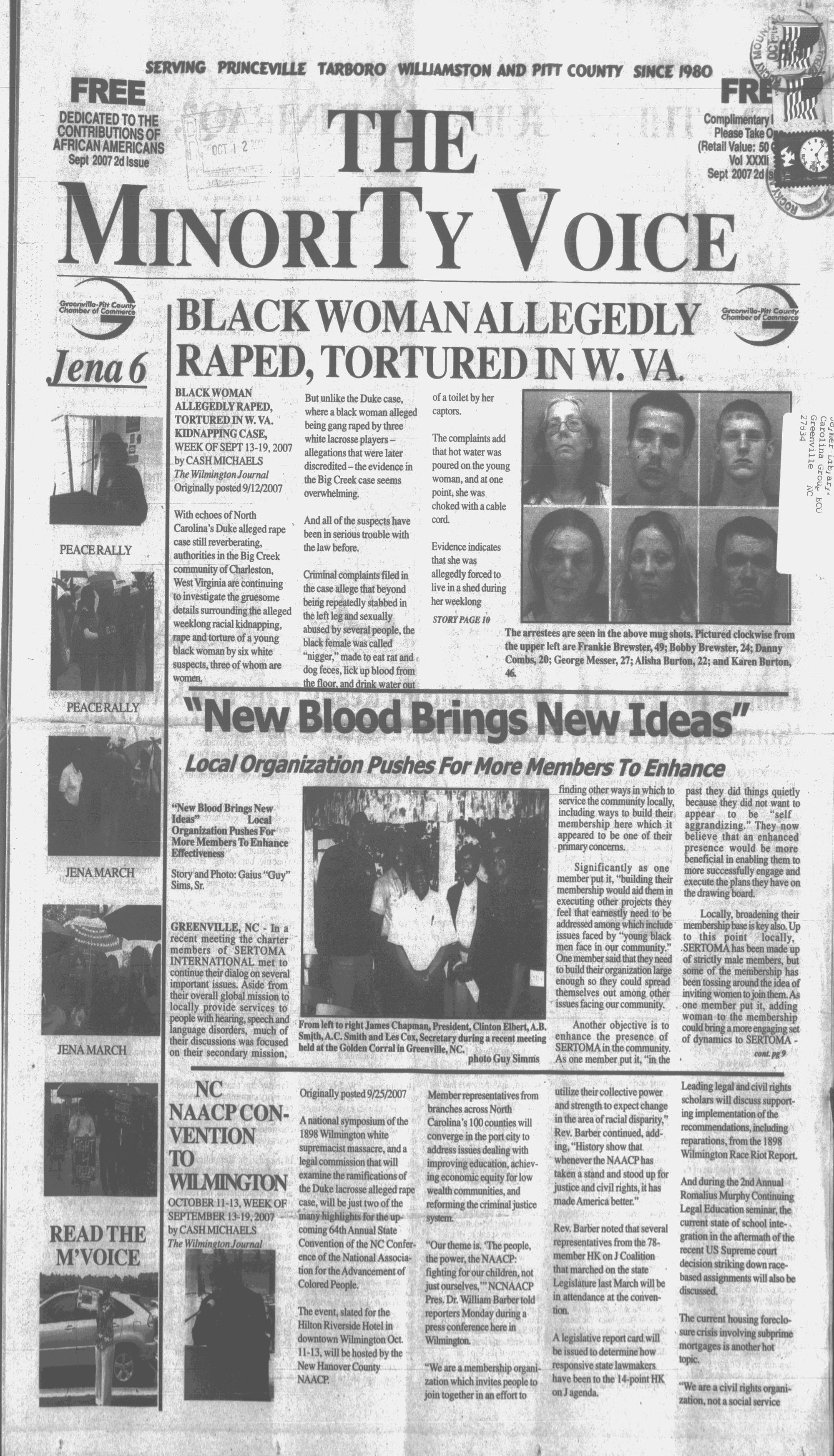 The 'M' voice : Eastern North Carolina's minority voice-since 1987. Greenville. N.C. : Minority Voice, inc. James Rouse, Jr. (1942-2017), began publication of The "M" Voice in 1987 with monthly issues published intermittently until 2010. At different times, the paper was also published as The "M"inority Voice and The Minority Voice. It focused on the Black community in Eastern North Carolina.