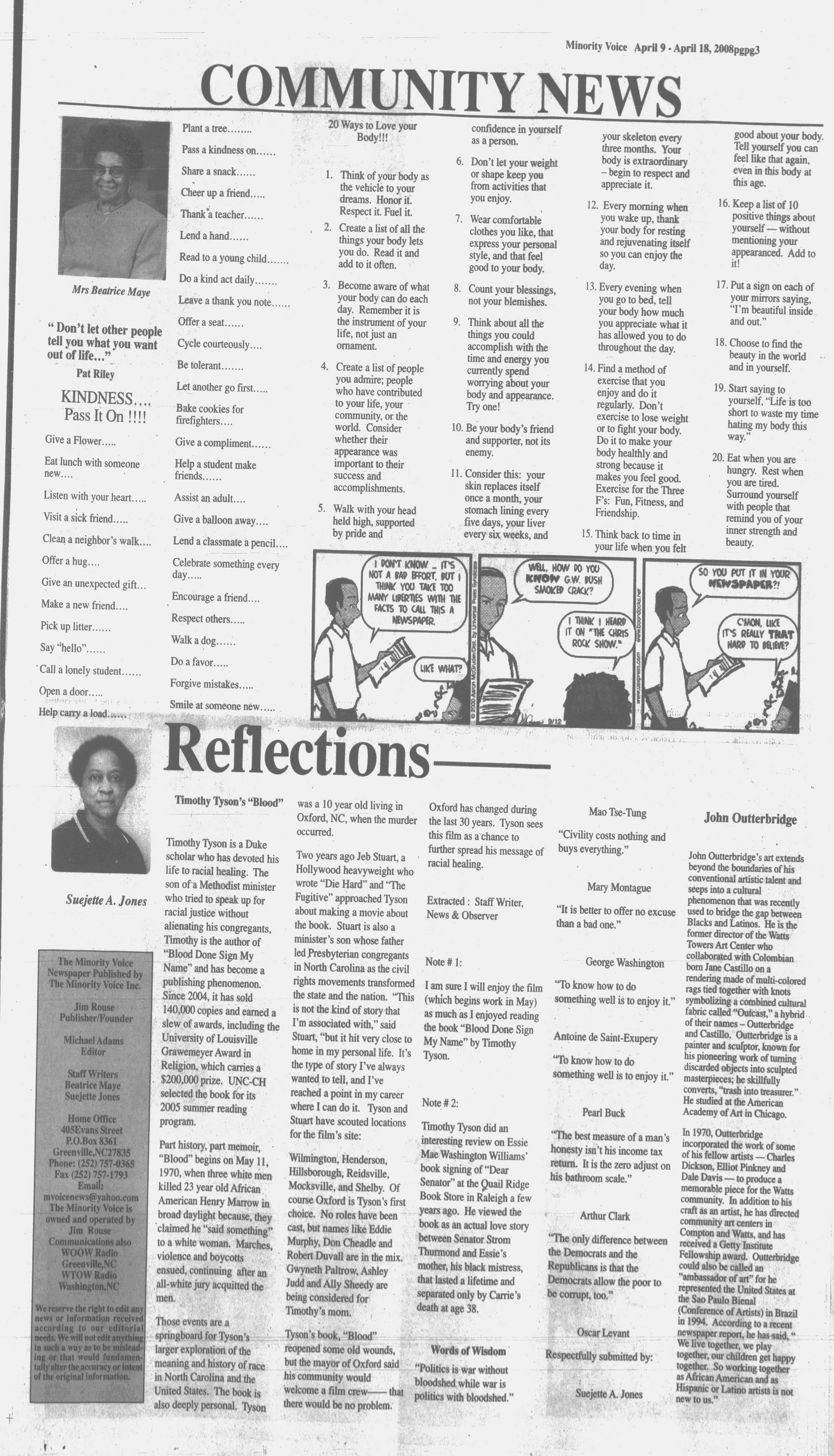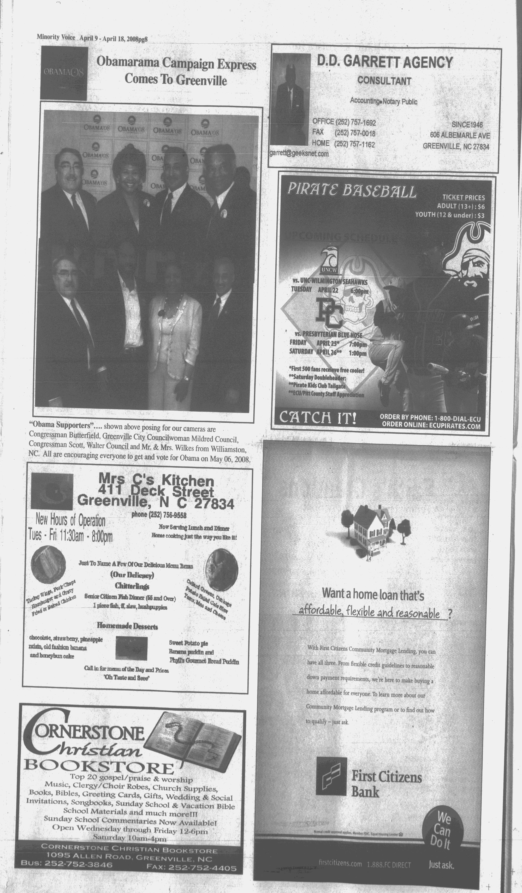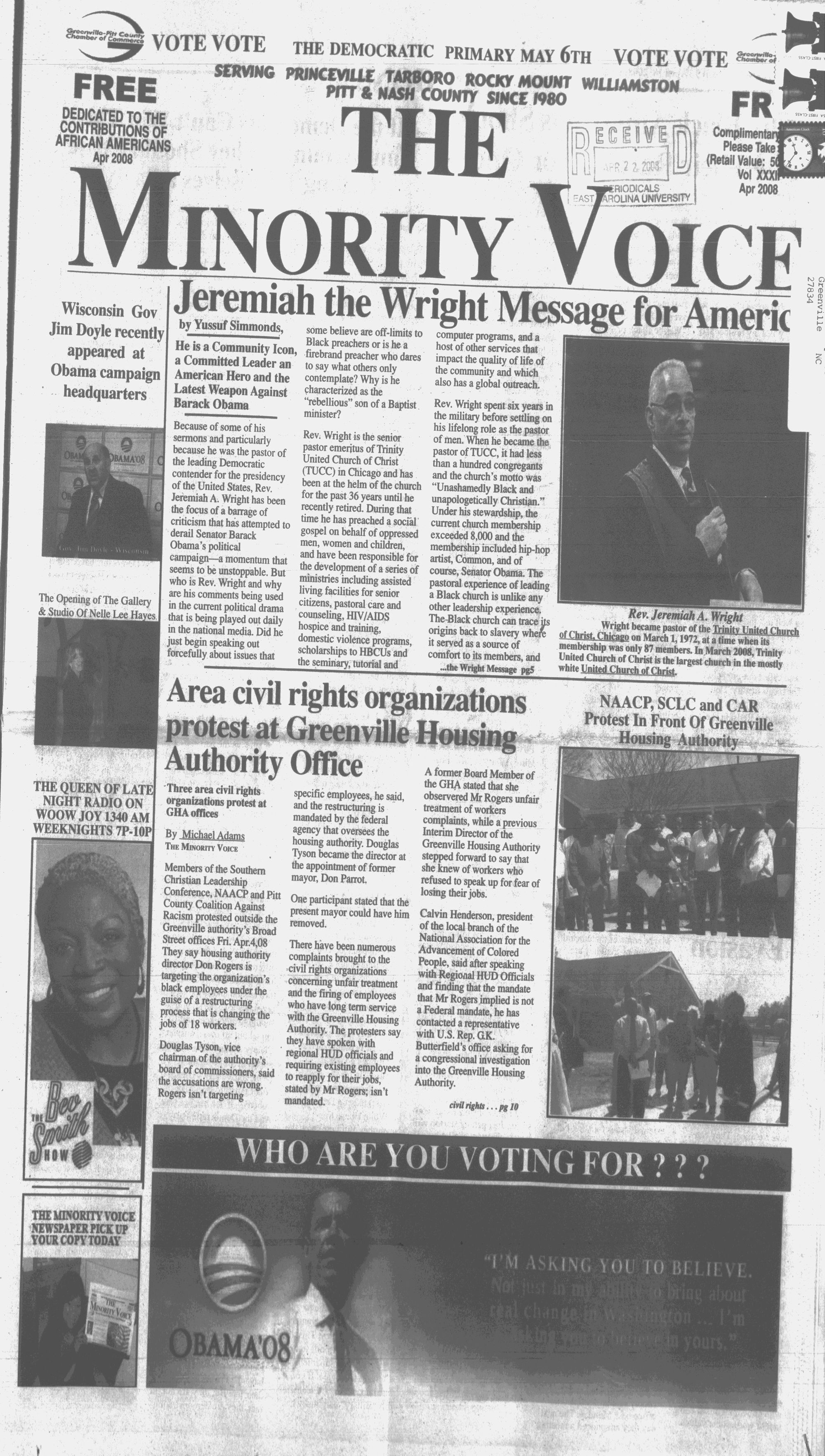 The 'M' voice : Eastern North Carolina's minority voice-since 1987. Greenville. N.C. : Minority Voice, inc. James Rouse, Jr. (1942-2017), began publication of The "M" Voice in 1987 with monthly issues published intermittently until 2010. At different times, the paper was also published as The "M"inority Voice and The Minority Voice. It focused on the Black community in Eastern North Carolina.