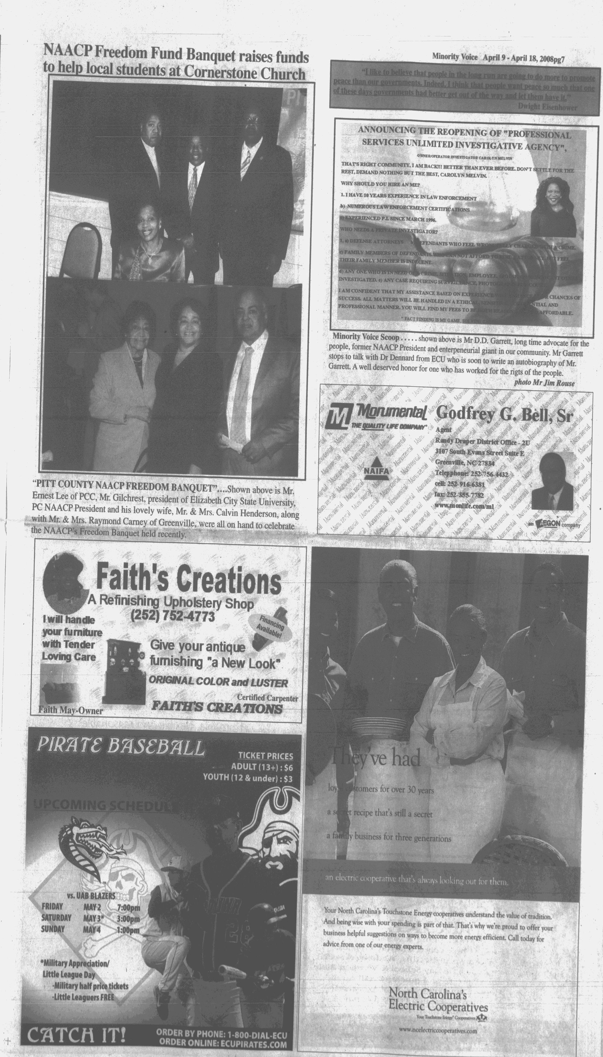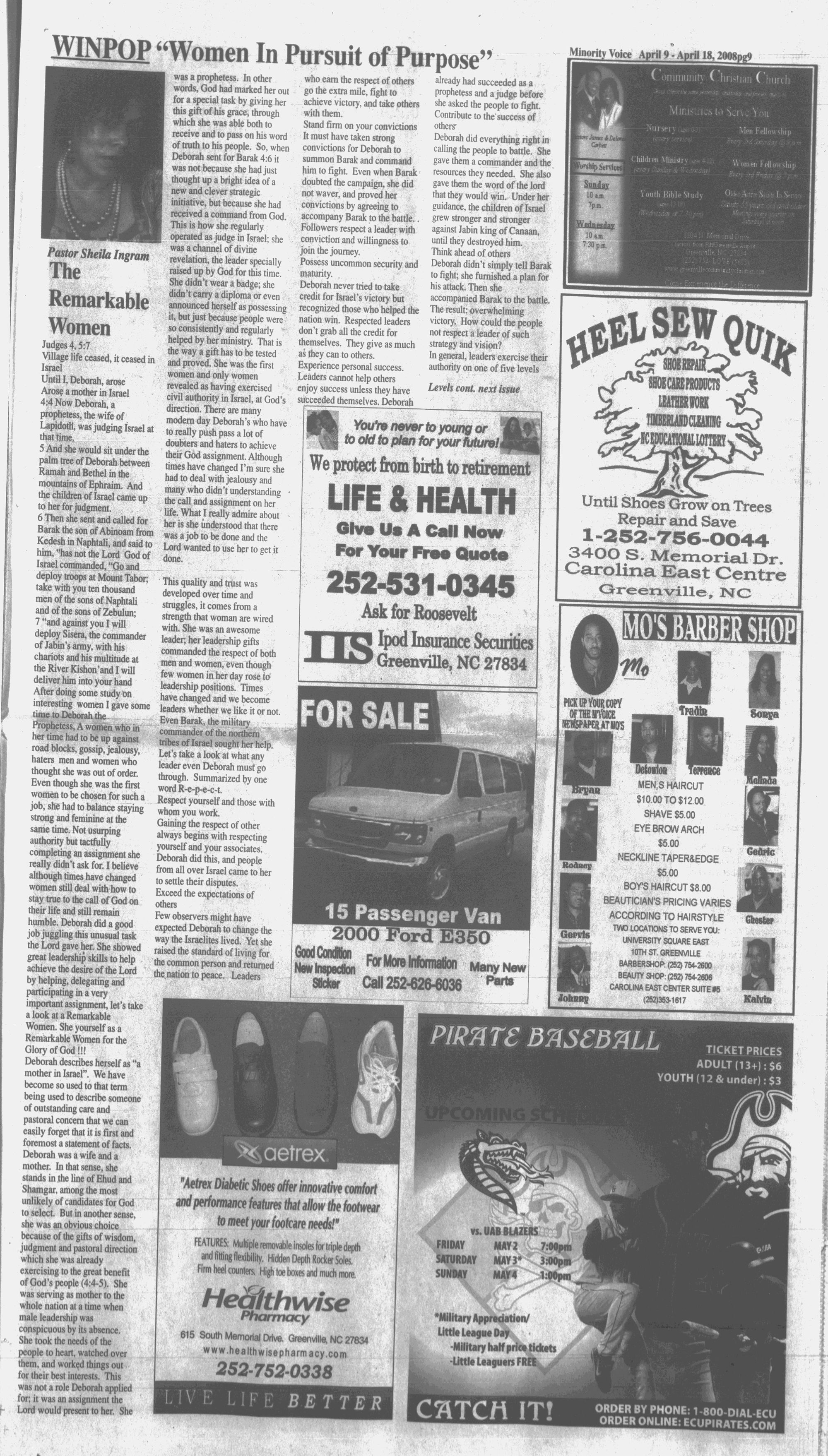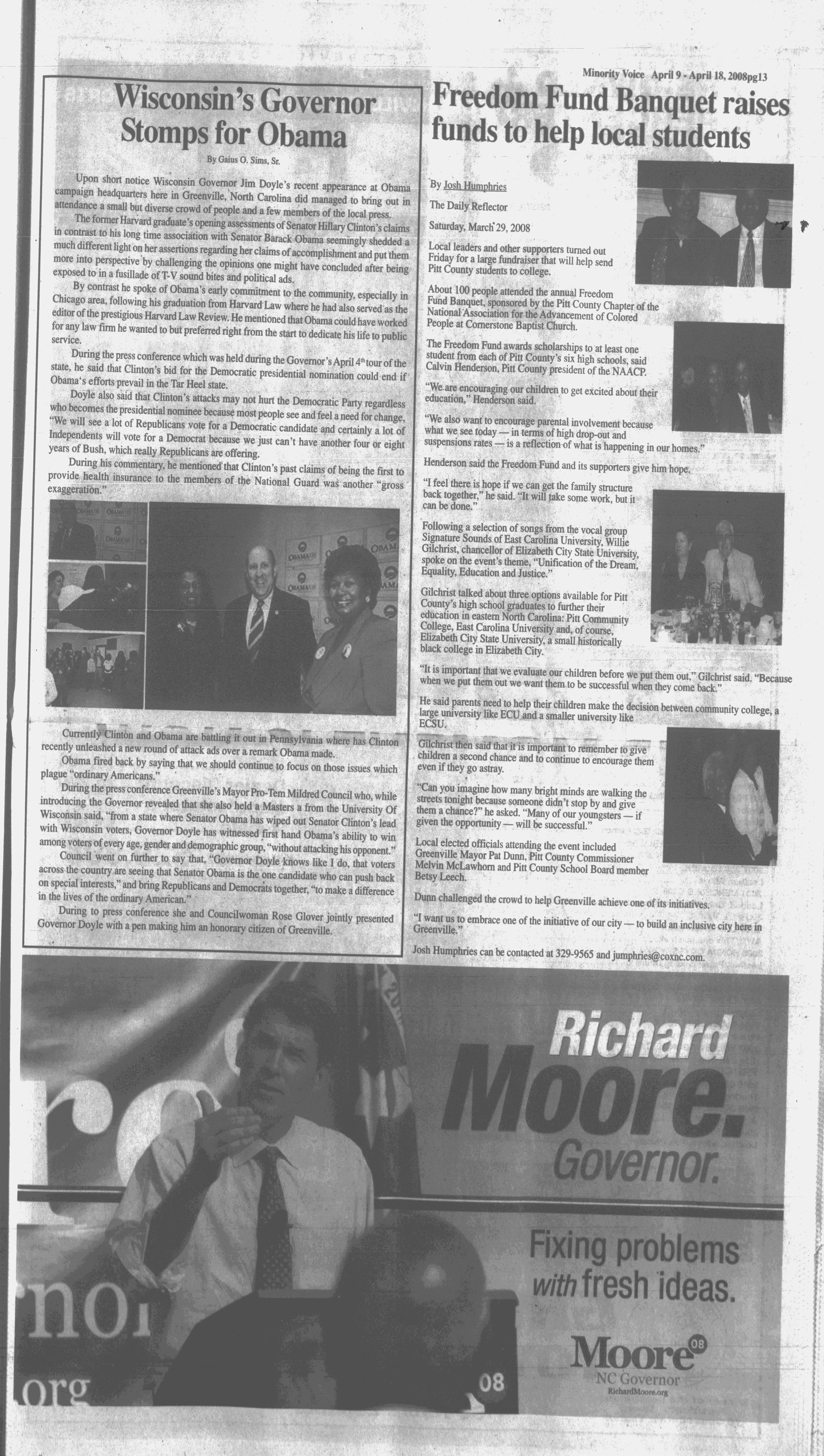 The 'M' voice : Eastern North Carolina's minority voice-since 1987. Greenville. N.C. : Minority Voice, inc. James Rouse, Jr. (1942-2017), began publication of The "M" Voice in 1987 with monthly issues published intermittently until 2010. At different times, the paper was also published as The "M"inority Voice and The Minority Voice. It focused on the Black community in Eastern North Carolina.