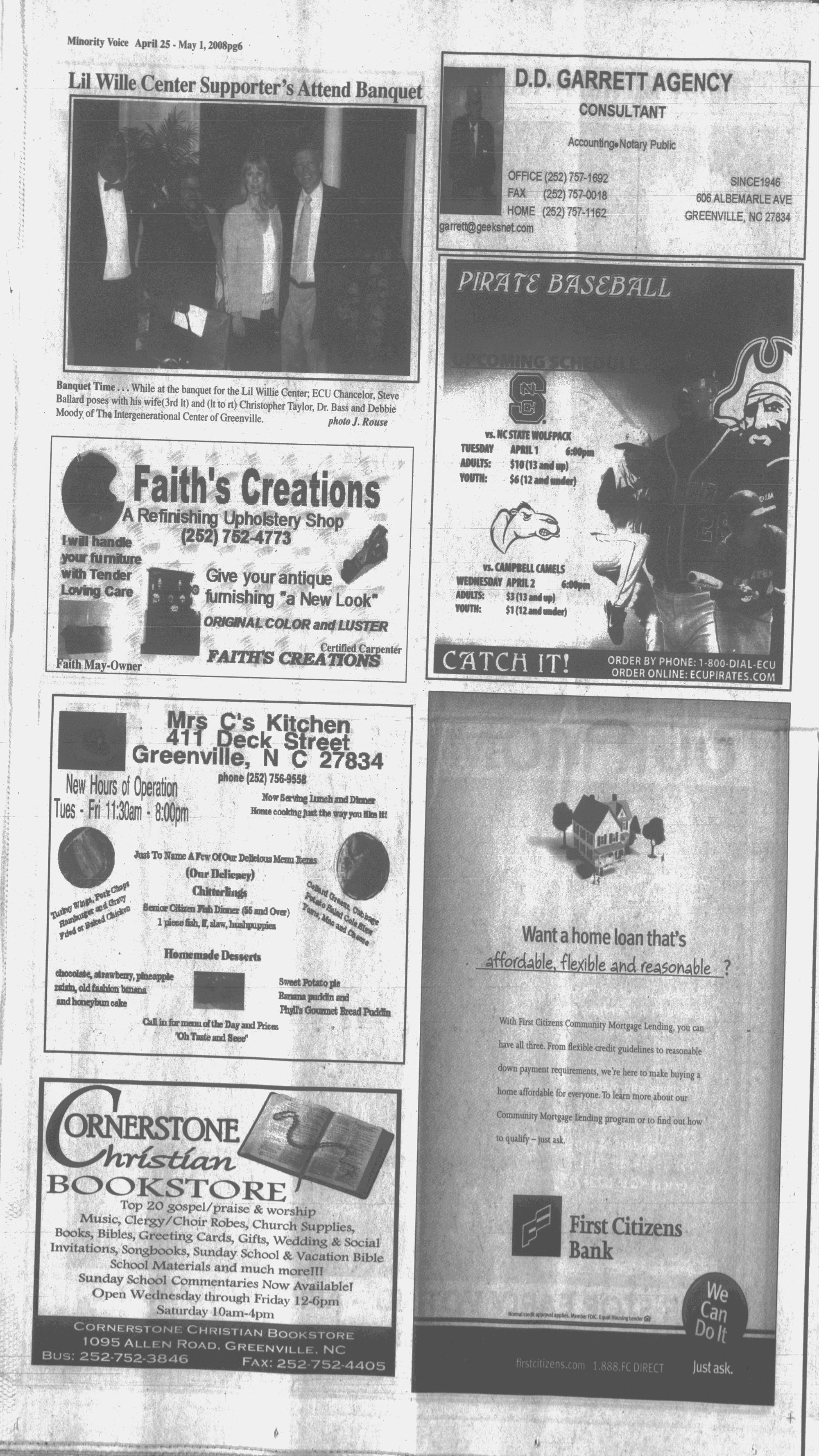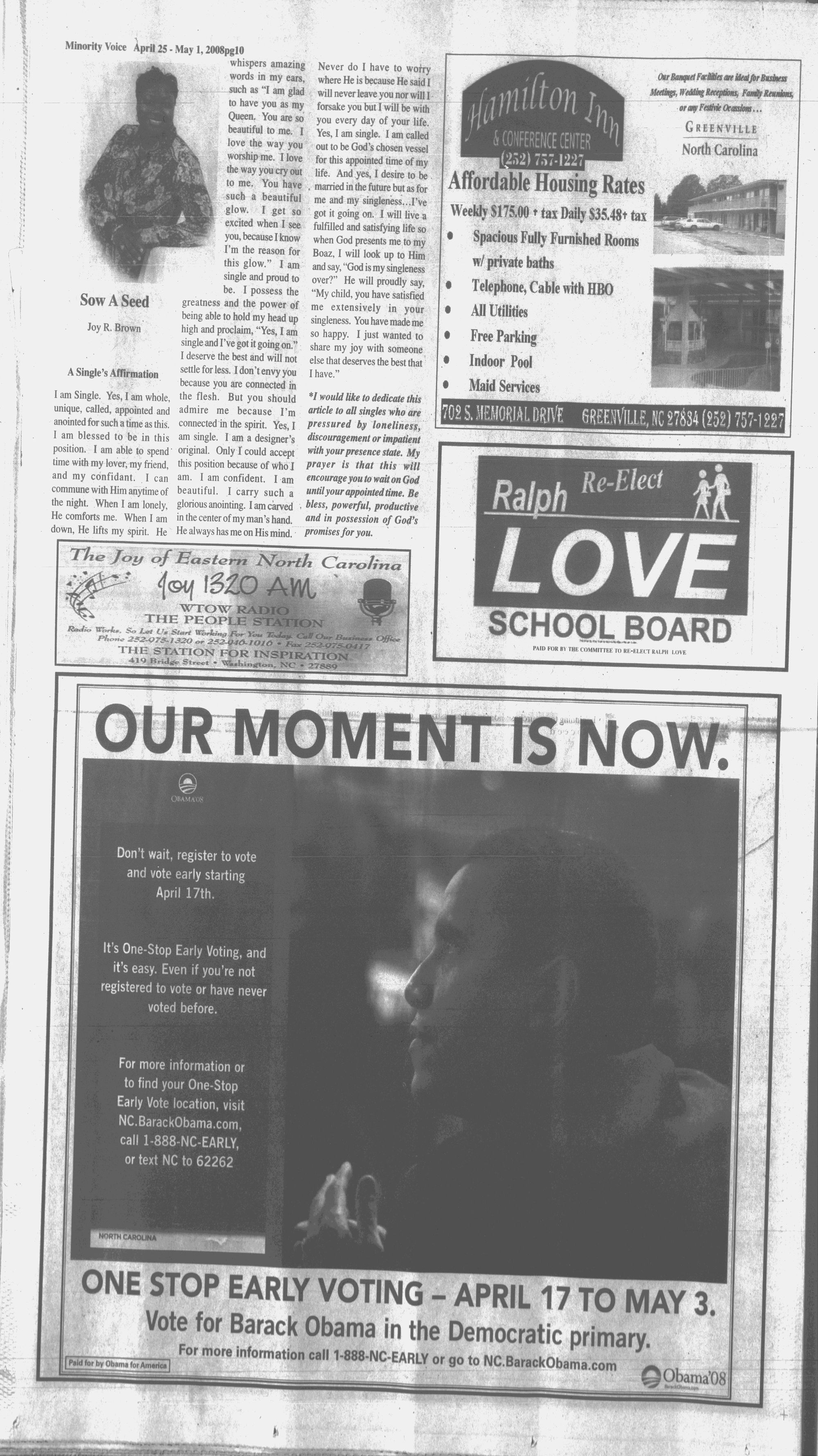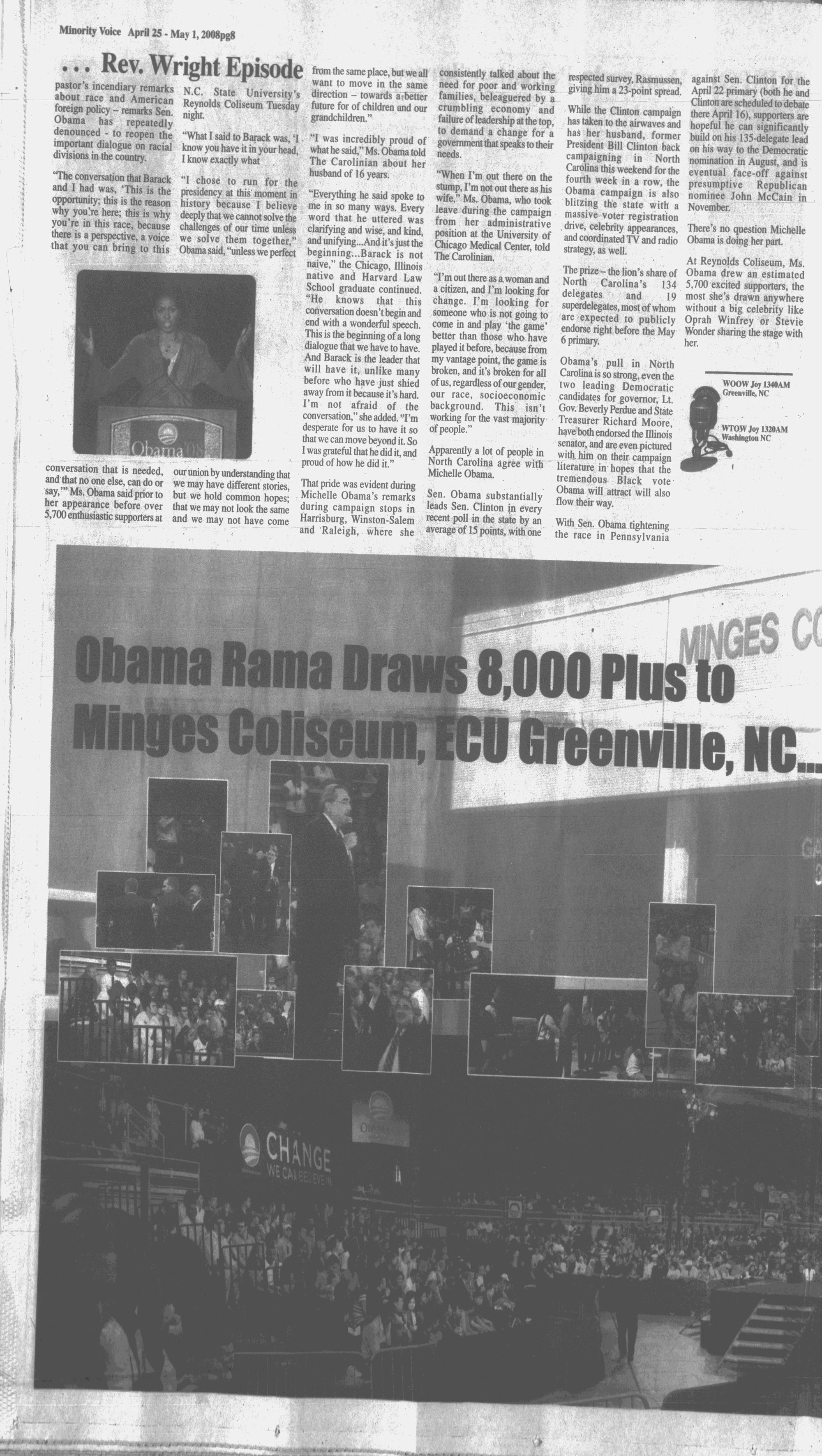 The 'M' voice : Eastern North Carolina's minority voice-since 1987. Greenville. N.C. : Minority Voice, inc. James Rouse, Jr. (1942-2017), began publication of The "M" Voice in 1987 with monthly issues published intermittently until 2010. At different times, the paper was also published as The "M"inority Voice and The Minority Voice. It focused on the Black community in Eastern North Carolina. Pages not displaying for this online item were missing from the original microfilm and could not be digitized.