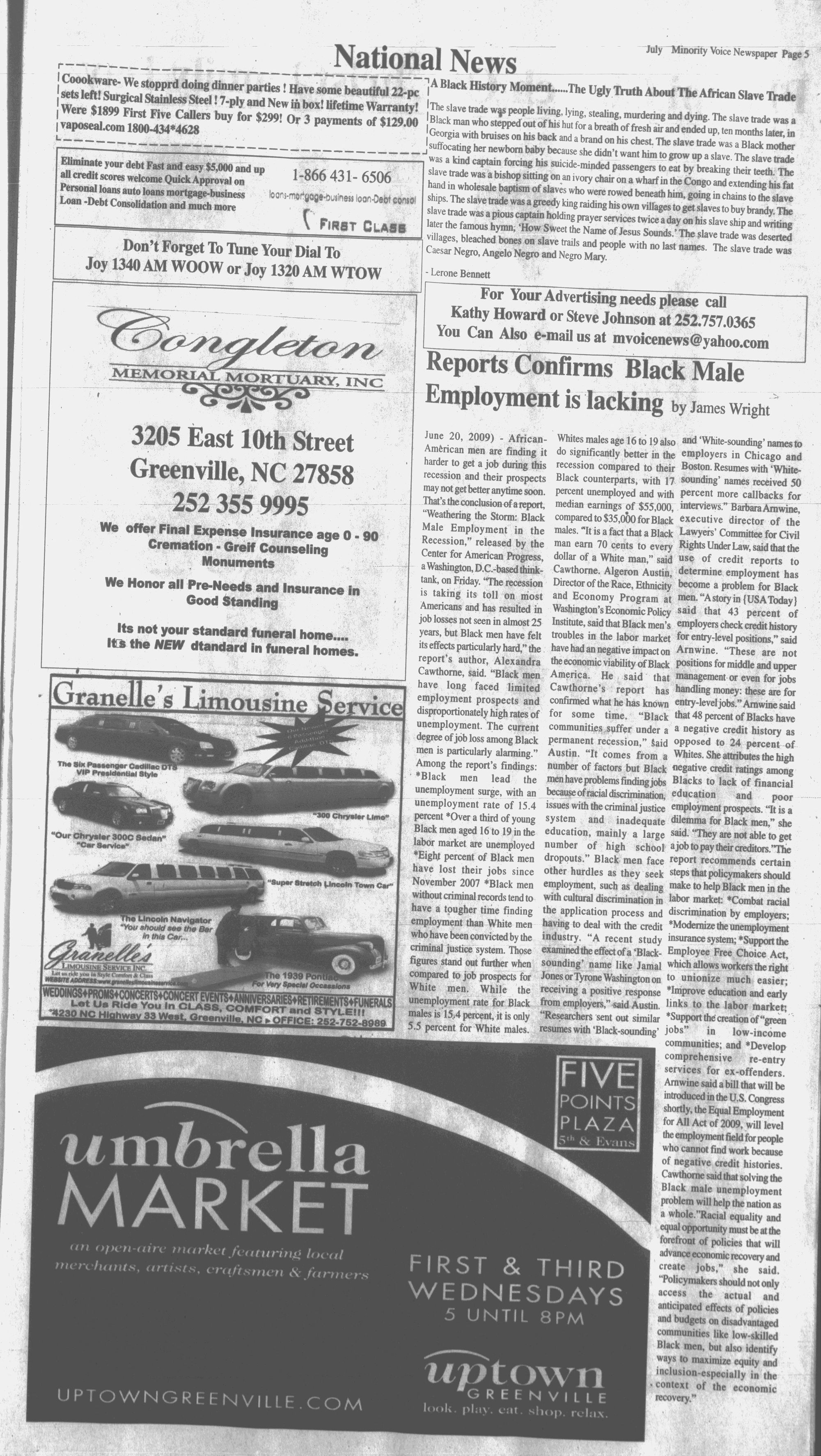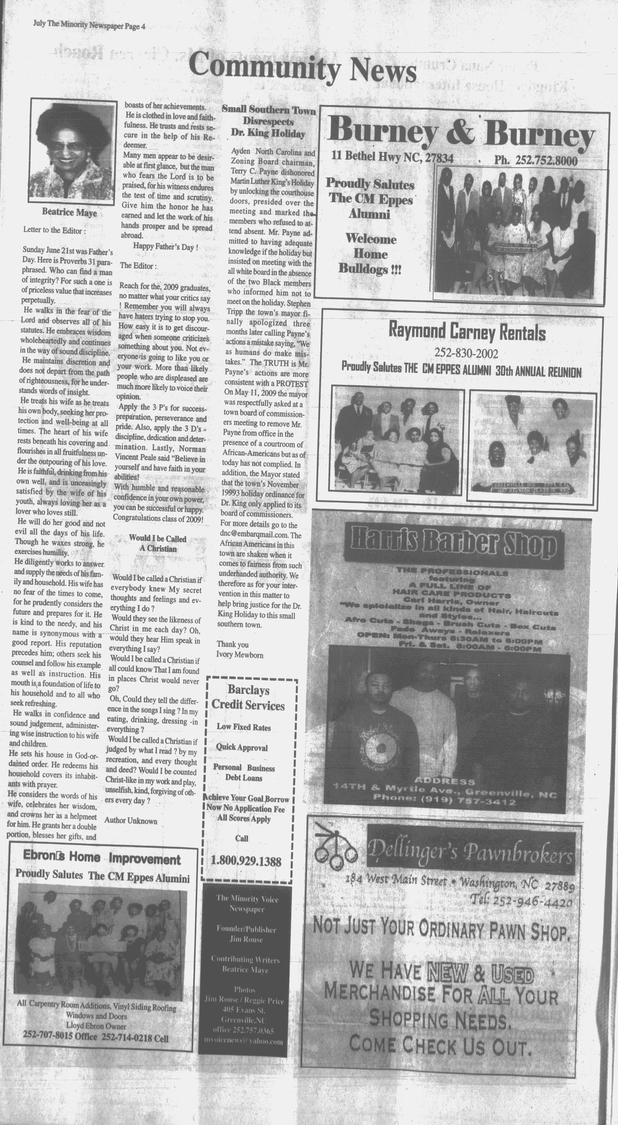 The 'M' voice : Eastern North Carolina's minority voice-since 1987. Greenville. N.C. : Minority Voice, inc. James Rouse, Jr. (1942-2017), began publication of The "M" Voice in 1987 with monthly issues published intermittently until 2010. At different times, the paper was also published as The "M"inority Voice and The Minority Voice. It focused on the Black community in Eastern North Carolina.