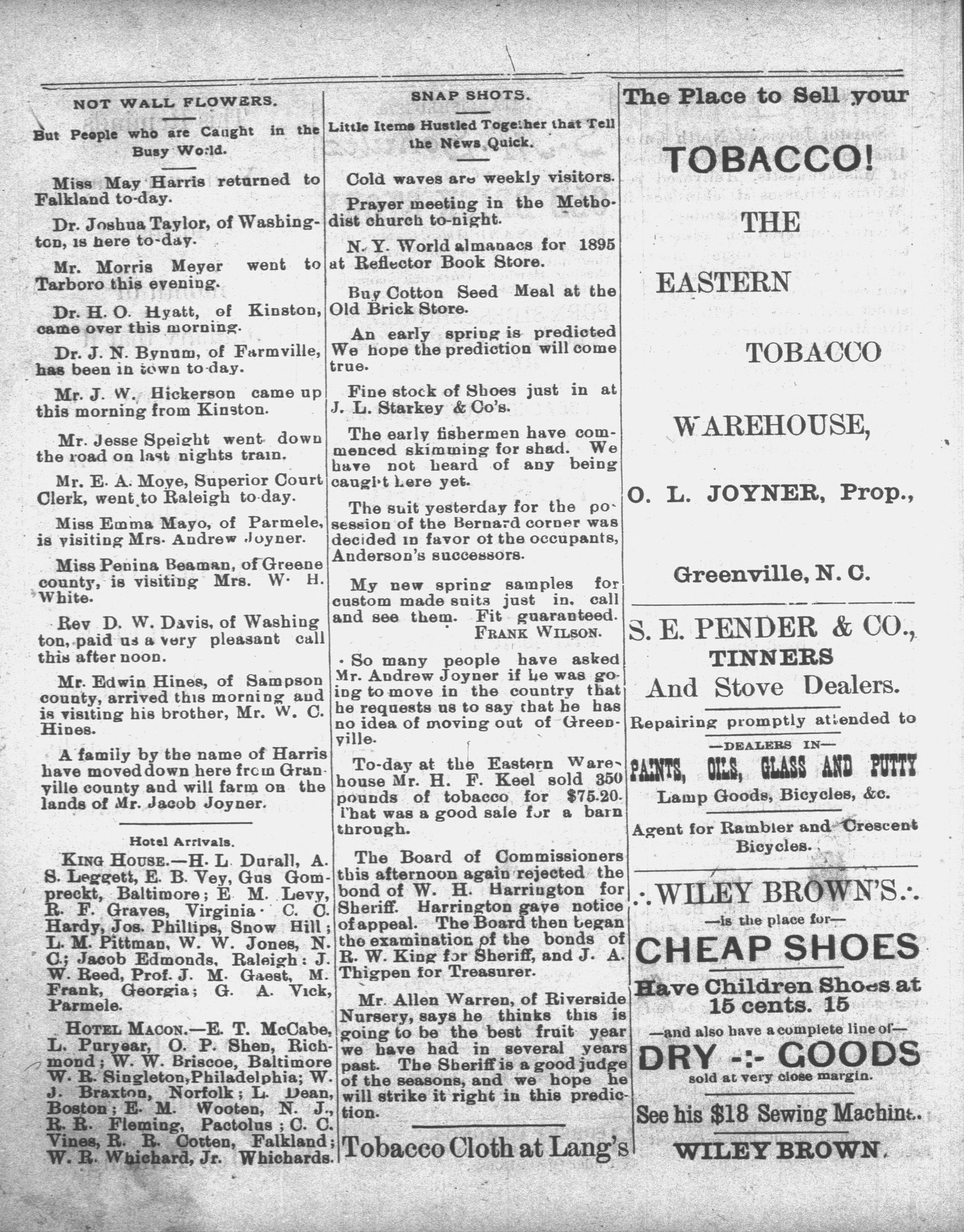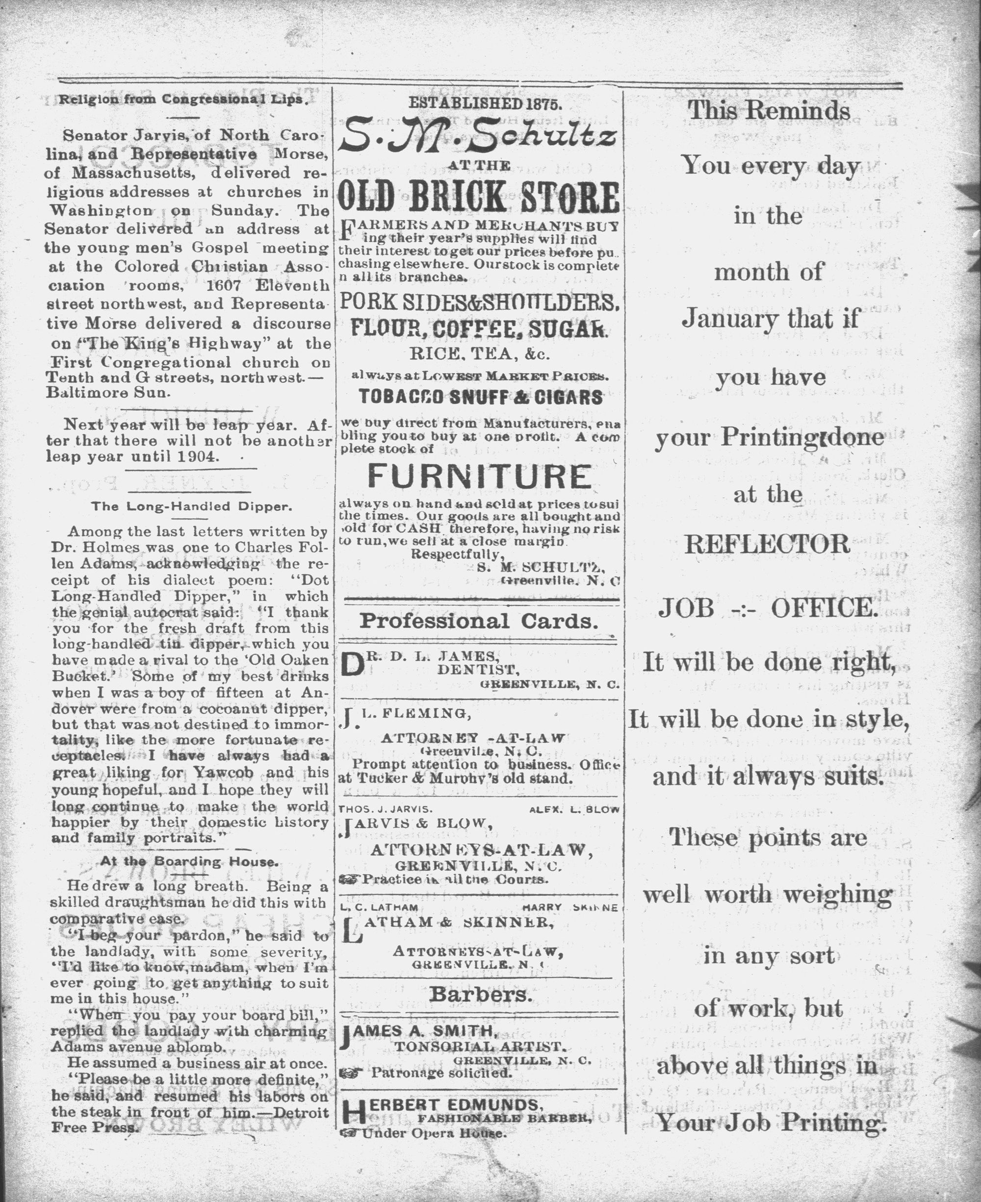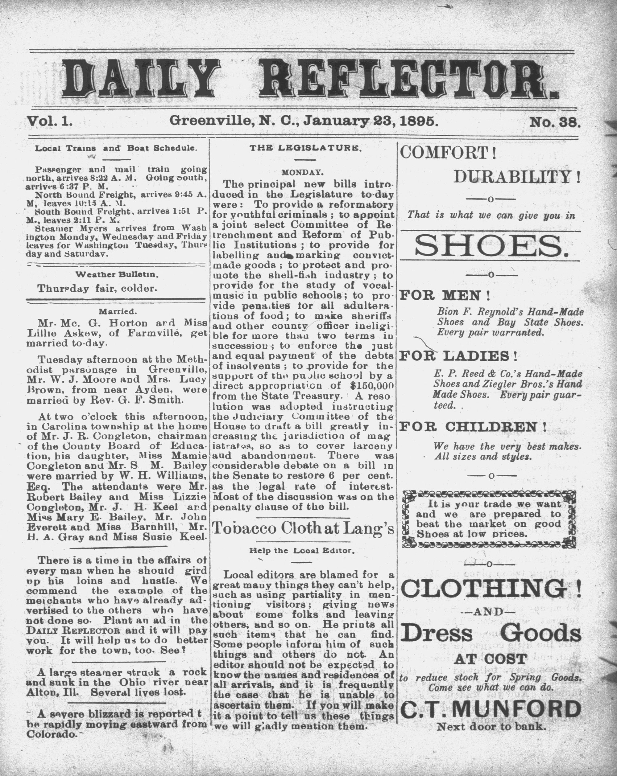 The newspaper was established in 1882, and was originally named the Eastern Reflector. It was founded by Julian Whichard and David Jordan with equipment they purchased from The Greenville Express. On December 10, 1894, it adopted the name The Reflector and began publishing every day. Cox Newspapers acquired The Daily Reflector in 1996. Creator: Daily Reflector (Greenville, N.C.) - January 23, 1895
