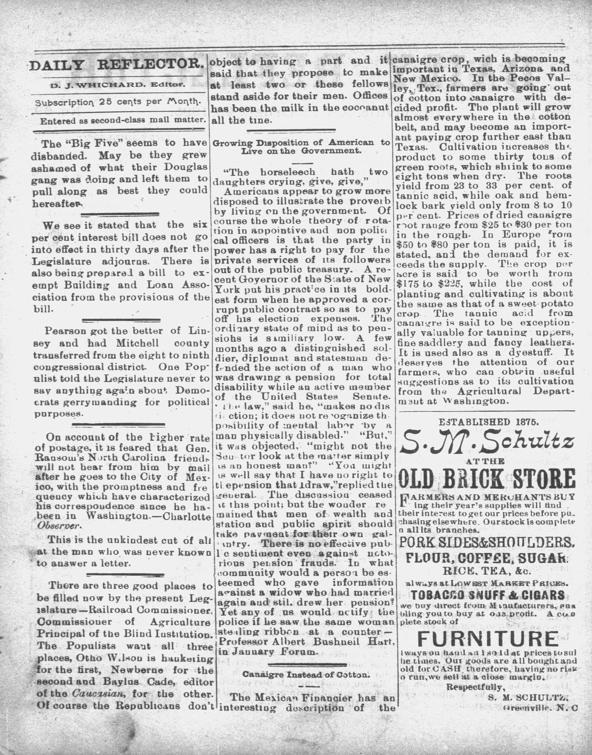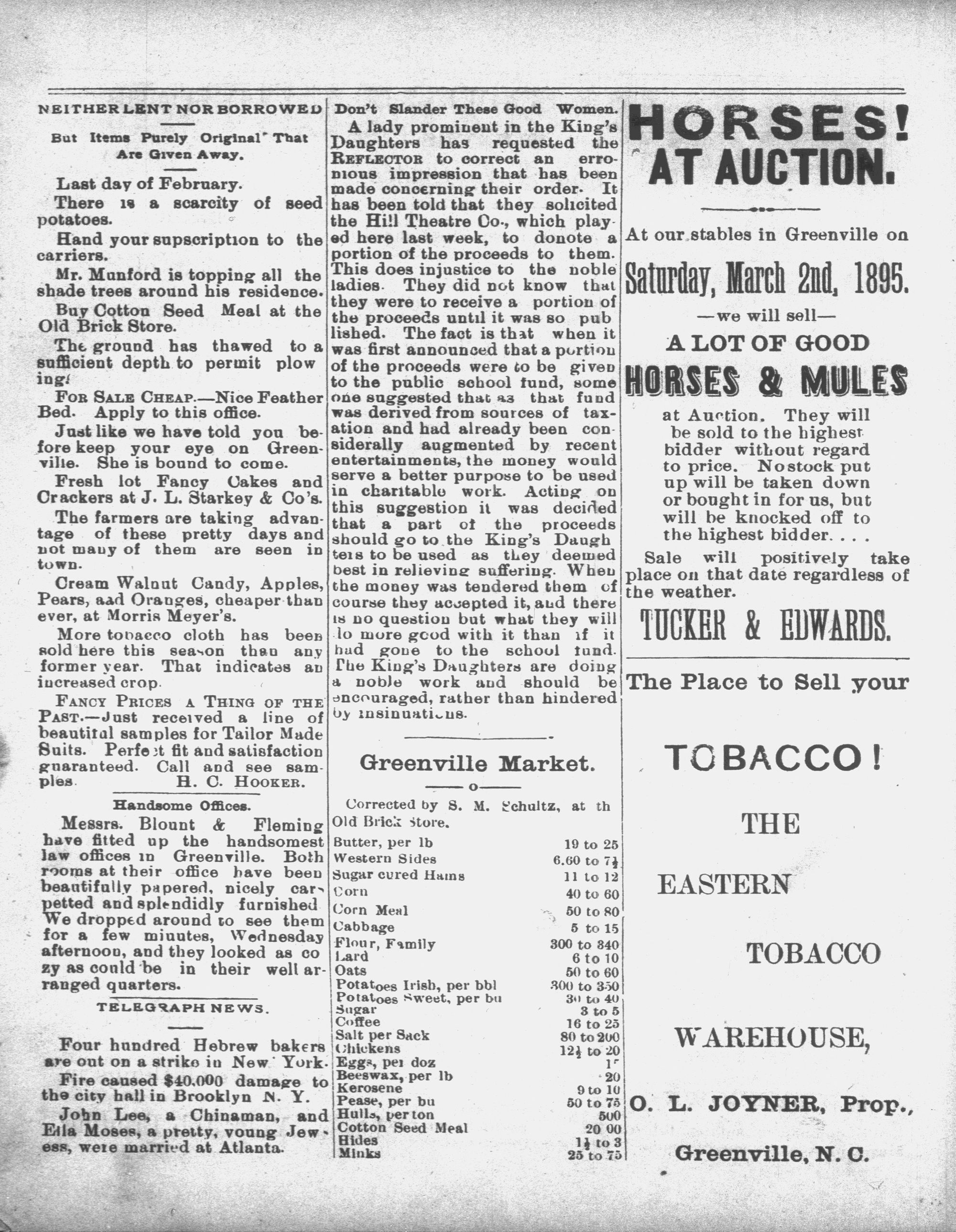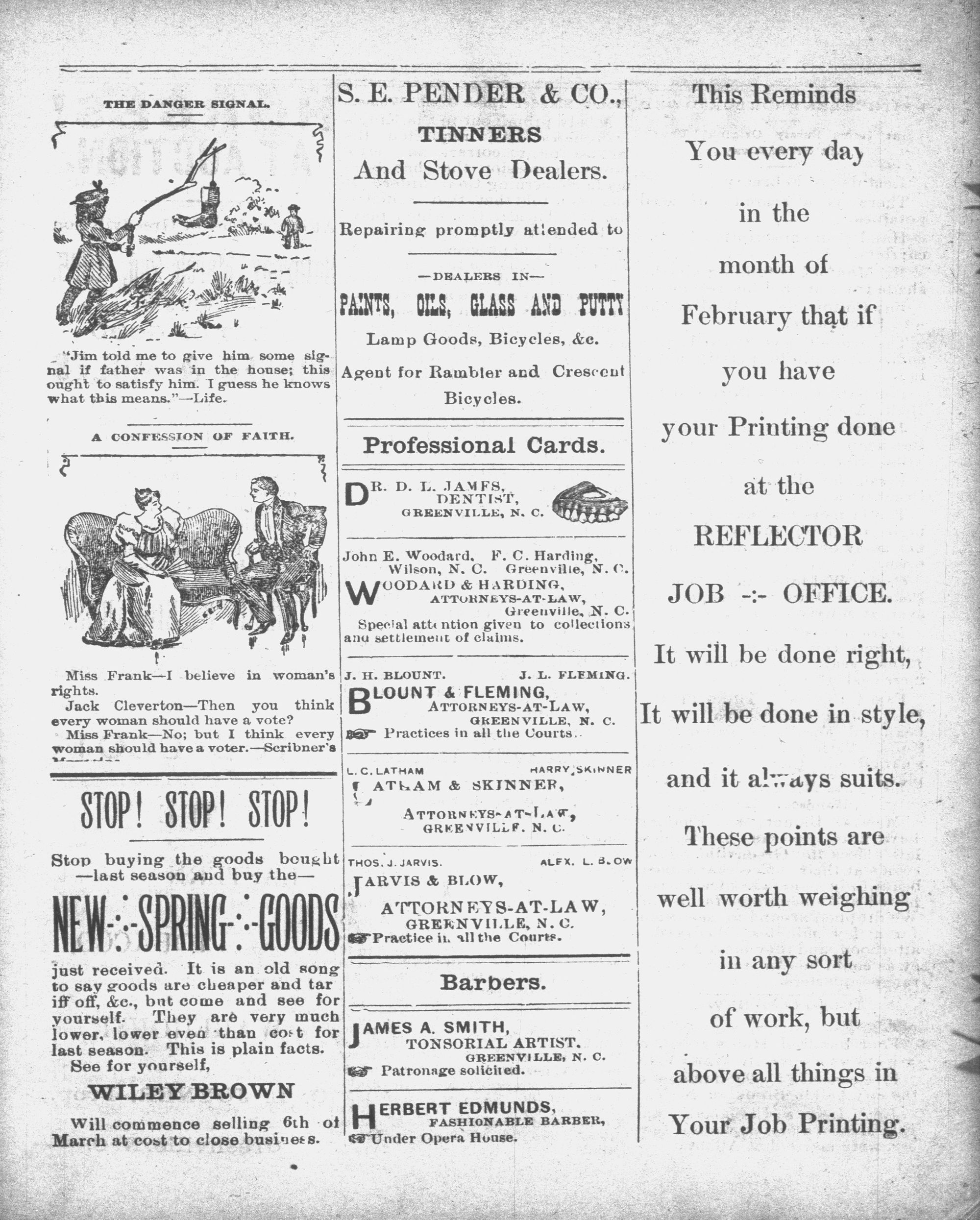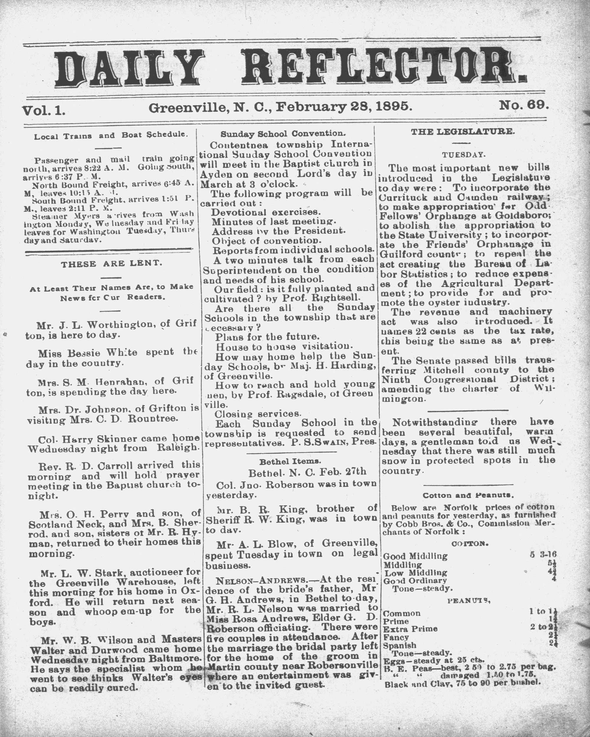 The newspaper was established in 1882, and was originally named the Eastern Reflector. It was founded by Julian Whichard and David Jordan with equipment they purchased from The Greenville Express. On December 10, 1894, it adopted the name The Reflector and began publishing every day. Cox Newspapers acquired The Daily Reflector in 1996. Creator: Daily Reflector (Greenville, N.C.) - February 28, 1895
