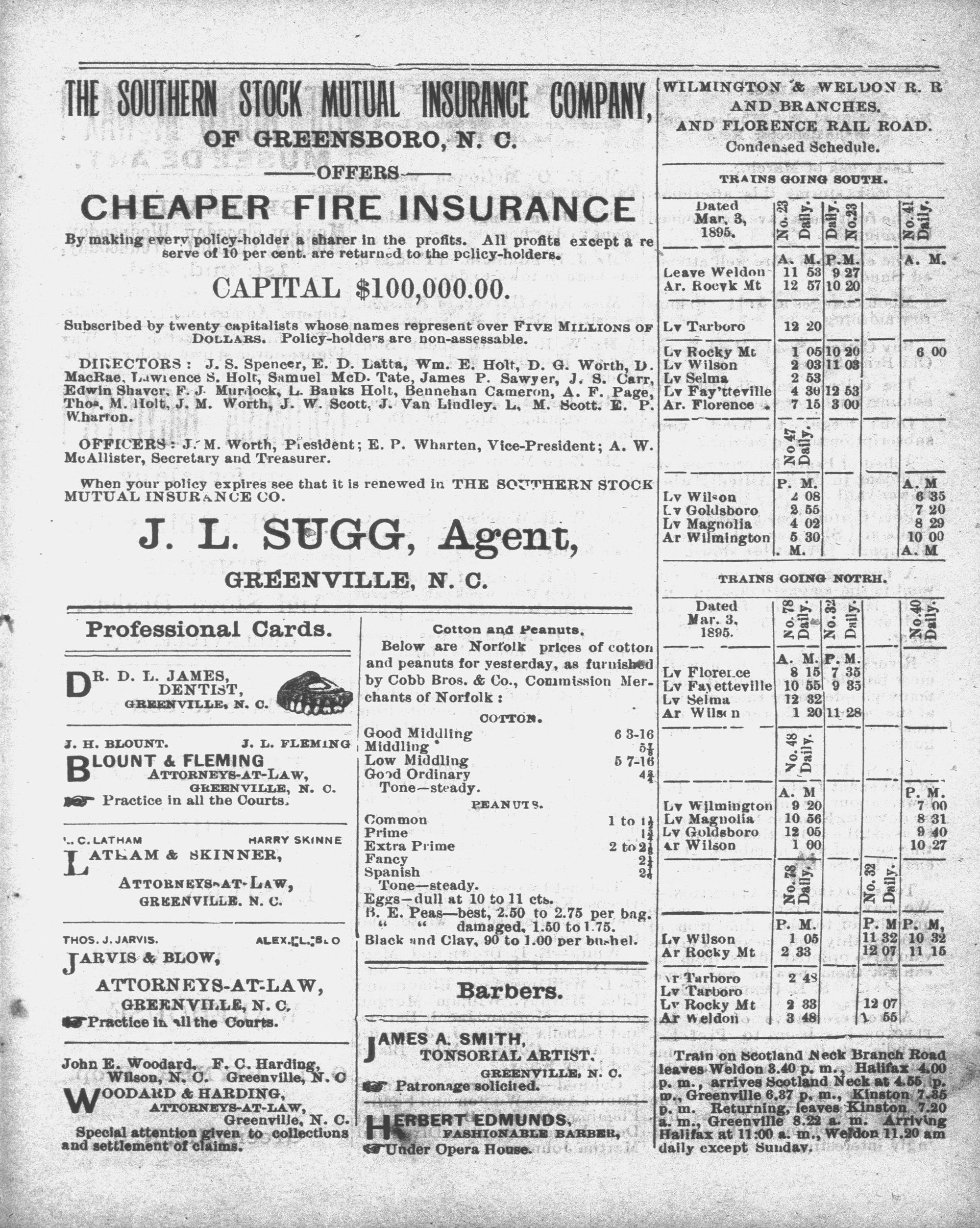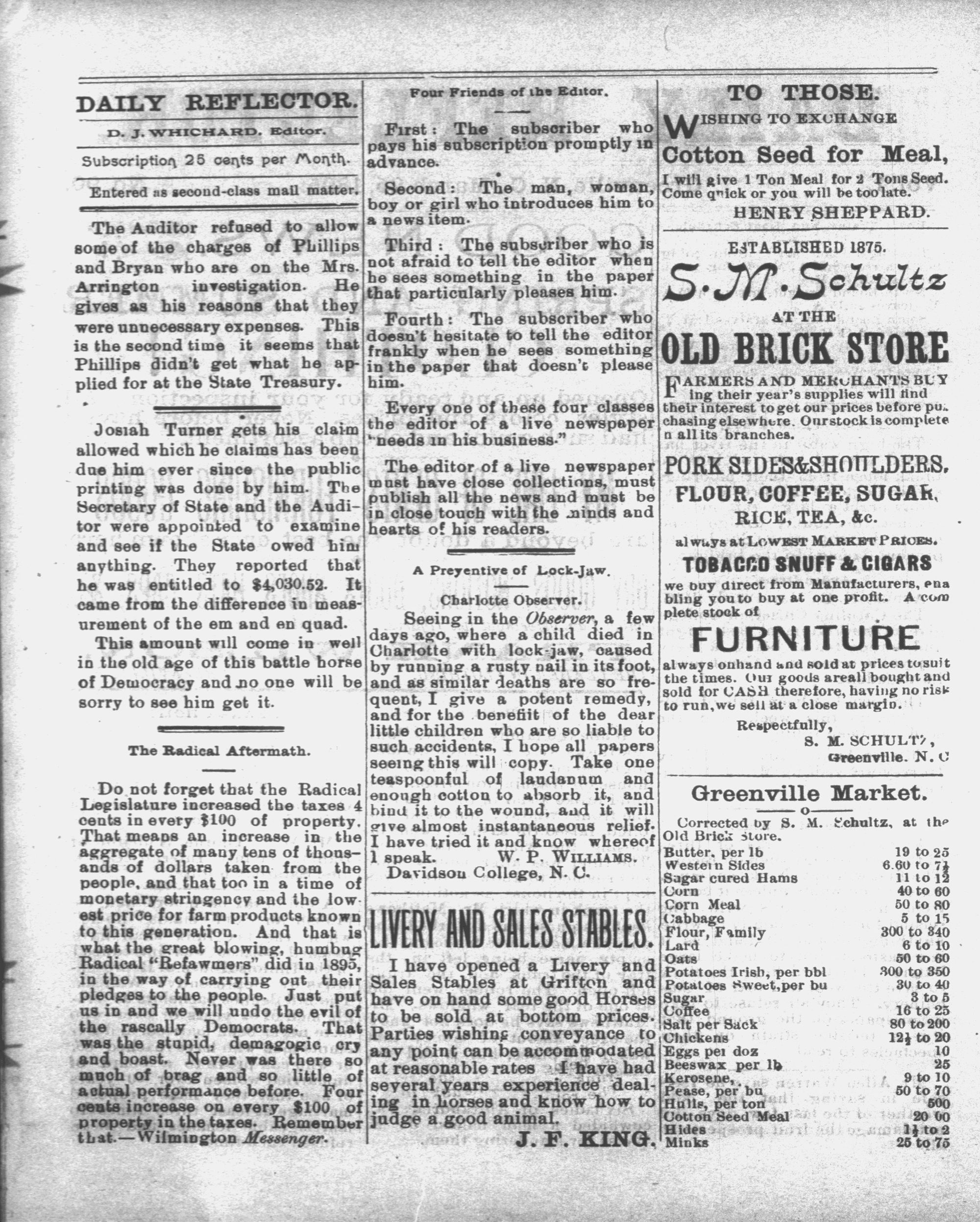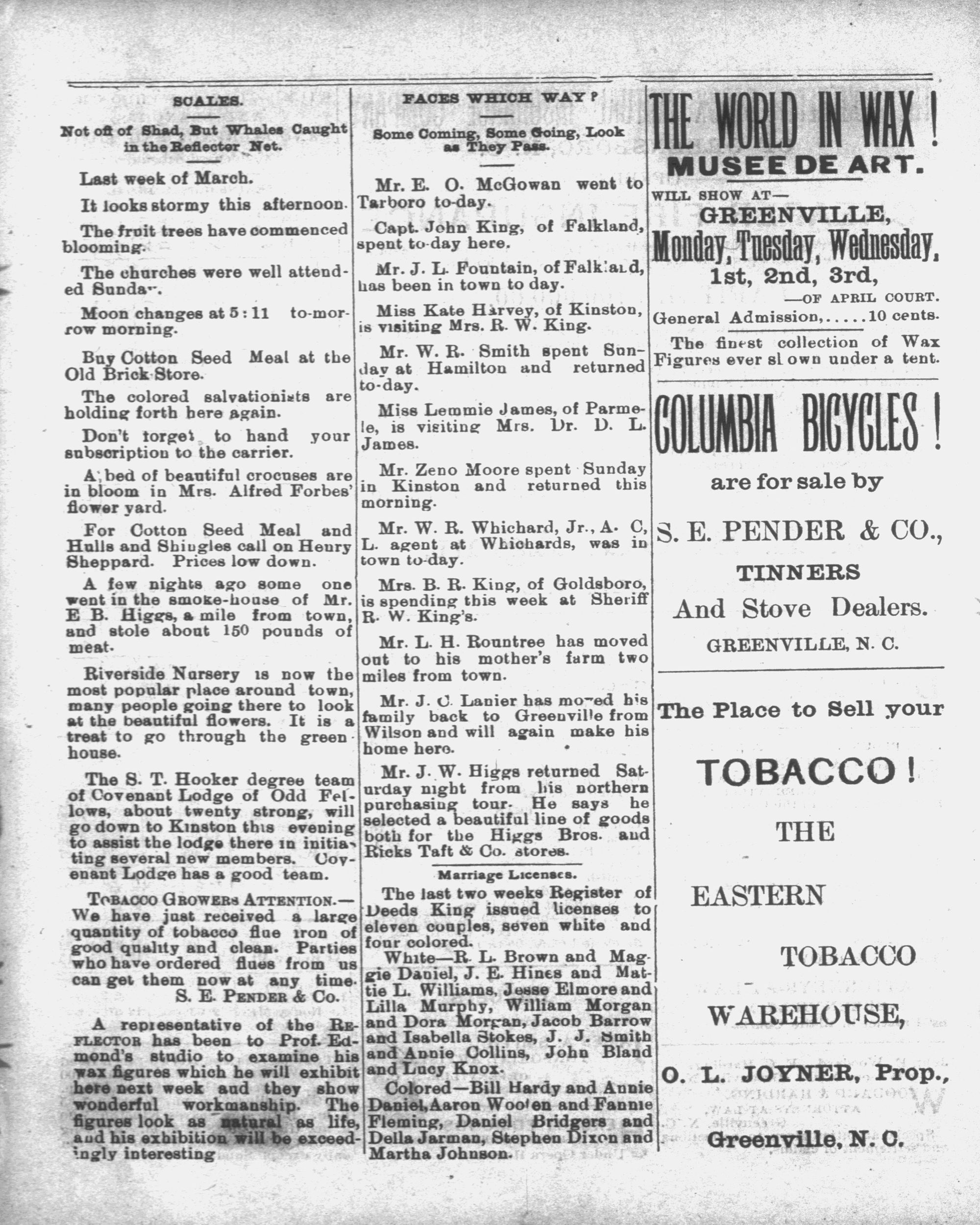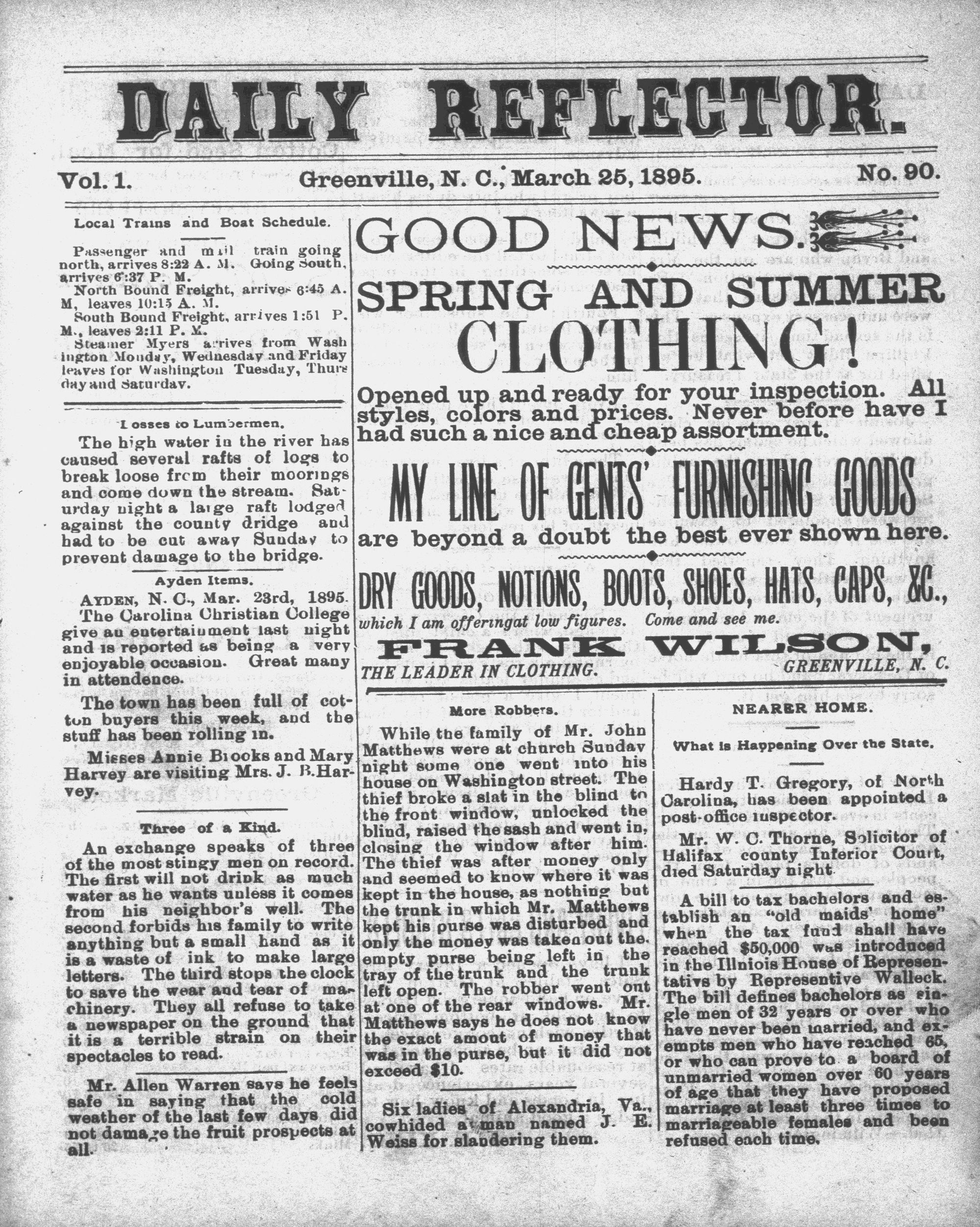 The newspaper was established in 1882, and was originally named the Eastern Reflector. It was founded by Julian Whichard and David Jordan with equipment they purchased from The Greenville Express. On December 10, 1894, it adopted the name The Reflector and began publishing every day. Cox Newspapers acquired The Daily Reflector in 1996. Creator: Daily Reflector (Greenville, N.C.) - March 25, 1895