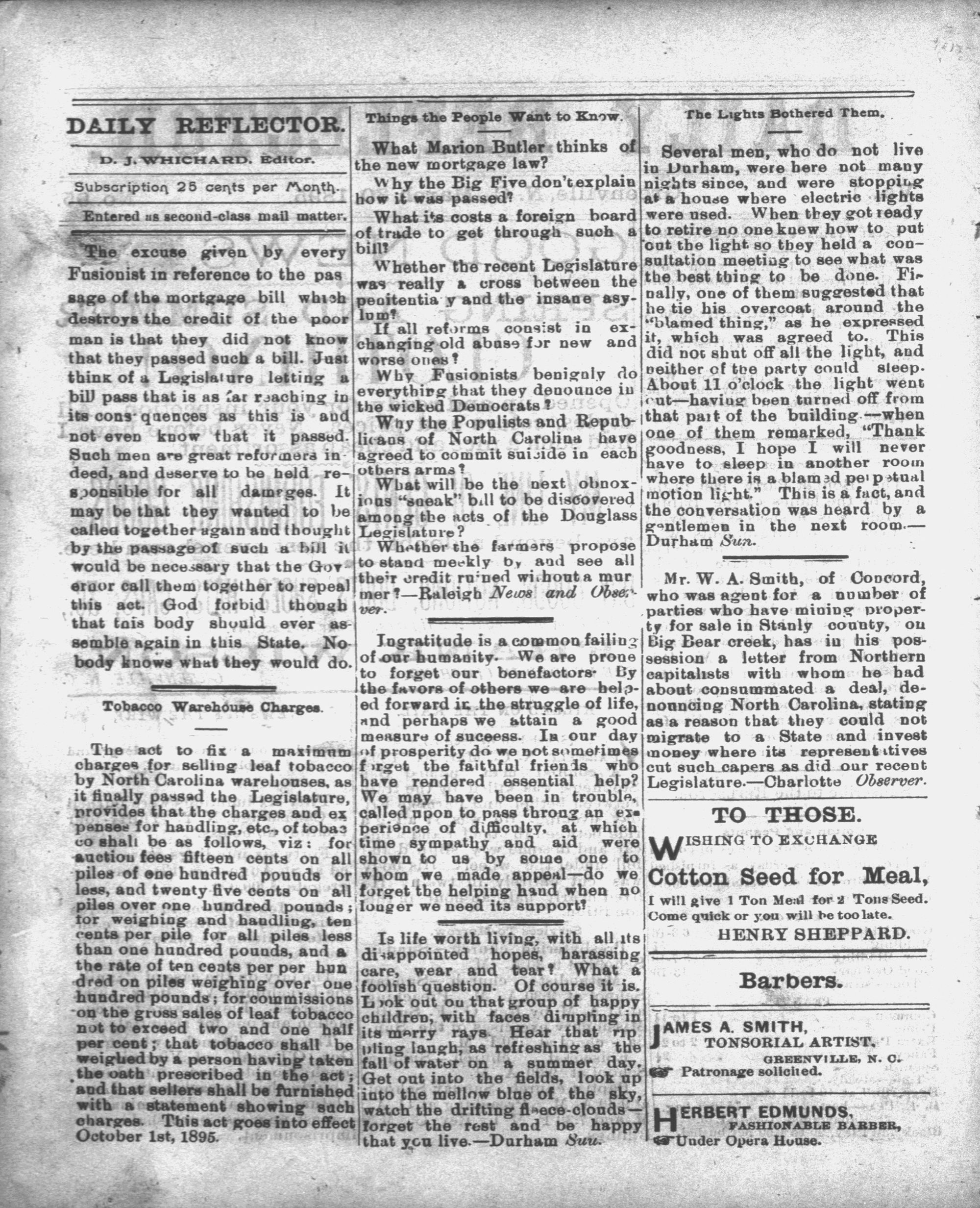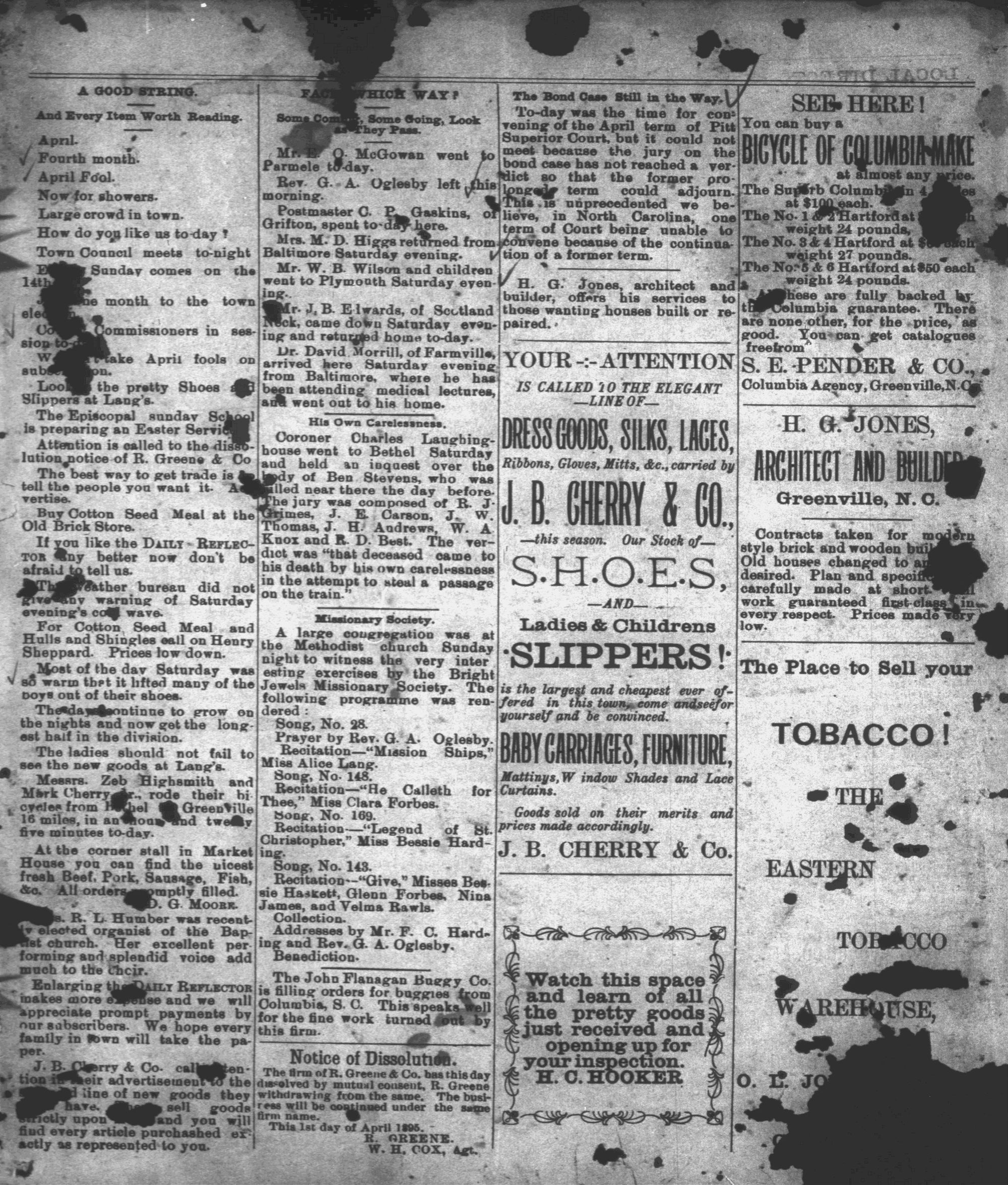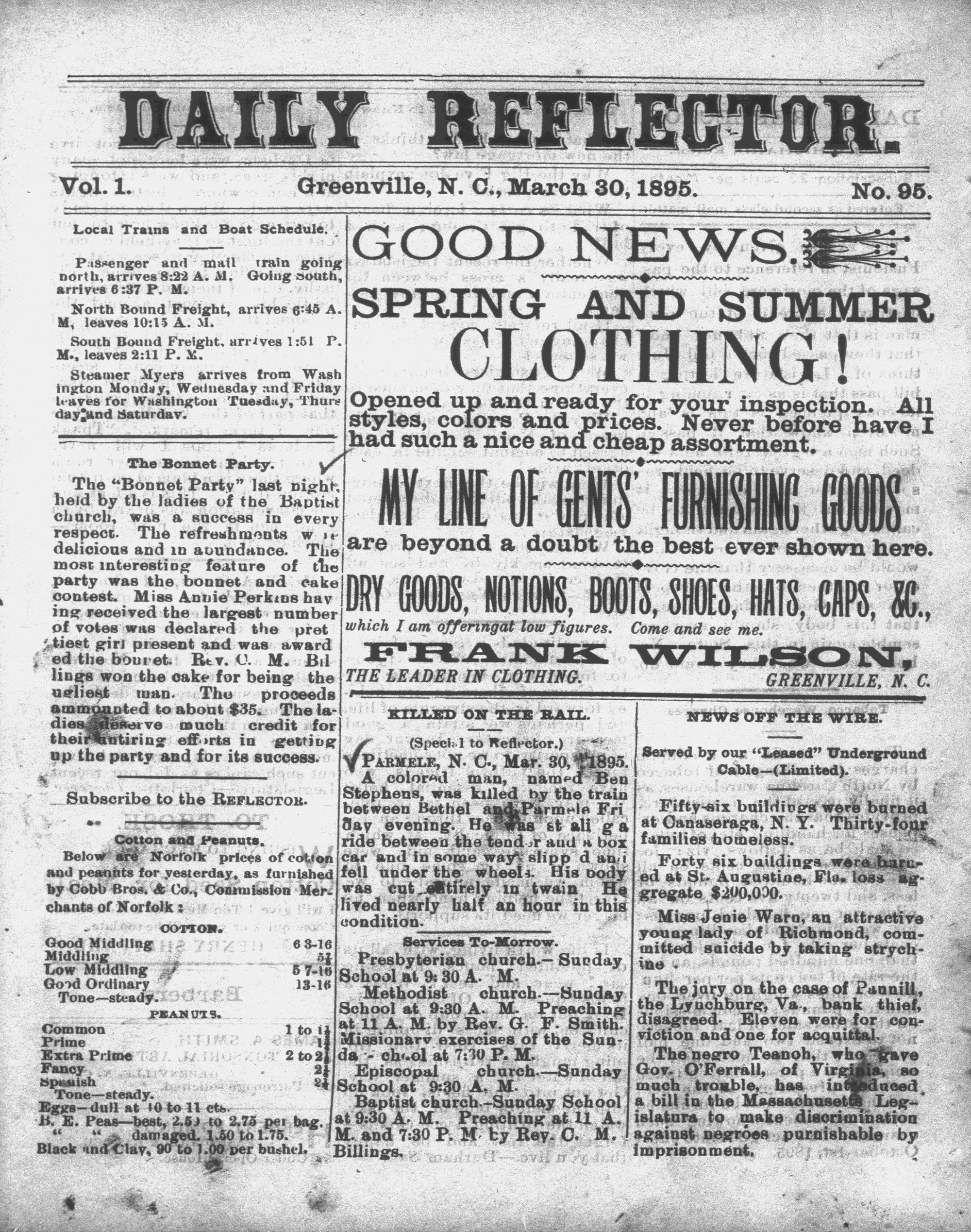 The newspaper was established in 1882, and was originally named the Eastern Reflector. It was founded by Julian Whichard and David Jordan with equipment they purchased from The Greenville Express. On December 10, 1894, it adopted the name The Reflector and began publishing every day. Cox Newspapers acquired The Daily Reflector in 1996. Creator: Daily Reflector (Greenville, N.C.) - March 30, 1895