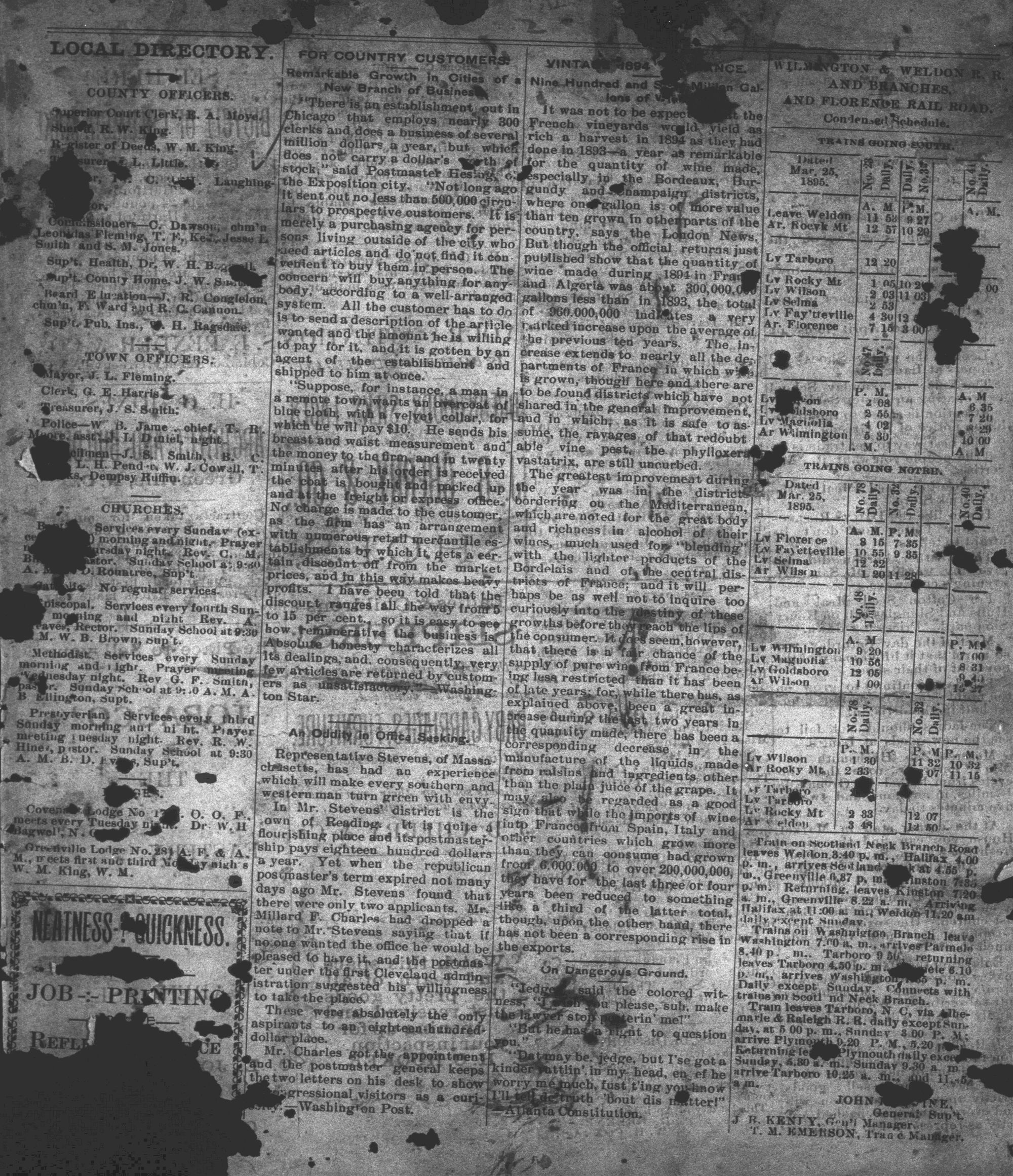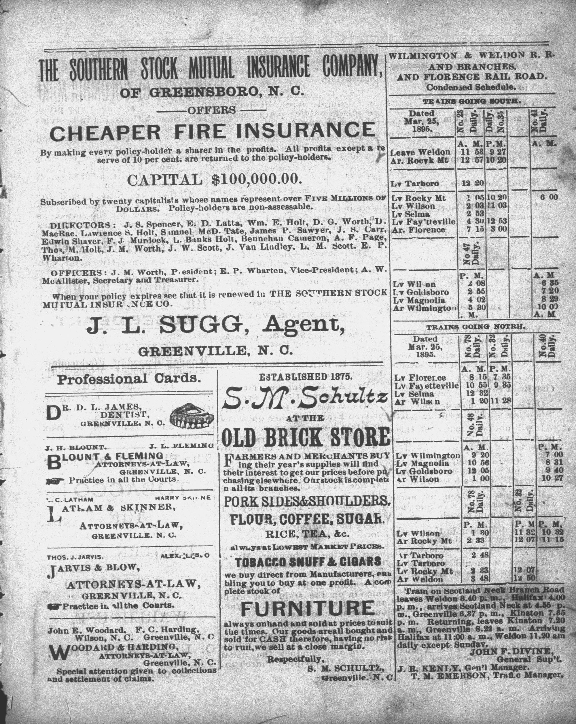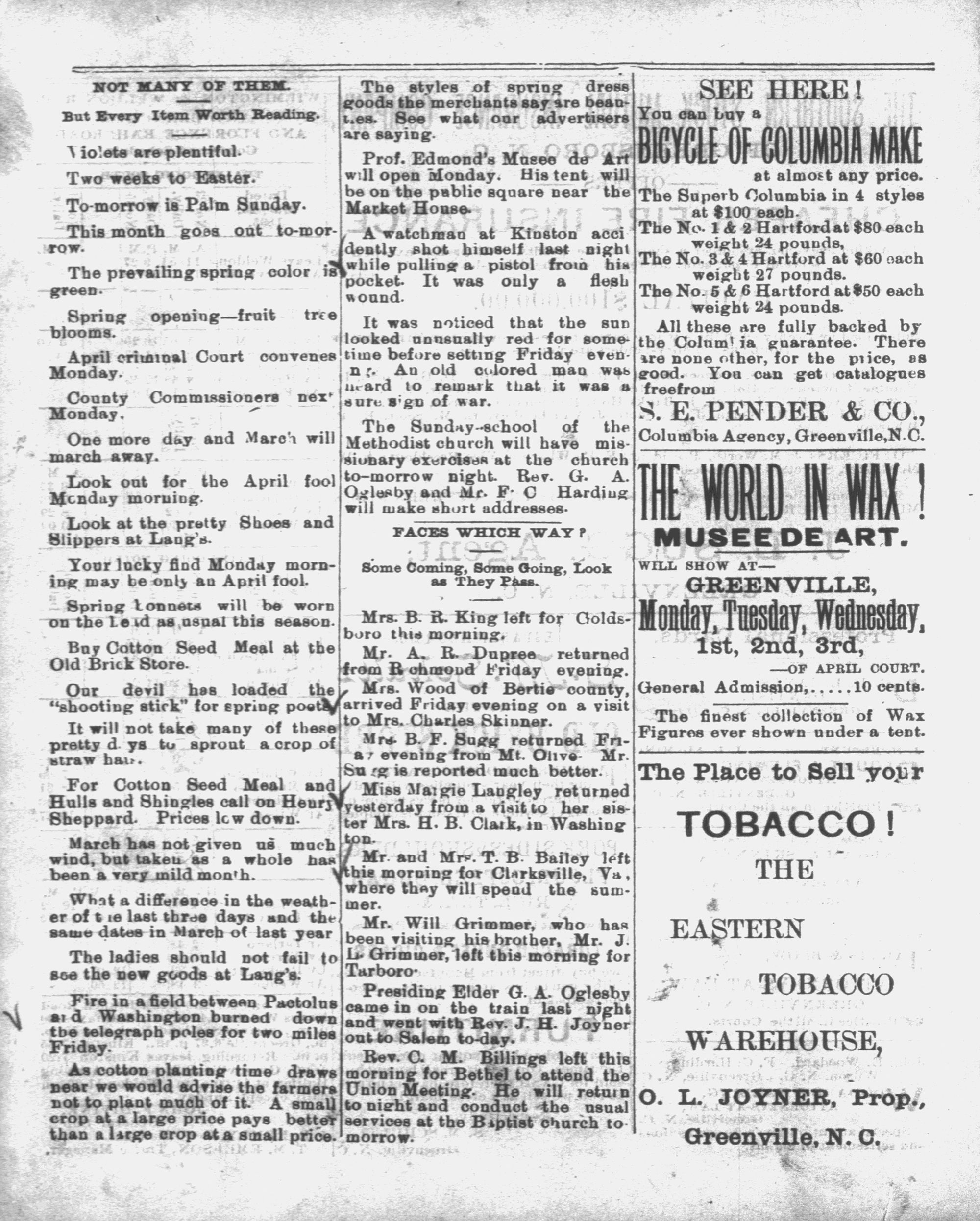 The newspaper was established in 1882, and was originally named the Eastern Reflector. It was founded by Julian Whichard and David Jordan with equipment they purchased from The Greenville Express. On December 10, 1894, it adopted the name The Reflector and began publishing every day. Cox Newspapers acquired The Daily Reflector in 1996. Creator: Daily Reflector (Greenville, N.C.) - March 30, 1895